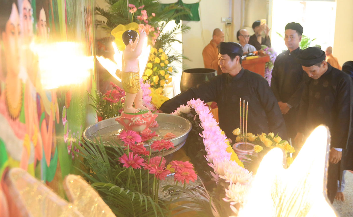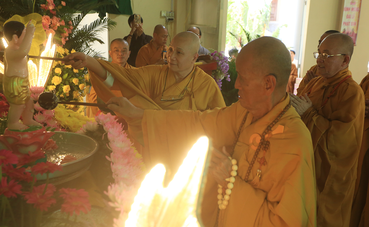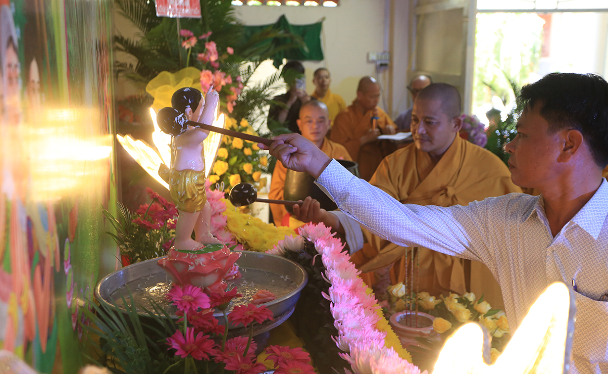 Sau lễ hành chánh là nghi thức tâm linh, Đại chúng một lòng cung kính hướng về kim tướng sơ sanh của Đức Phật, chư Tôn Trưởng lão Hòa thượng cùng chư Tôn đức giáo phẩm chứng minh tiến lên lễ đài dâng hương cúng dường, đảnh lễ tri ân bậc Giác ngộ toàn năng, tôn vinh những lời dạy minh triết của Đức Phật để lại cho cuộc đời. Chư Tôn đức Tăng, Ni cùng toàn thể hội chúng đã trang nghiêm cử hành lễ Mộc Dục. Tăng Ni, Phật tử dùng nước thơm tưới lên cho kim thân sơ sanh của Phật.