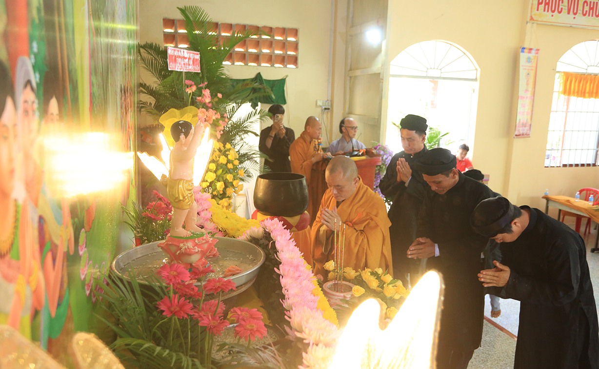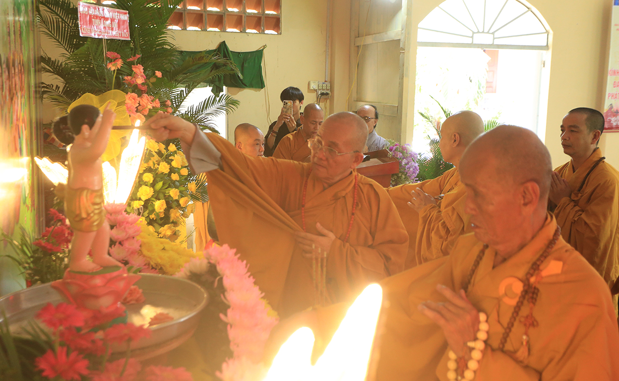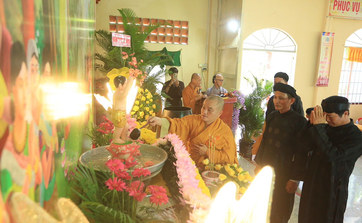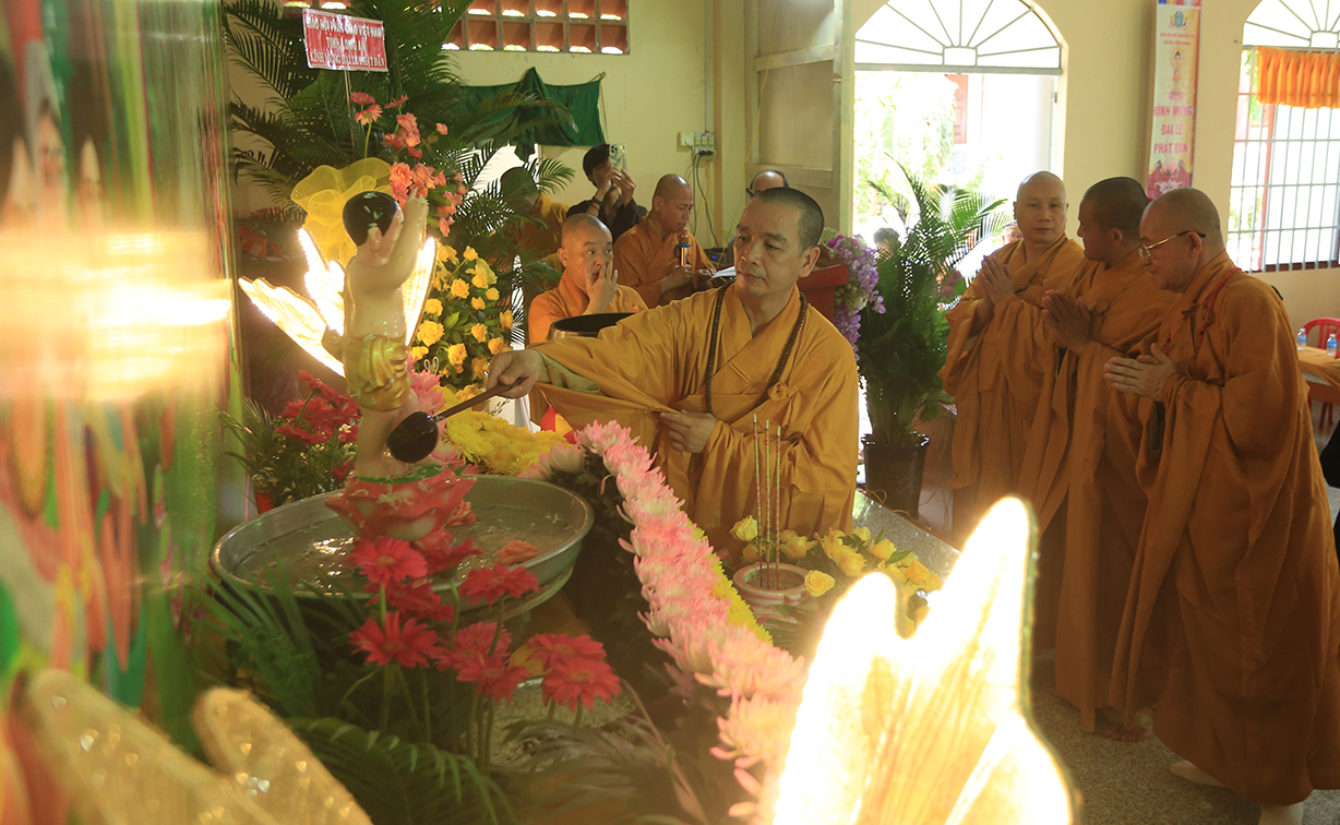 Sau lễ hành chánh là nghi thức tâm linh, Đại chúng một lòng cung kính hướng về kim tướng sơ sanh của Đức Phật, chư Tôn Trưởng lão Hòa thượng cùng chư Tôn đức giáo phẩm chứng minh tiến lên lễ đài dâng hương cúng dường, đảnh lễ tri ân bậc Giác ngộ toàn năng, tôn vinh những lời dạy minh triết của Đức Phật để lại cho cuộc đời. Chư Tôn đức Tăng, Ni cùng toàn thể hội chúng đã trang nghiêm cử hành lễ Mộc Dục. Tăng Ni, Phật tử dùng nước thơm tưới lên cho kim thân sơ sanh của Phật.