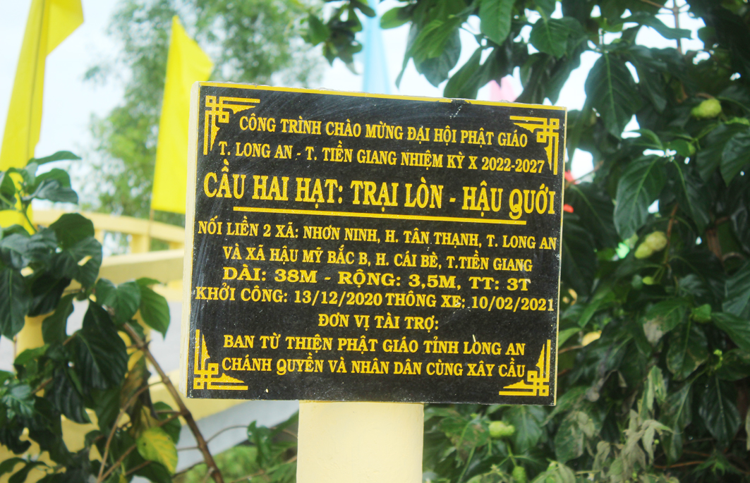 Theo thông tin từ Thượng toạ Thích Lệ Tấn, Hai Hạt – Trại Lòn – Hậu Quới Xã Nhơn Ninh – Huyện Tân Thạnh nối liền 2 xã Nhơn Ninh huyện Tân Thạnh tỉnh Long An và xã hậu Mỹ Bắc B huyện Cái Bè tỉnh Tiền Giang. Qua thời gian sử dụng cây cầu đã hỏng và xuống cấp trầm trọng. Cầu Hai Hạt – Trại Lòn – Hậu Quới là cây cầu nối liền 2 tỉnh có ý nghĩa quan trọng trong việc đi lại, giao thương và giao lưu văn hóa giữ các vùng. Biết được tình hình này Ban từ Thiện xã hội GHPGVN tỉnh các bộ ban ngành, chính quyền địa phương và bà con nhân dân đã chung tay xây dựng cây cầu mới đem lại lợi ích thiết thực cho người dân nơi đây. Sau 1 năm thi công cây cầu đã được khánh thành và đưa vào sử dụng trong niềm vui, niềm hân hoan của nhân dân.
