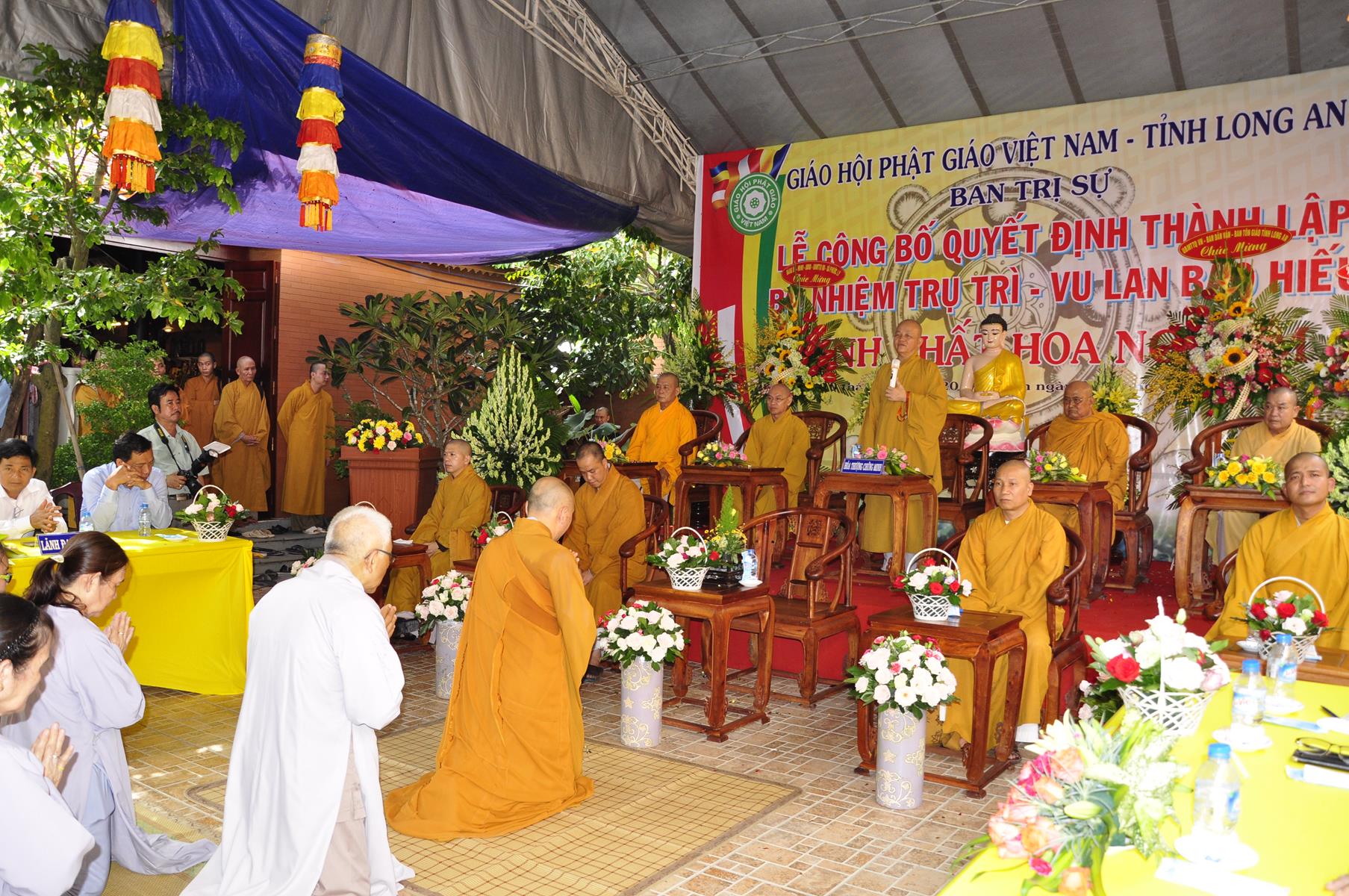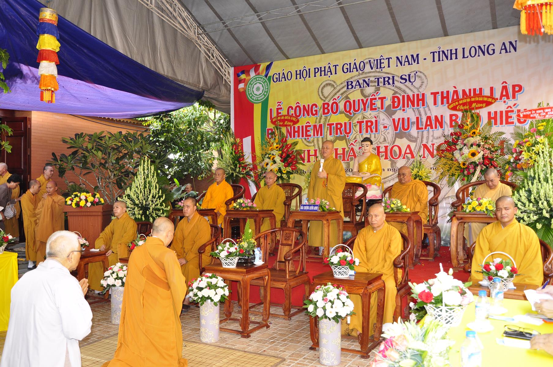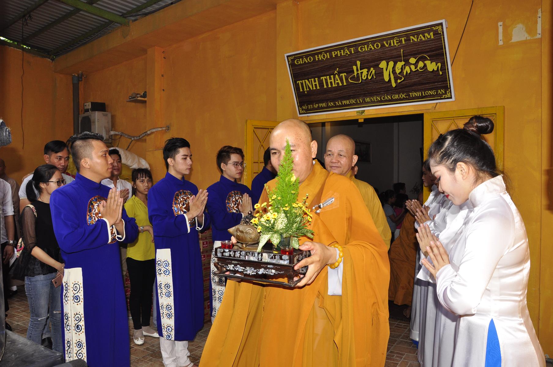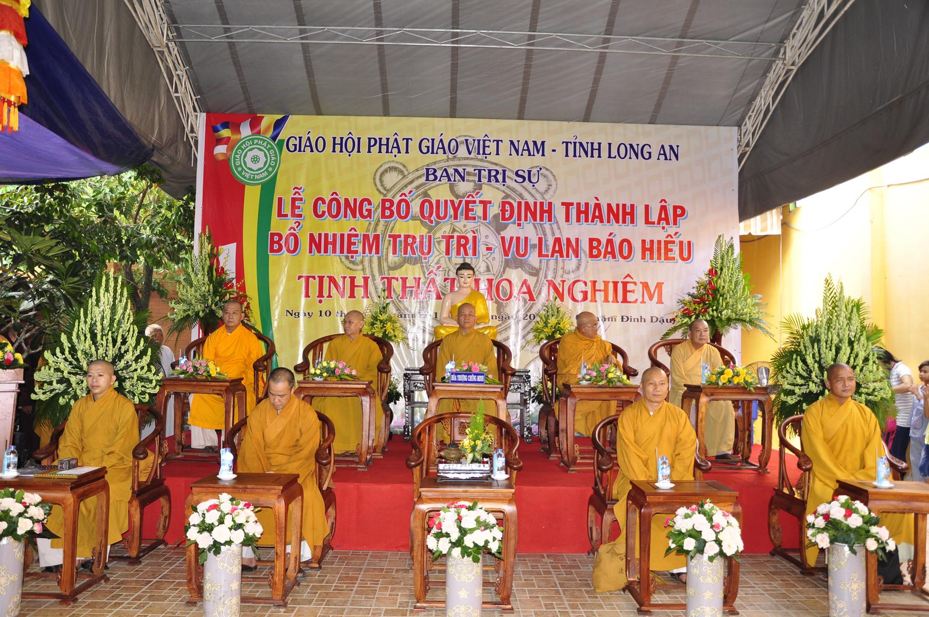 Sau nghi thức niệm Phật cầu gia bị, tuyên bố lý do và giới thiệu thành phần tham dự, ông Nguyễn Thanh Sơn: Trưởng ban Tôn giáo Dân tộc UBMTTQVN tỉnh Long An thông qua quyết định số 2809/QĐ/UBND về việc chấp thuận thành lập tổ chức tôn giáo trực thuộc (tịnh thất Hoa Nghiêm).