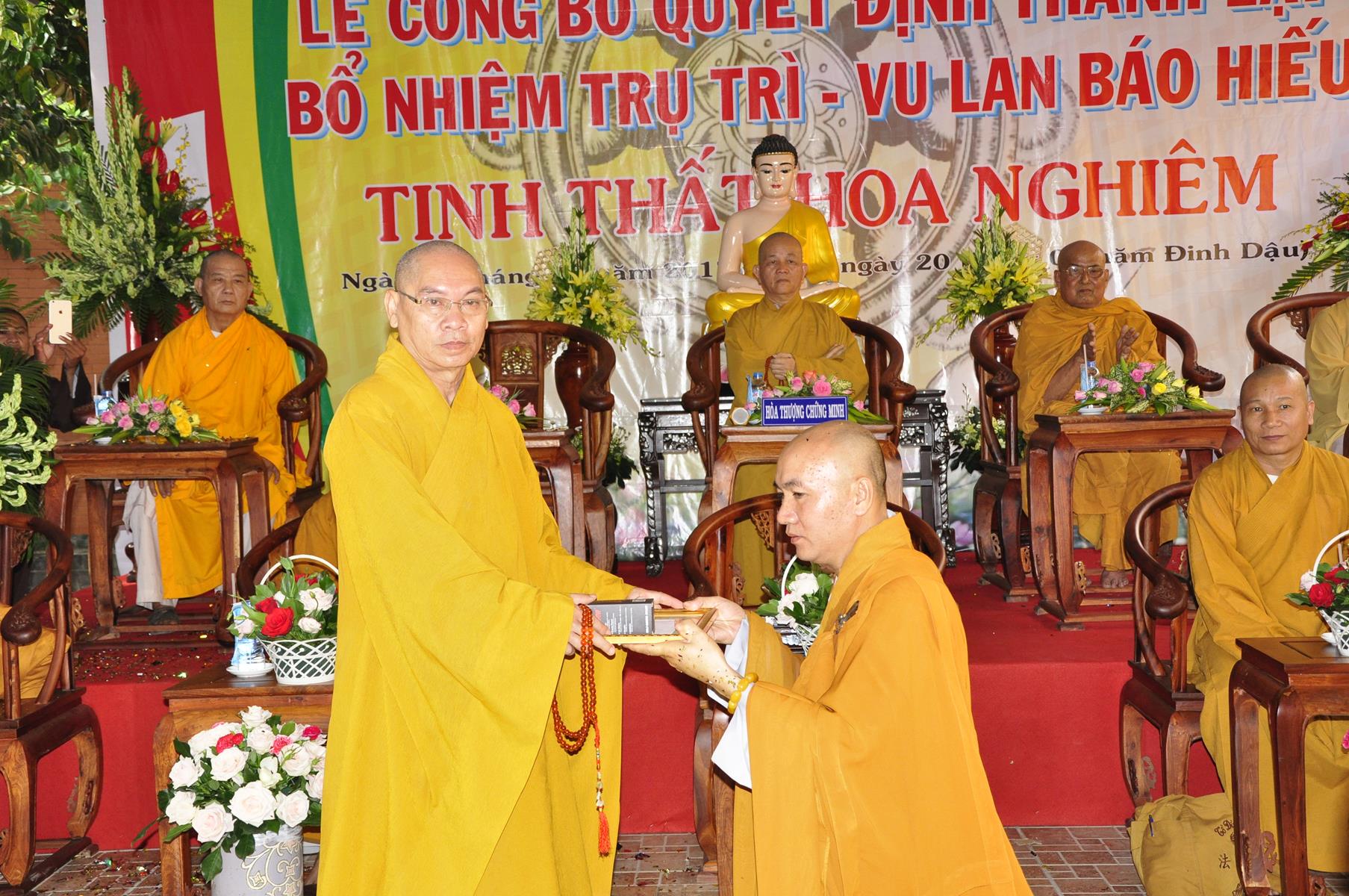 Ông Nguyễn Văn Thiệp: Bí thư huyện ủy Cần Giuộc trao quyết định thành lập tịnh thất Hoa Nghiêm cho HT Thích Minh Thiện và ĐĐ Thích Lệ Trí: Ủy viên HĐTS, Chánh Thư ký BTS GHPGVN tỉnh Long An thông qua quyết định bổ nhiệm trụ trì cho ĐĐ Thích Giác Tôn. Tân Trụ trì tịnh Thất Hoa Nghiêm phát nguyện nhận nhiệm vụ.