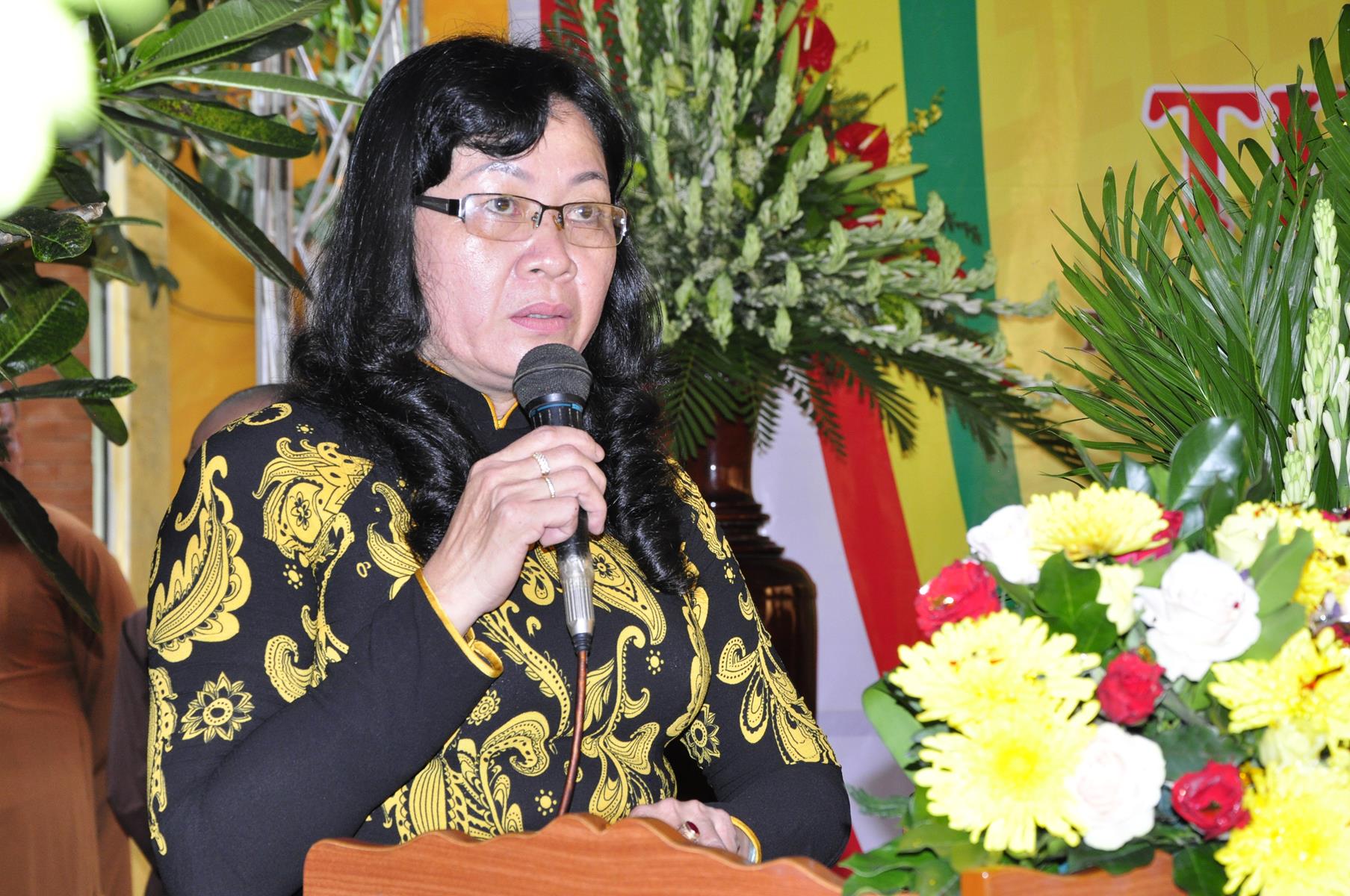 Bà Phạm Ngọc Tiệp: Phó Chủ tịch UBMTTQVN tỉnh Long An phát biểu chúc mừng. Bà rất vui mừng về việc thành lập tịnh thất Hoa Nghiêm, không những đáp ứng theo nguyện vọng của đồng bào Phật tử mà còn là biểu tượng văn hóa của làng xã. Bà mong muốn Đại đức tân trụ trì cần quan tâm và có phương hướng hoạt động theo Hiến chương của GHPGVN, gắn bó với chính quyền các cấp, tích cực hưởng ứng các phong trào thi đua yêu nước và các cuộc vận động do địa phương phát động, thông qua việc truyền bá triết lý và thực hành giáo lý Phật giáo, để hướng dẫn chúng sinh, xây dựng đạo đức tốt đẹp, duy trì bản sắc văn hóa của dân tộc, góp phần giảm bớt tiêu cực và tệ nạn xã hội; hướng dẫn tín đồ tu tâm dưỡng tánh, làm những việc thiện, biết yêu thương đùm bọc lẫn nhau, thể hiện đức tính tốt đẹp của người con Phật, làm tròn nghĩa vụ của người công dân, đoàn kết dân tộc, tôn giáo, tích cực tham gia các hoạt động từ thiện xã hội, sống tốt đời đẹp đạo.