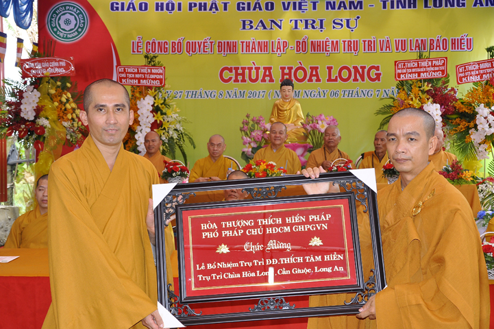 Chứng minh buổi lễ, Đại đức – Tiến sỉ Thích Tâm Hiền cùng Ban tổ chức hoan hỷ cung tiếp: : Hòa thượng Thích Minh Thiện : Ủy viên Ban trị sự Trung ương Giáo hội Phật giáo Việt Nam, Trưởng ban Trị sự giáo hội Phật giáo Việt Nam tỉnh Long An ; Hòa thượng Thích Thiện Tâm : Phó ban Trị sự Giáo hội Phật giáo Việt Nam tỉnh Long An ; Hòa thượng Thích Huệ Bạch : Trưởng ban trị sự Giáo hội Phật giáo Việt Nam huyện Cần Giuộc ; Hòa thượng Thích Tắc Nhàn : Phó ban Trị sự Giáo hội Phật giáo Việt Nam huyện Cần Giuộc ; Đại đức Thích Lệ Trí : Ủy viên Hội đồng Trị sự Trung ương Giáo hội Phật giáo Việt Nam, Chánh thư ký ban Trị sự Giáo hội Phật giáo Việt Nam tỉnh Long An, cùng quý chư tôn giáo phẩm tỉnh/ huyện và trụ trì các tự viện.