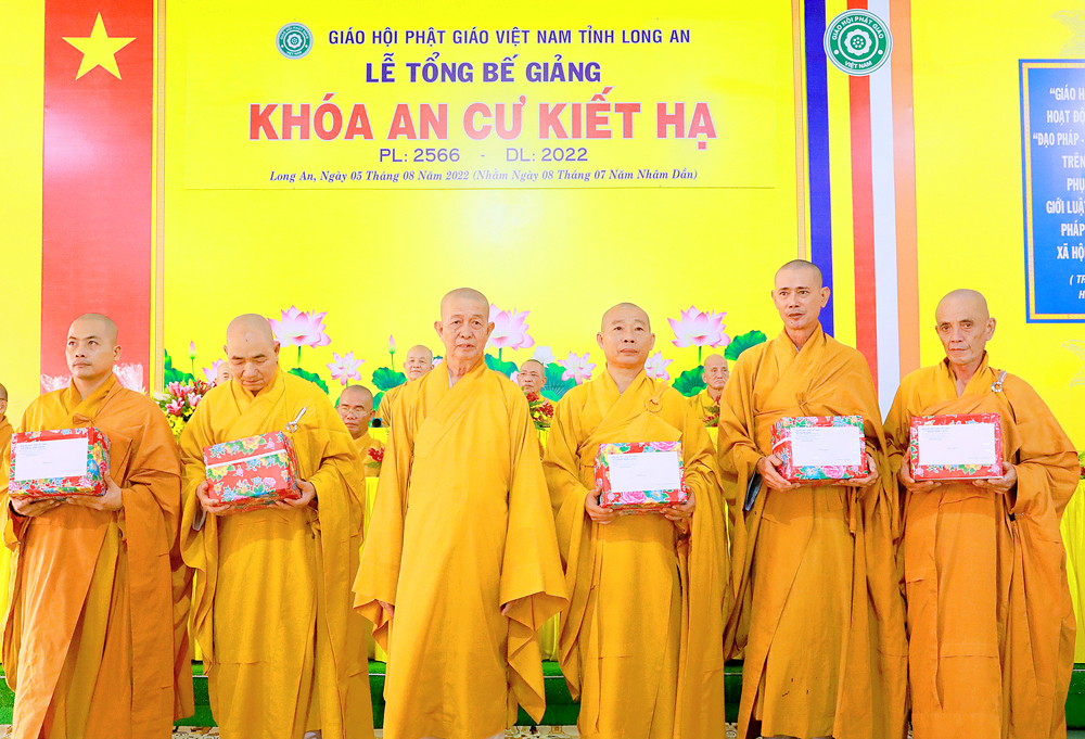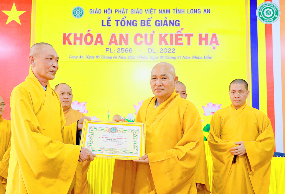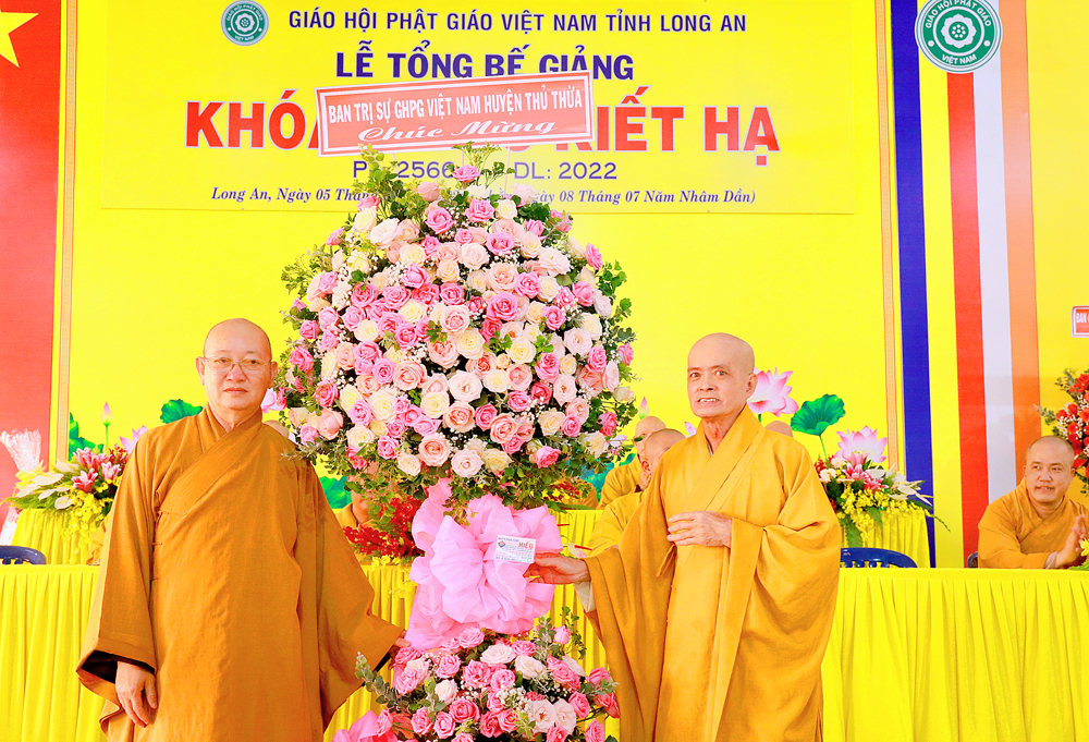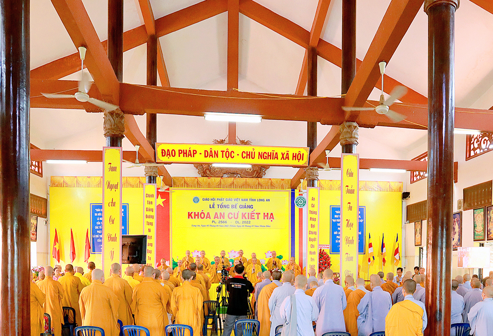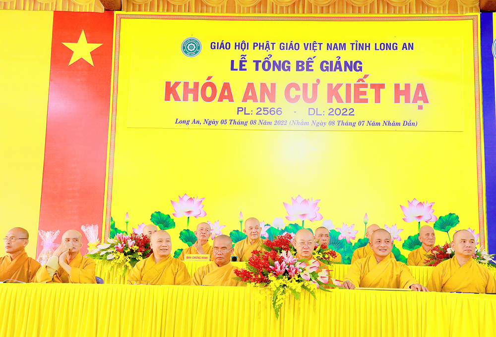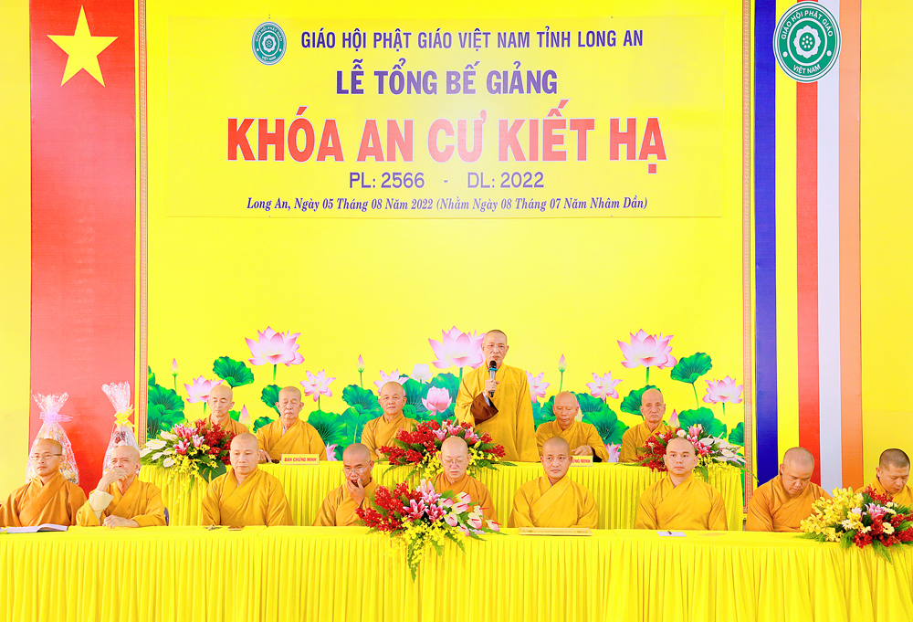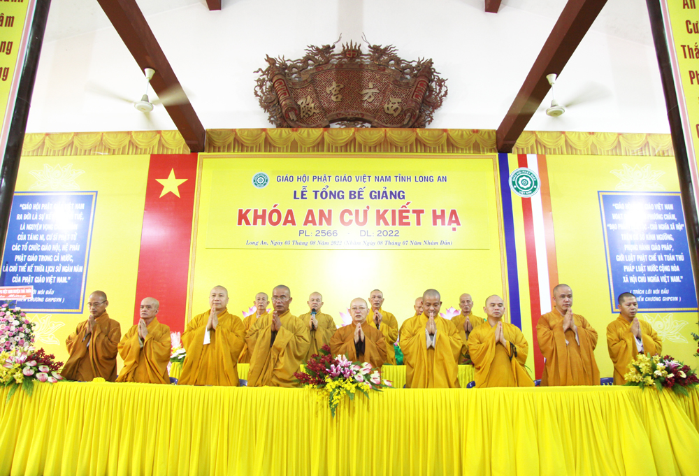 Sau ba tháng tu học, trưởng dưỡng đạo tâm, vun bồi đạo nghiệp, Sáng ngày (nhằm ngày 08/7/Nhâm Dần), Ban Trị sự GHPGVN tỉnh Long An tổ chức Lễ Tổng Bế Giảng Khóa An Cư Kiết Hạ PL. 2566 DL. 2022 tại Văn phòng BTS GHPGVN huyện Thủ Thừa – Chùa Kim Cang, huyện Thủ Thừa, tỉnh Long An.