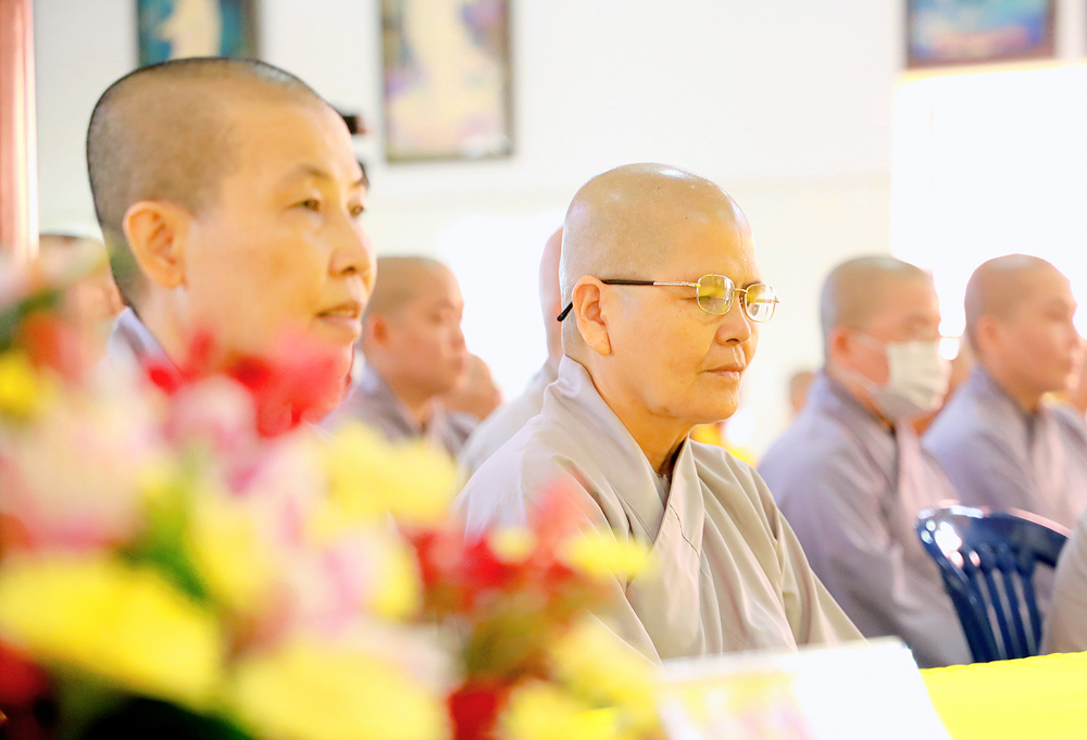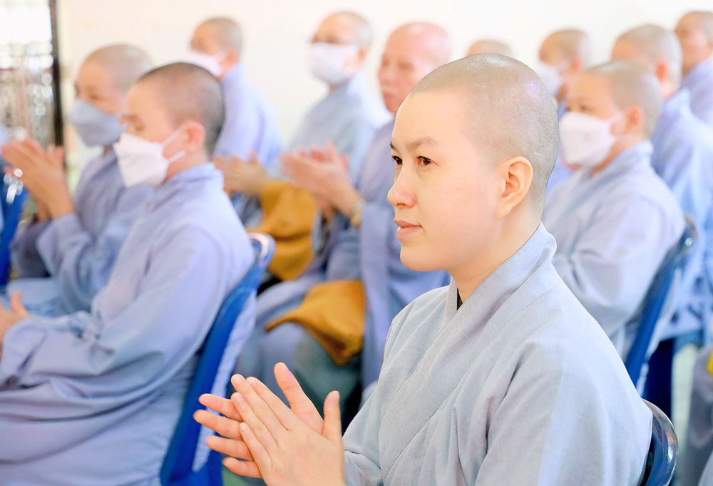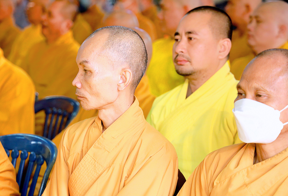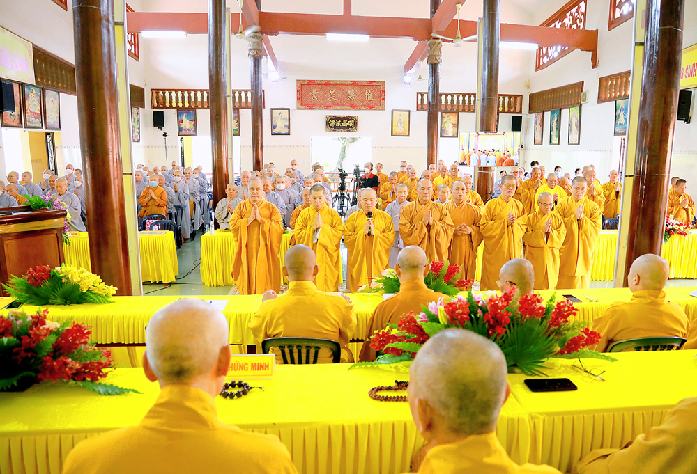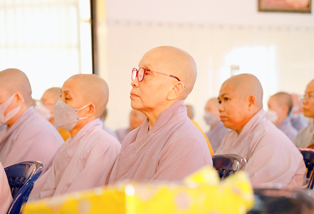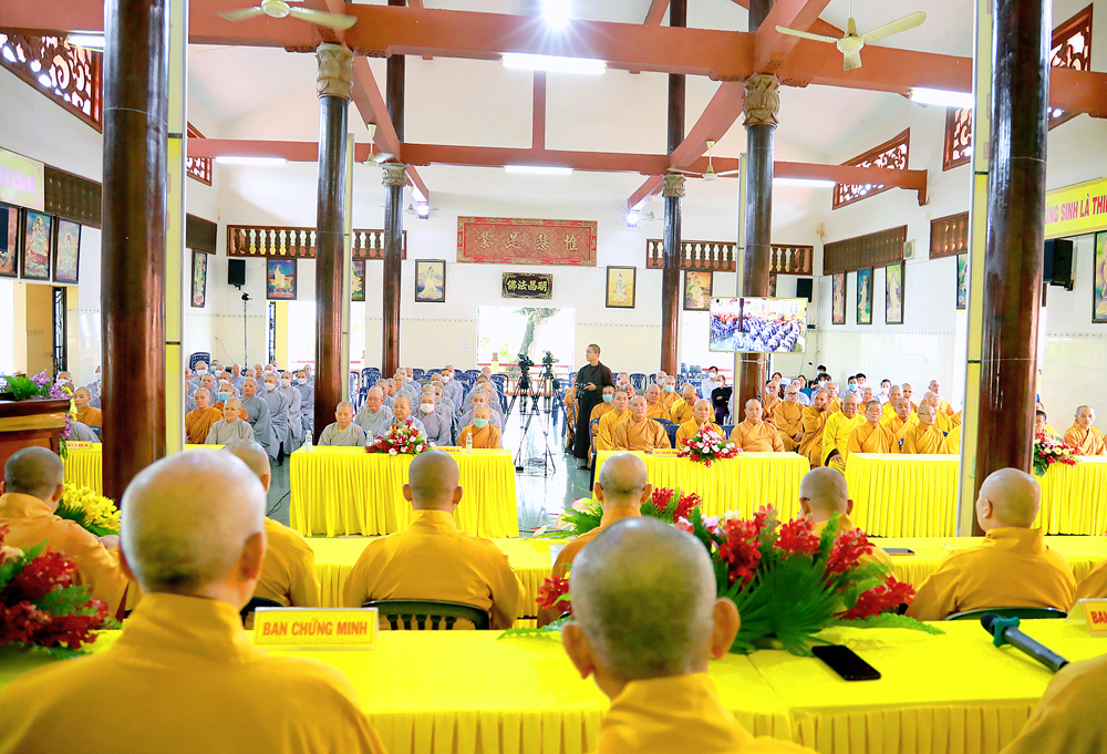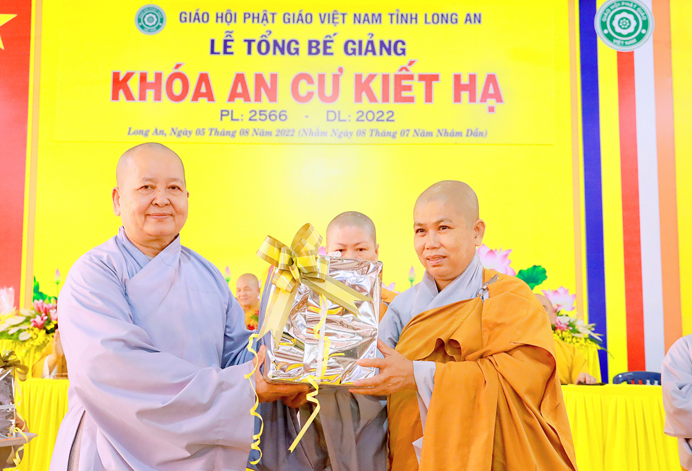 Ban lời chỉ đạo tại Lễ Bế giảng HT. Thích Minh Thiện, trước nhất HT gửi lời vấn an trân trọng và lời chúc “Phước trí trang nghiêm” đến chư Tôn đức Chứng minh và chư Tôn đức các hạ trường và toàn thể chư hành giả an cư cùng quý vị khách quý, các cơ quan hữu quan đã giúp cho khoá An cư kiết hạ thành tựu viên mãn. HT mong mỏi chư Tôn đức hãy tích cực học tập về giáo pháp lẫn Luật pháp của Nhà nước để cùng nhau bảo vệ tinh thần “Dân chủ – Độc lập”. HT nhấn mạnh, 3 tháng An cư là không nhiều nhưng đủ để ta phản tỉnh và tiếp thu những kiến thức mới, HT tri ân tất cả chư Tôn đức, các hành giả an cư đã nổ lực tinh tấn tu học theo tinh thần “Lục hoà cộng trụ” ở 12 trú xứ. Cuối lời, HT nhắc nhở đại chúng hãy tỉnh giác trong việc phòng chống và tiêm vaccine ngừa Covid – 19, giữ gìn Vệ sinh môi trường, giảm tiêu dùng điện nước, rác thải khó thiêu huỷ,… Sau cùng, HT kính gửi lời chúc sức khoẻ đến chư Tôn thiền đức và toàn thể đại chúng.