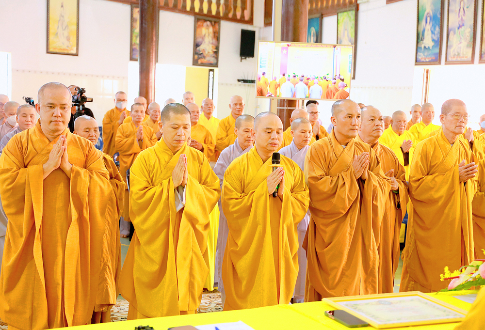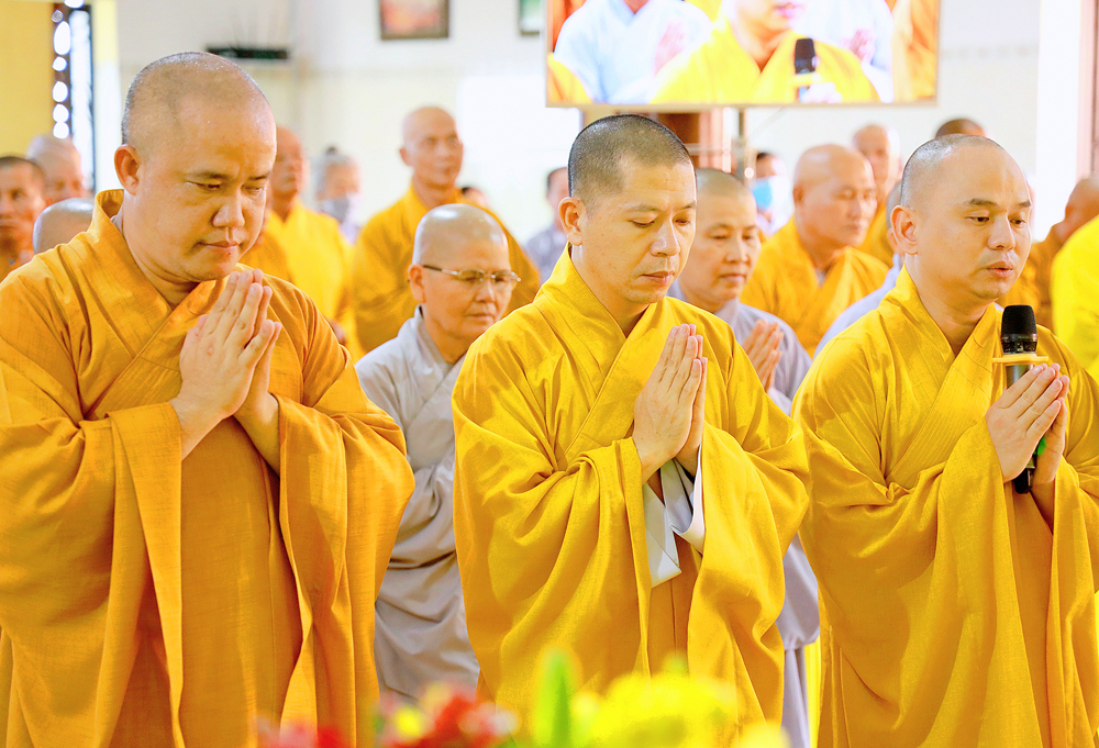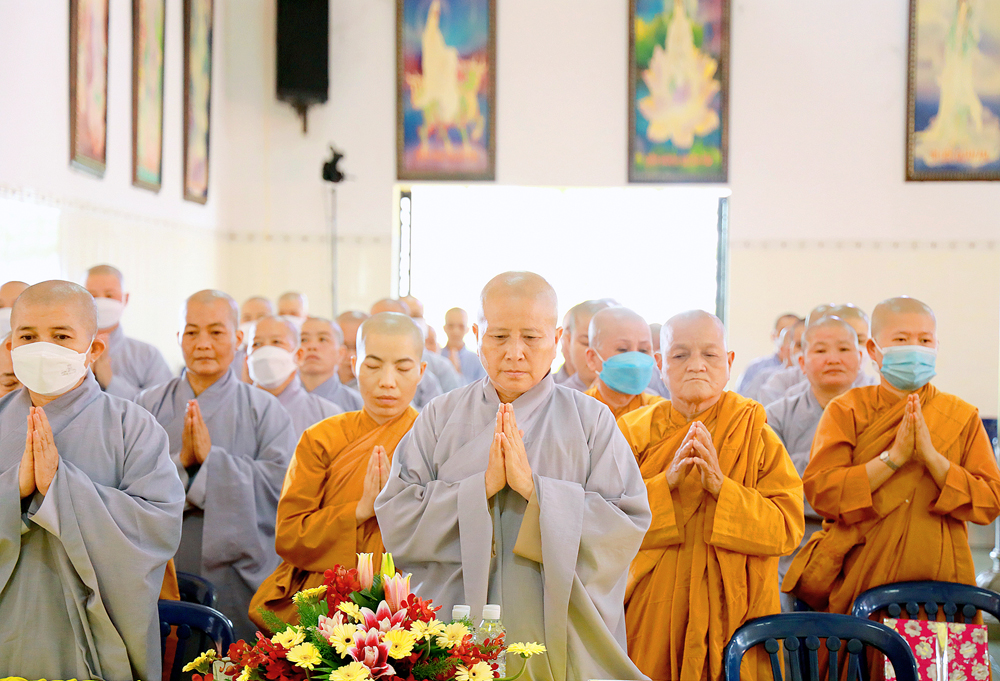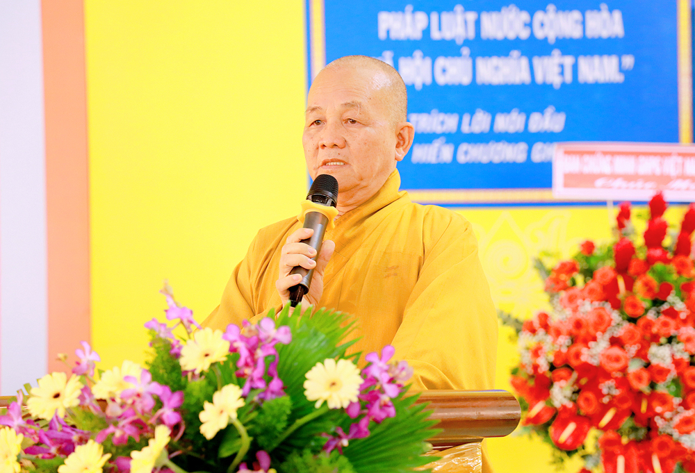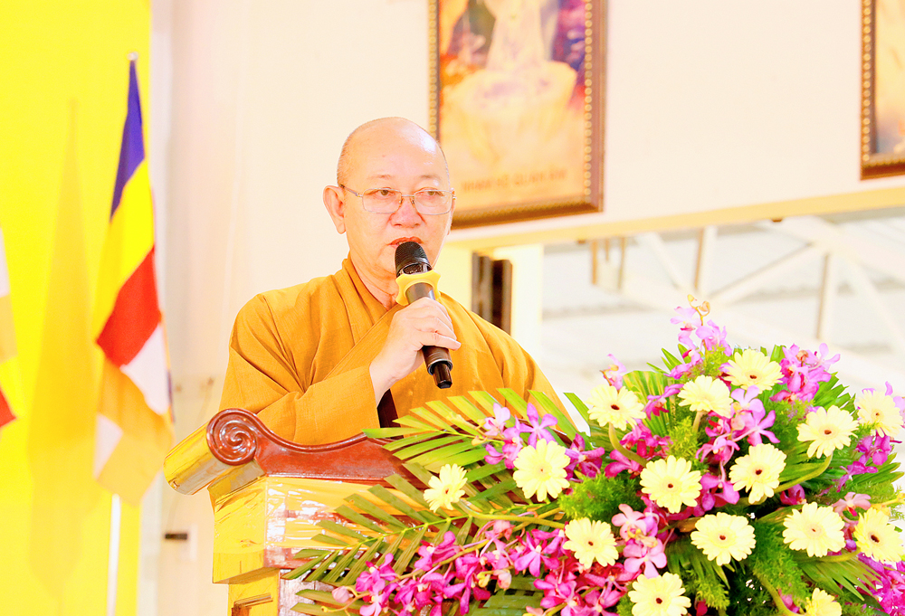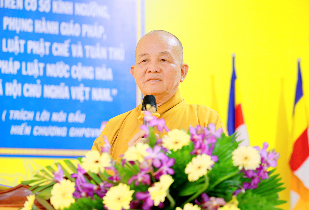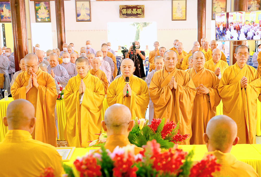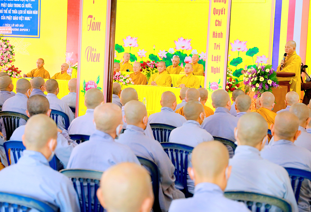 Ban lời chỉ đạo tại Lễ Bế giảng HT. Thích Minh Thiện, trước nhất HT gửi lời vấn an trân trọng và lời chúc “Phước trí trang nghiêm” đến chư Tôn đức Chứng minh và chư Tôn đức các hạ trường và toàn thể chư hành giả an cư cùng quý vị khách quý, các cơ quan hữu quan đã giúp cho khoá An cư kiết hạ thành tựu viên mãn. HT mong mỏi chư Tôn đức hãy tích cực học tập về giáo pháp lẫn Luật pháp của Nhà nước để cùng nhau bảo vệ tinh thần “Dân chủ – Độc lập”. HT nhấn mạnh, 3 tháng An cư là không nhiều nhưng đủ để ta phản tỉnh và tiếp thu những kiến thức mới, HT tri ân tất cả chư Tôn đức, các hành giả an cư đã nổ lực tinh tấn tu học theo tinh thần “Lục hoà cộng trụ” ở 12 trú xứ. Cuối lời, HT nhắc nhở đại chúng hãy tỉnh giác trong việc phòng chống và tiêm vaccine ngừa Covid – 19, giữ gìn Vệ sinh môi trường, giảm tiêu dùng điện nước, rác thải khó thiêu huỷ,… Sau cùng, HT kính gửi lời chúc sức khoẻ đến chư Tôn thiền đức và toàn thể đại chúng.