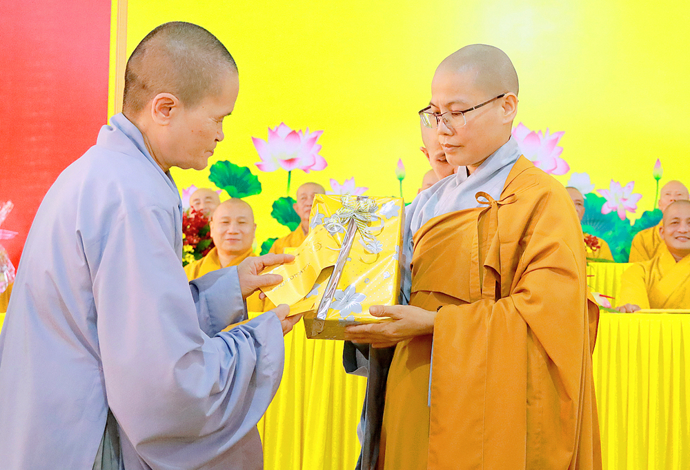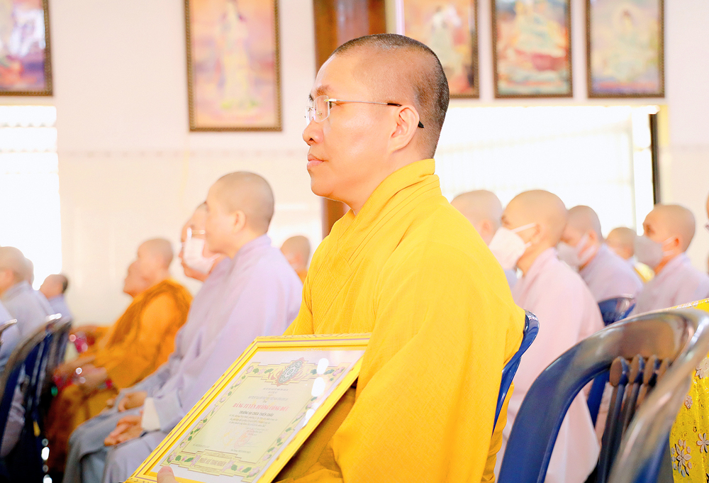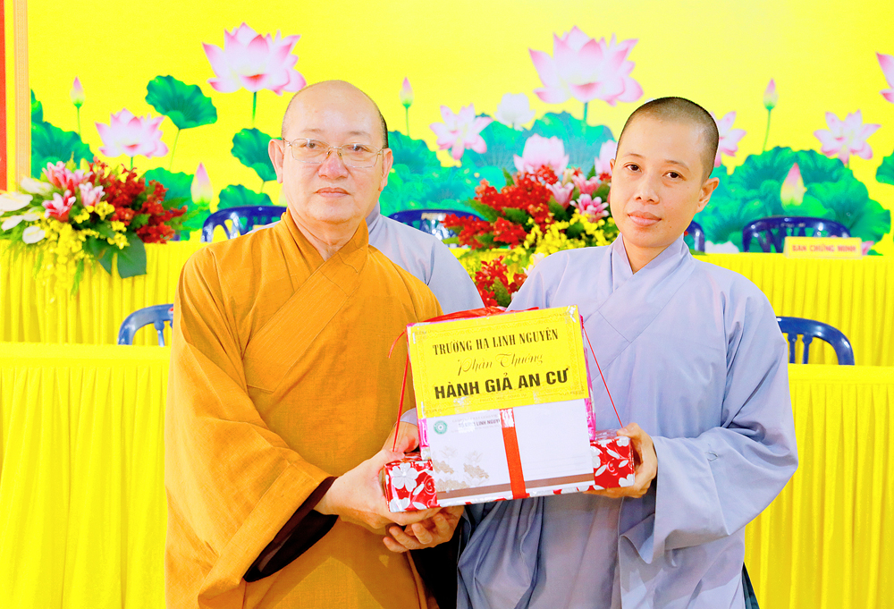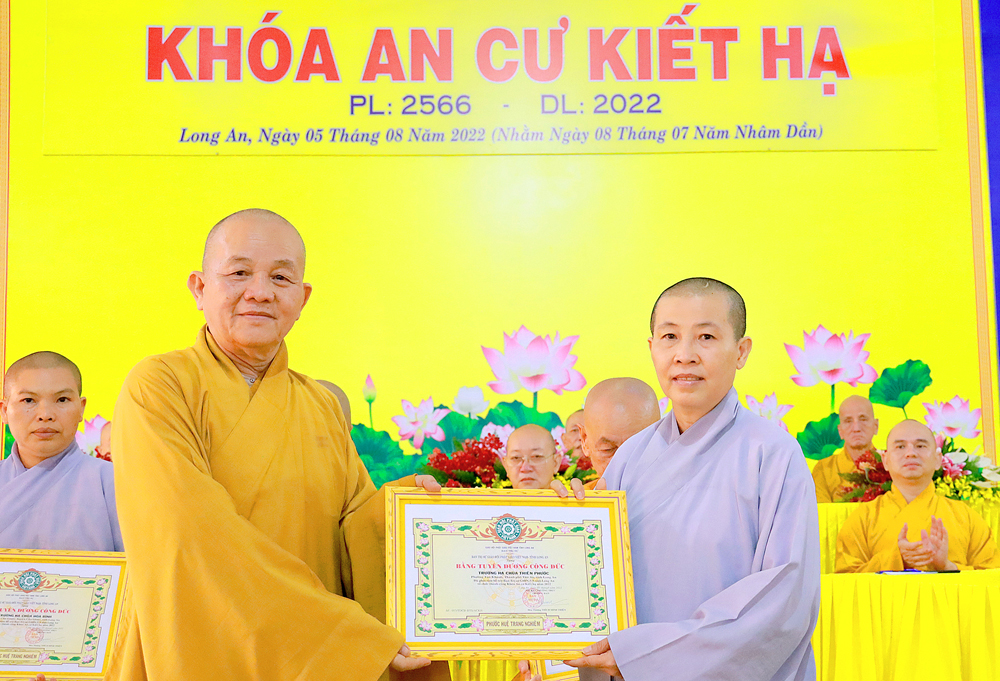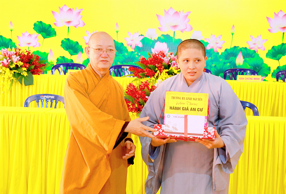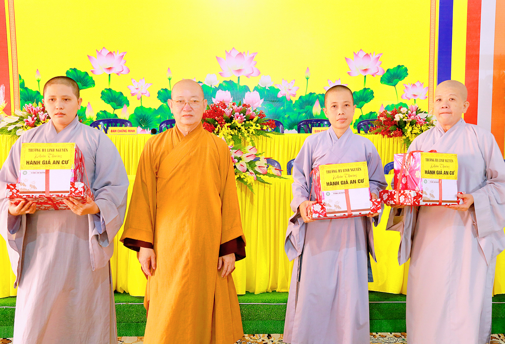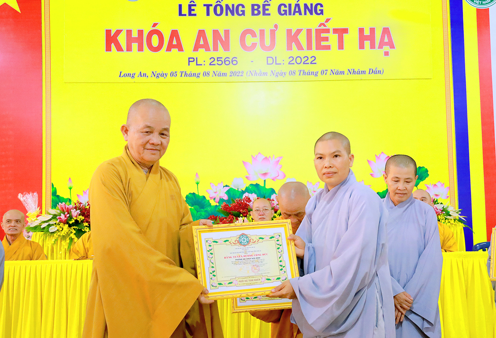 Tiếp sau đó, thay mặt BTC ĐĐ. Thích Thiện Danh đã thông qua phương danh chư Tôn đức nhận bằng Tuyên dương công đức và khen thưởng quý hành giả An cư của 12 trú xứ.