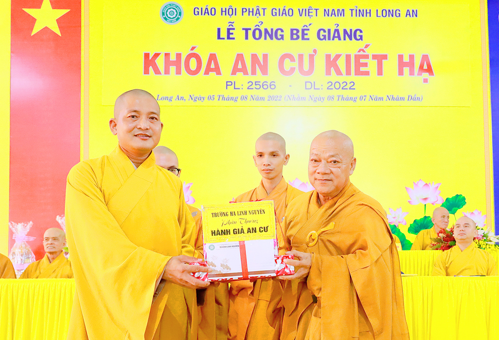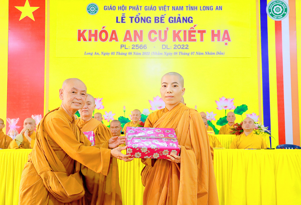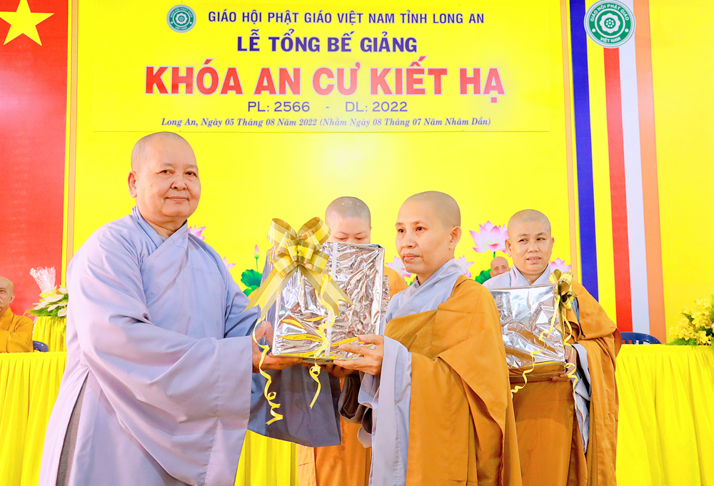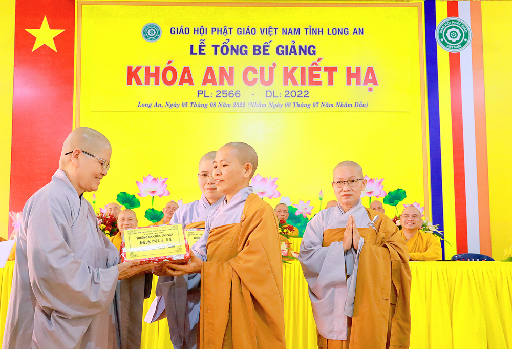 Tại buổi lễ, ĐĐ. Thích Lệ Duyên đã thay mặt cho BTT BTS GHPGVN tỉnh Long An đã có bài báo cáo khái quát kết quả tu học tại 12 trú xứ An cư kiết hạ PL.2566. Bài báo cáo đã nêu rõ: Ban Chứng minh cung thỉnh: HT. Thích Hoằng Chánh, HT. Thích Thiện Huệ, HT. Thích Huệ Hồng; Ban Tổ chức do Hòa thượng Thích Minh Thiện làm Trưởng ban cùng 25 thành viên, Toàn tỉnh có 12 Trú xứ An cư kiết hạ, có 943 vị (nhập hạ: 478, tùng hạ: 465) Tăng Ni tham dự khóa an cư kiết hạ PL 2.566, Tất cả các Trú xứ An cư Kết hạ tổ chức thời gian tu học đủ ba tháng, từ ngày 16/5/2022 đến ngày 13/8/2022 (nhằm ngày 16/4/Nhâm Dần đến ngày 16/7/Nhâm Dần). Kết thúc phần báo cáo, ĐĐ kính gửi lời chúc sức khoẻ đến chư Tôn đức và toàn thể đại chúng.