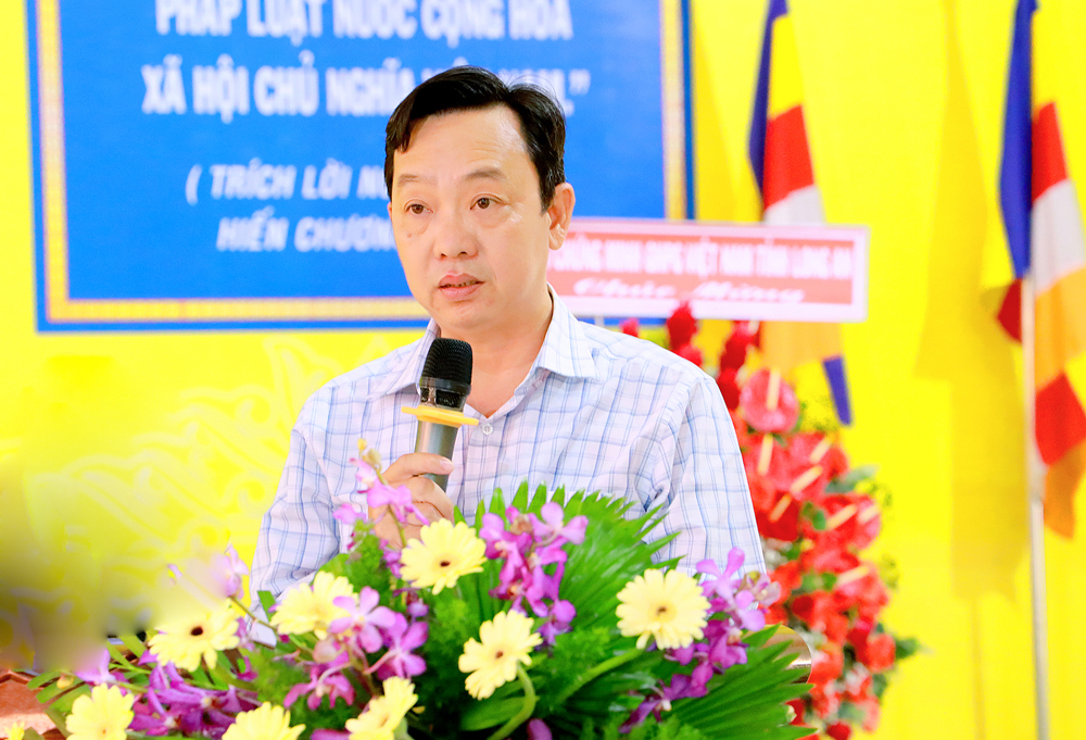 Đại diện chính quyền Ông Nguyễn Thanh Sơn đã bày tỏ niềm hoan hỷ với những thành quả đã đạt được trong khoá An cư kiết hạ do BTS PG tỉnh Long An tổ chức. Nhân dịp, mùa Vu lan trở về khắp nơi trên đất nước và trong lòng mỗi người con Phật, Ông đã kính gửi lời mừng chư Tôn đức thêm một Hạ lạp, gửi lời chúc tốt đẹp và an lành đến gia đình, người thân, cha mẹ, những người đã nằm xuống vì Tổ quốc sớm được siêu sanh Tịnh độ, người còn sống được nhiều sức khoẻ. Qua đó, Ông cũng gửi lời tưởng niệm Chư Tôn đức đã quá vãng, thành kính tưởng niệm một bậc chân tu của PG tỉnh nhà như HT. Thích Tắc Ngộ. Cuối lời, ông gửi lời chúc sức khoẻ đến toàn thể hội chúng và chúc buổi lễ thành công tốt đẹp.