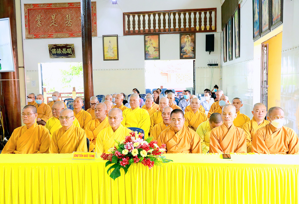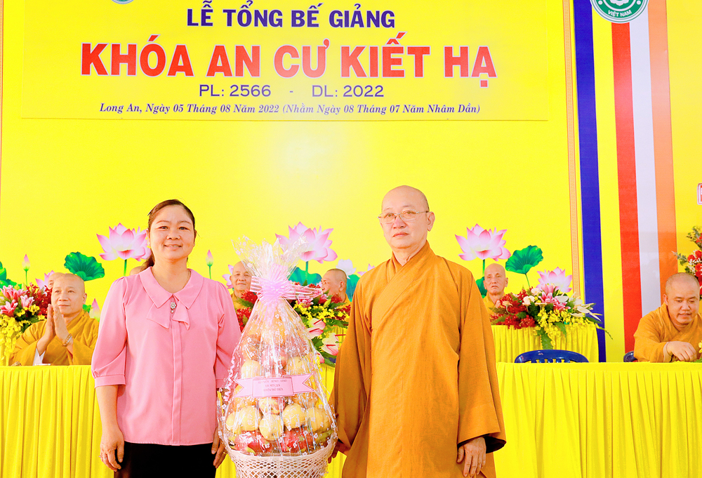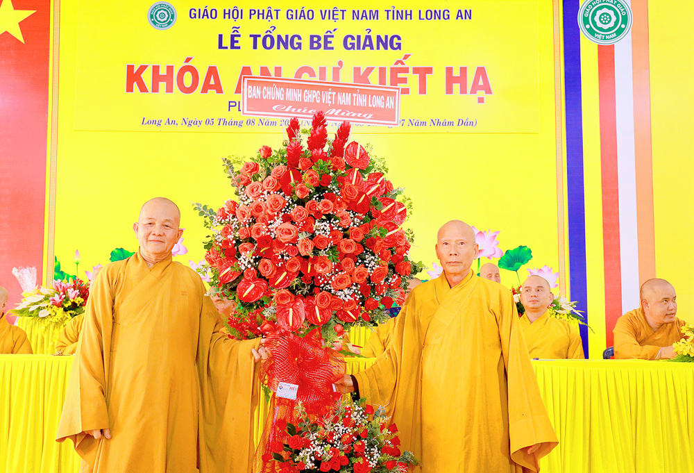 Quang lâm chứng minh và tham dự buổi lễ có: HT. Thích Thiện Huệ, HT. Thích Huệ Hồng, HT. Thích Thiện Tài, HT. Thích Quảng Ý – đồng Chứng minh BTS GHPGVN tỉnh Long An; HT. Thích Minh Thiện – UV HĐTS, Phó ban Hoằng pháp TW, Trưởng BTS GHPGVN tỉnh Long An, Trưởng ban Tổ chức; TT. Thích Quảng Tâm – UV HĐTS, Phó Trưởng ban Thường trực BTS GHPGVN tỉnh Long An; Chư tôn đức Phó BTS: HT. Thích Tắc Phi, TT. Thích Minh Thọ, TT. Thích Đức Hòa, TT. Thích Lệ Trí, ĐĐ. Thích Lệ Duyên, ĐĐ. Thích Lệ Ngôn, NT. TN. Gương Liên, NT. TN. Như Tâm; Chư tôn đức Thường trực BTS GHPGVN tỉnh Long An; Chư tôn đức Thường trực BTS GHPGVN các huyện, thị xã, thành phố; Chư tôn đức Ban Chức sự Hạ trường và Hành giả An cư của 12 trú xứ an cư kiết hạ.