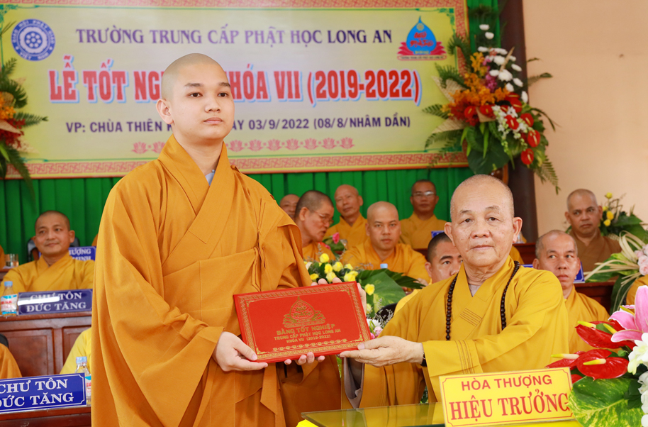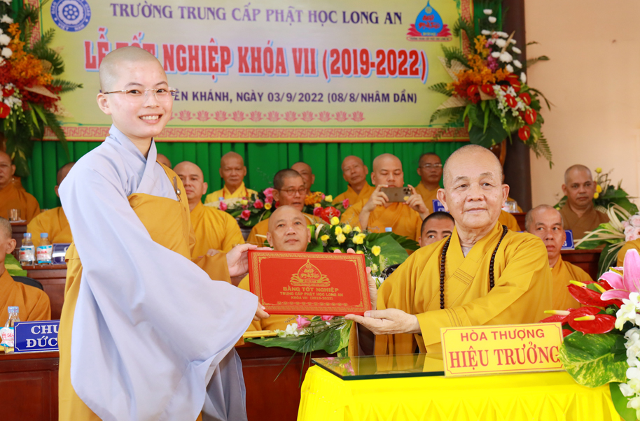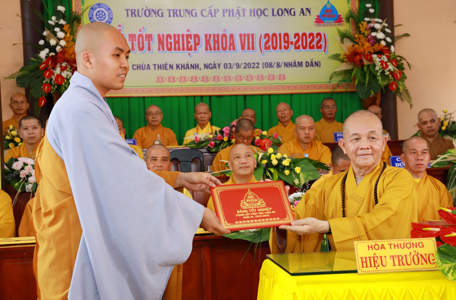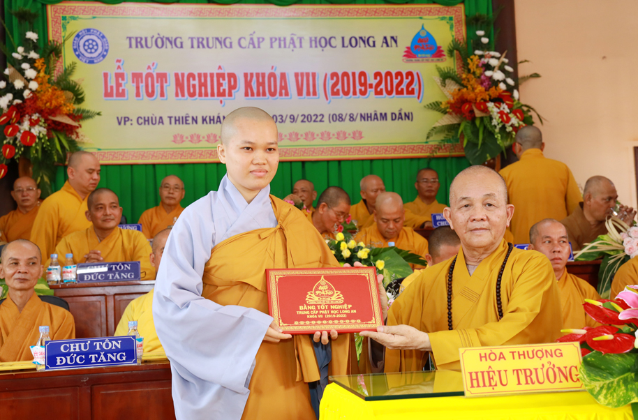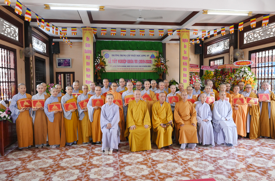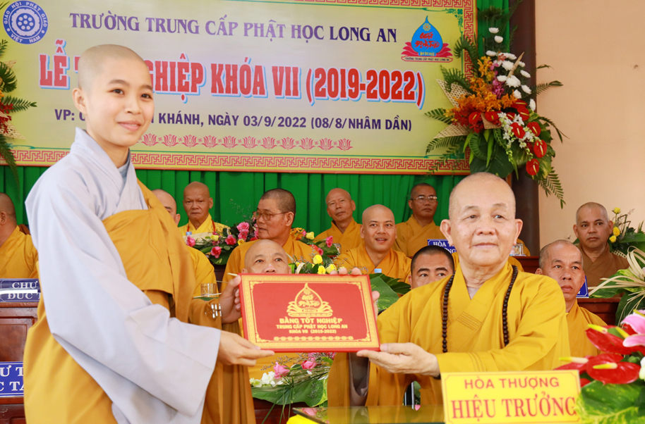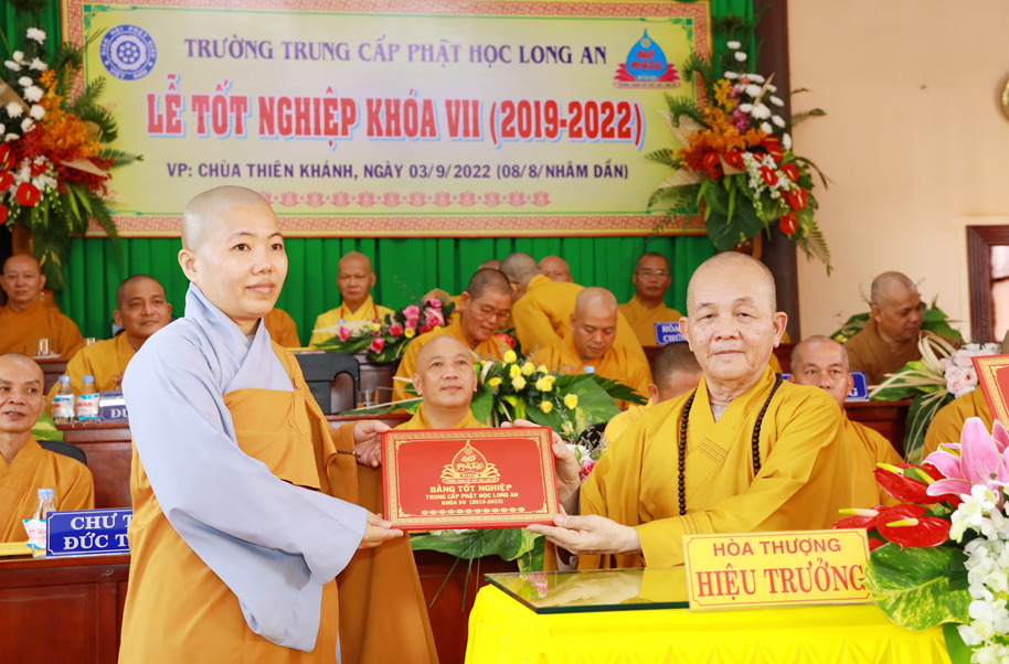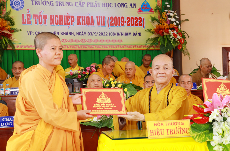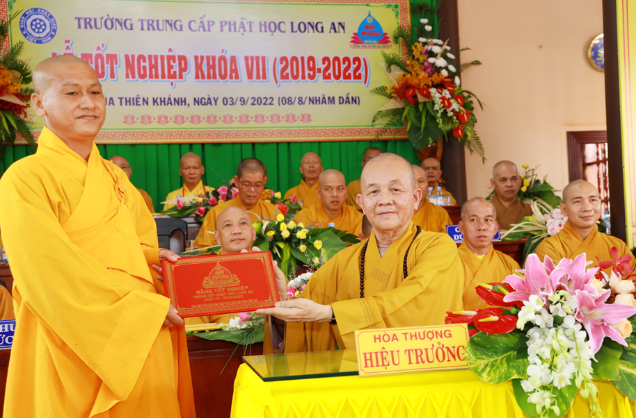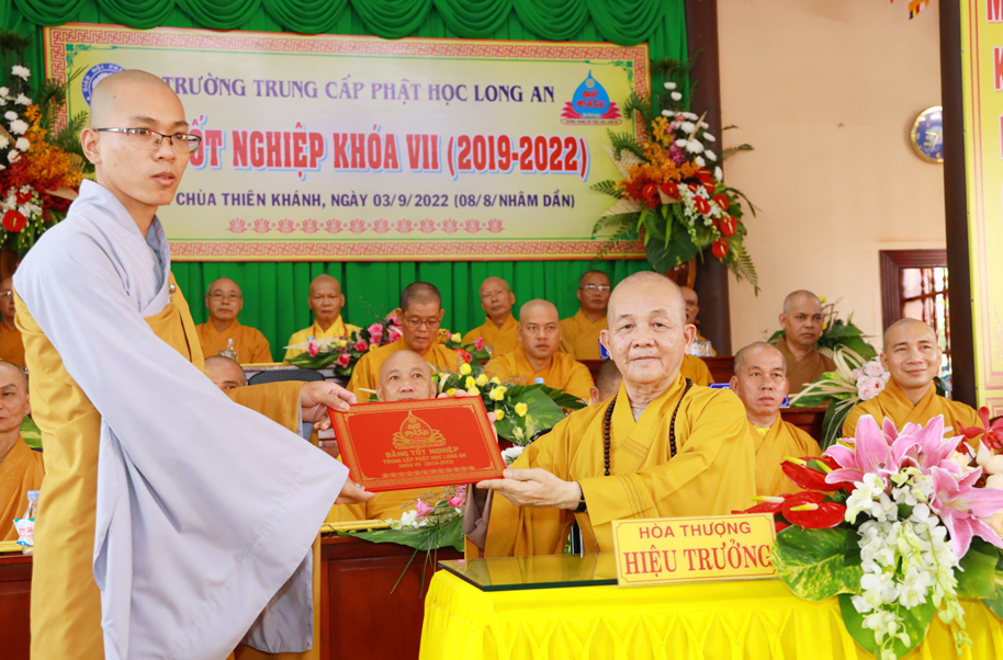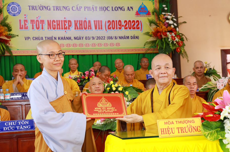 Sáng ngày 03/9/2022 (08/08/Nhâm Dần) tại chùa Thiên Khánh, số 48, đường Lưu Văn Tuế, phường 4, Thành phố Tân An, Ban Giám hiệu Trường Trung cấp Phật học tỉnh Long An trọng thể tổ chức Lễ Tốt nghiệp Trung Cấp Phật Học khóa VII (2019-2022)