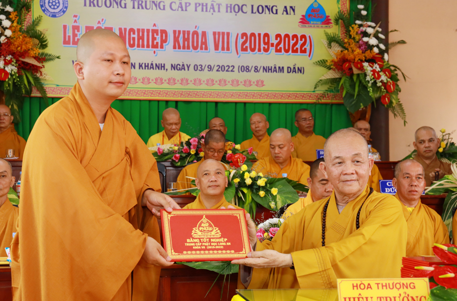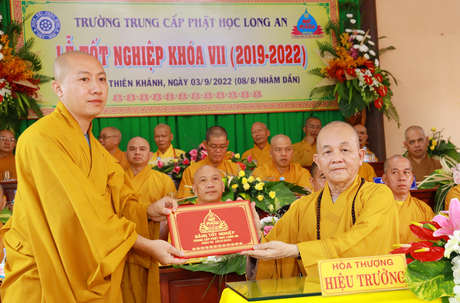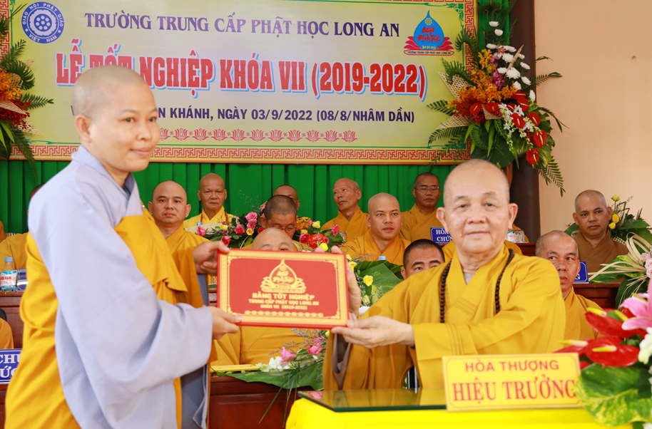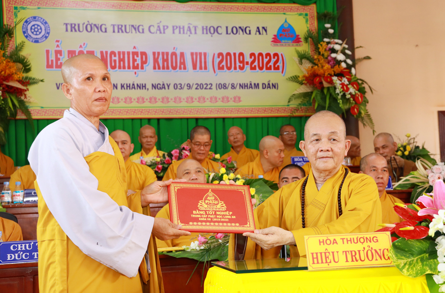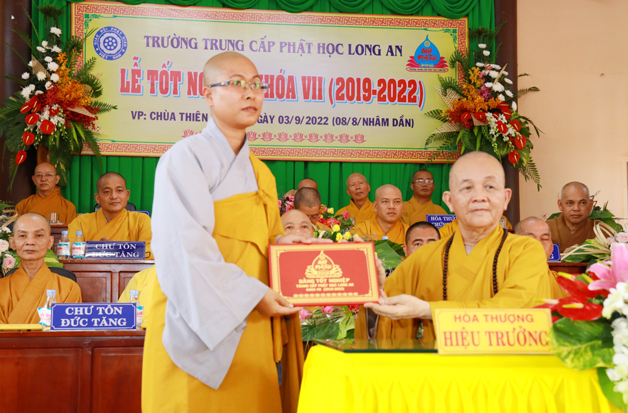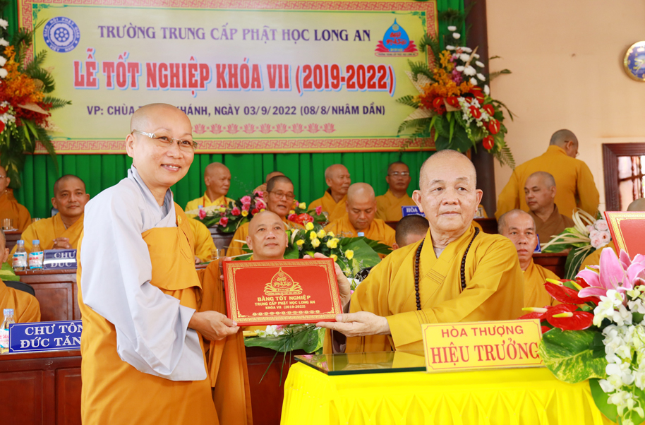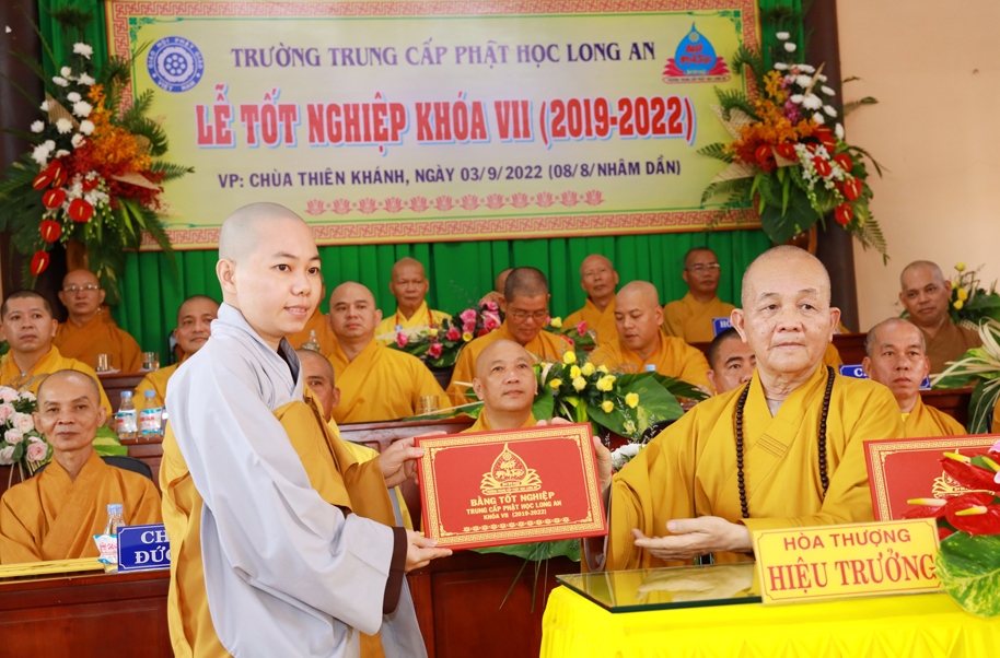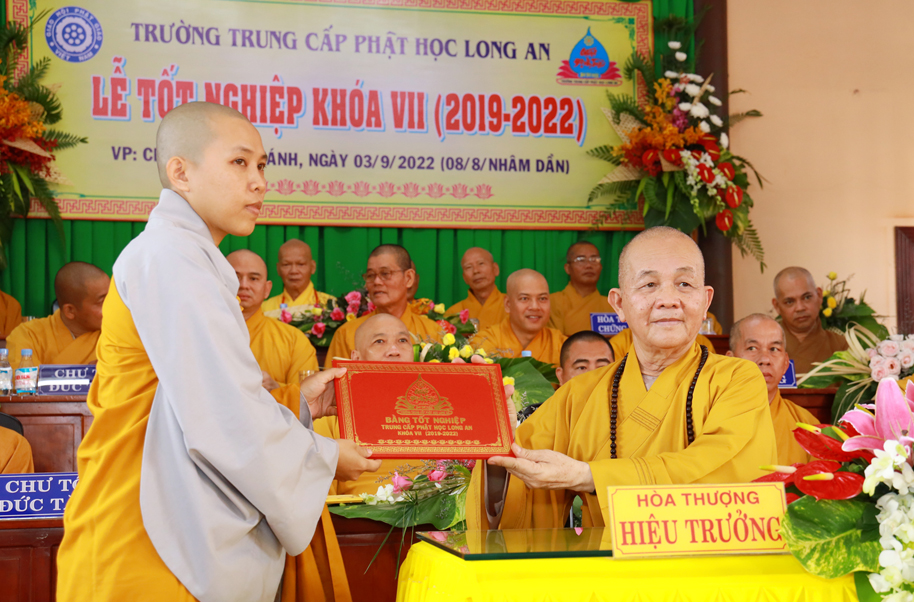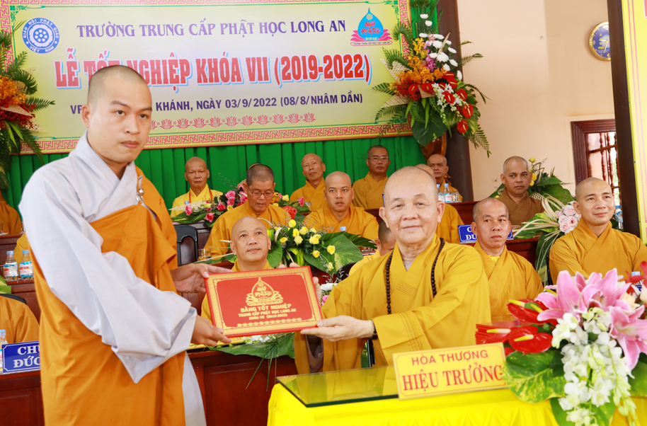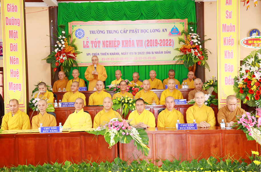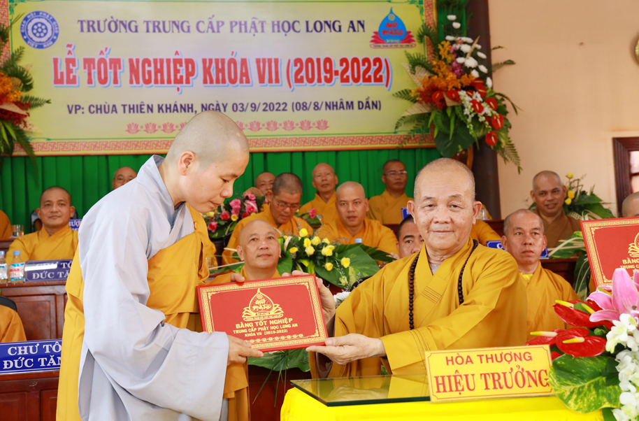 Buổi lễ được bắt đầu với nghi thức Phật giáo trang nghiêm. Sau phần giới thiệu, thay mặt Ban Giám Hiệu trường TCPH Long An, Thượng tọa Thích Lệ Trí – Phó Hiệu trưởng nhà trường báo cáo kết quả đào tạo học tập của khóa VII (2019-2022). Theo báo cáo, Lớp Trung cấp Phật học Khóa VII trãi qua ba năm đào tạo đã hoàn thành các học phần, có 63 vị đủ điều kiện tốt nghiệp và được nhận Bằng Tốt Nghiệp do Ban Giáo dục Phật giáo trung ương cấp.