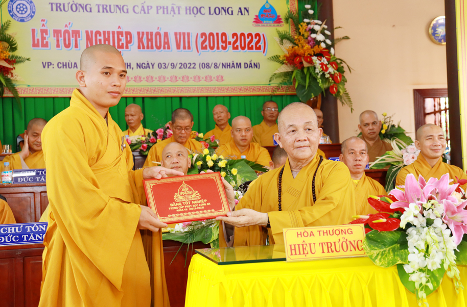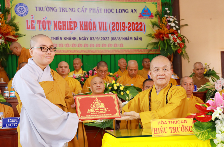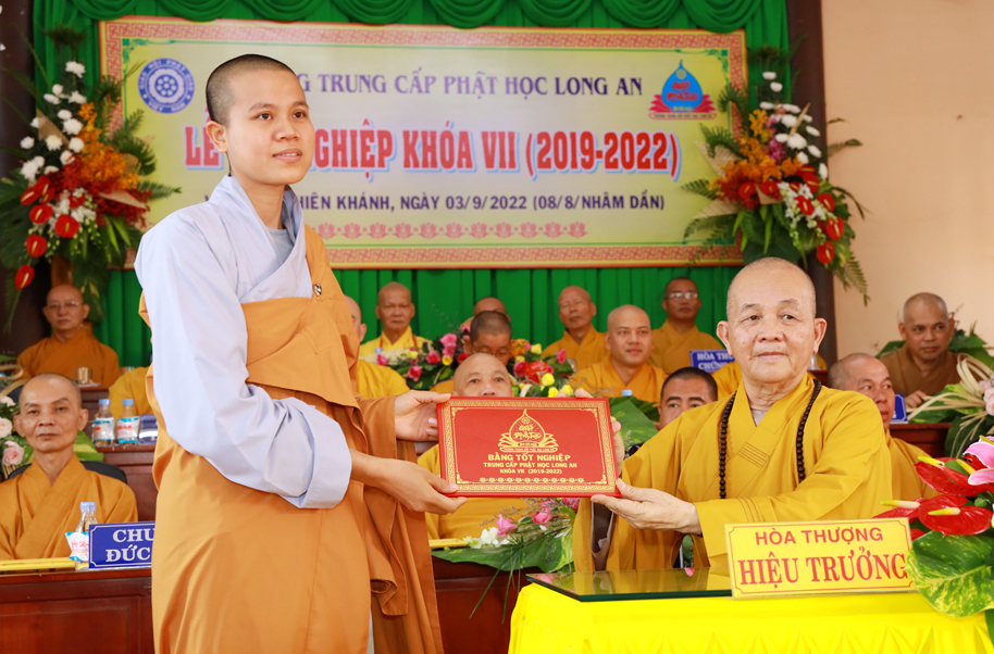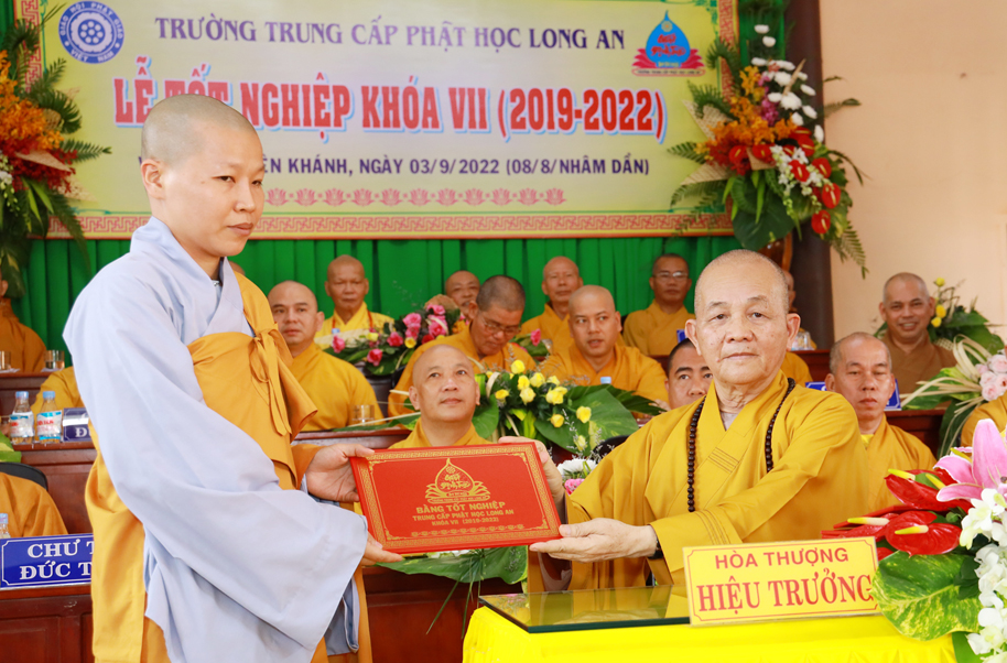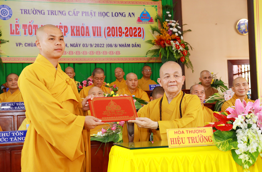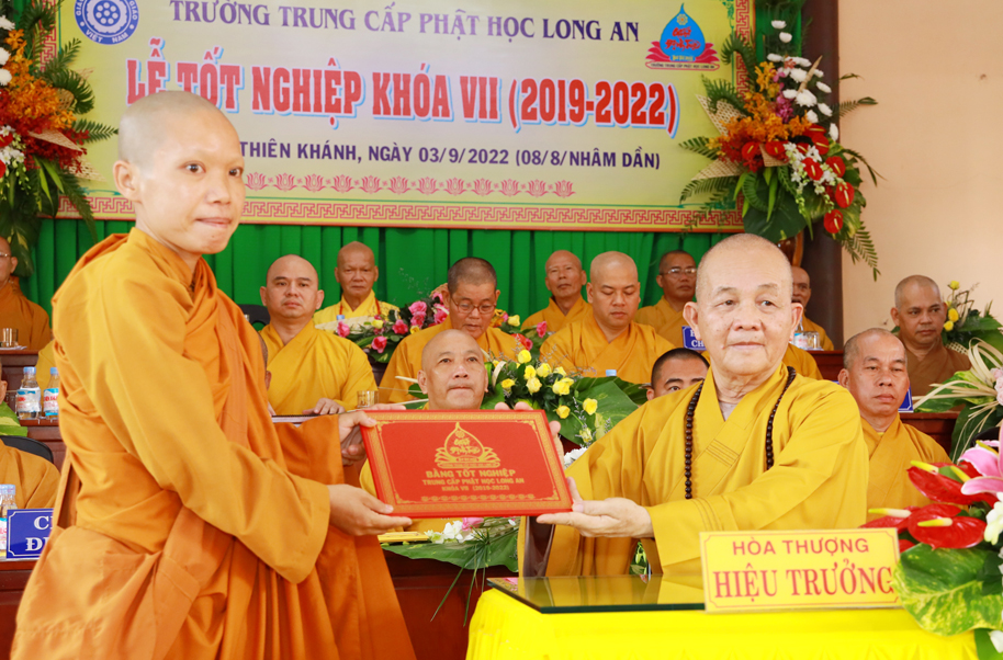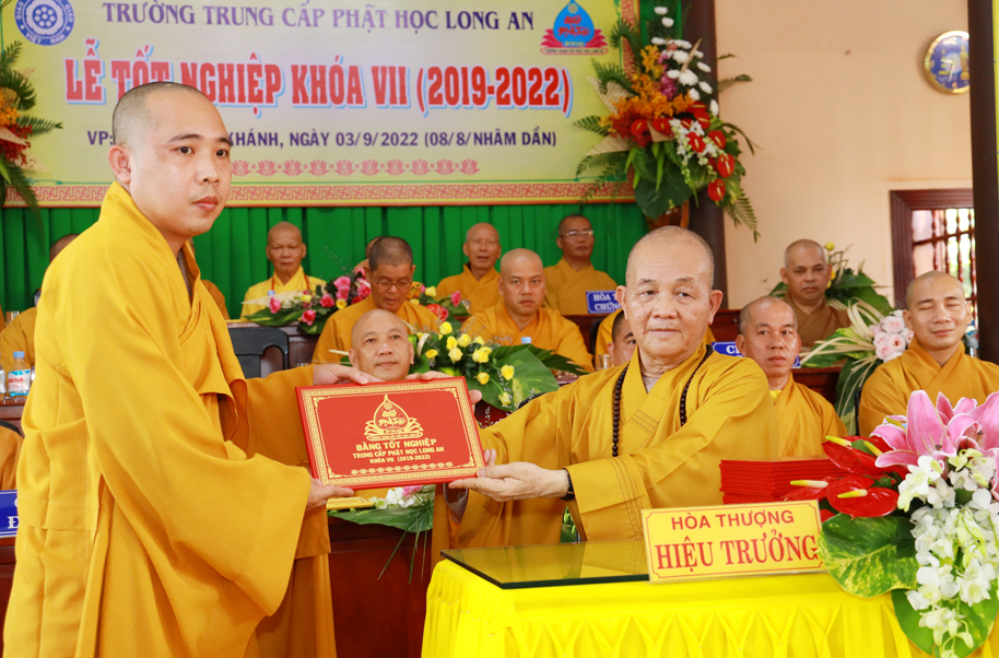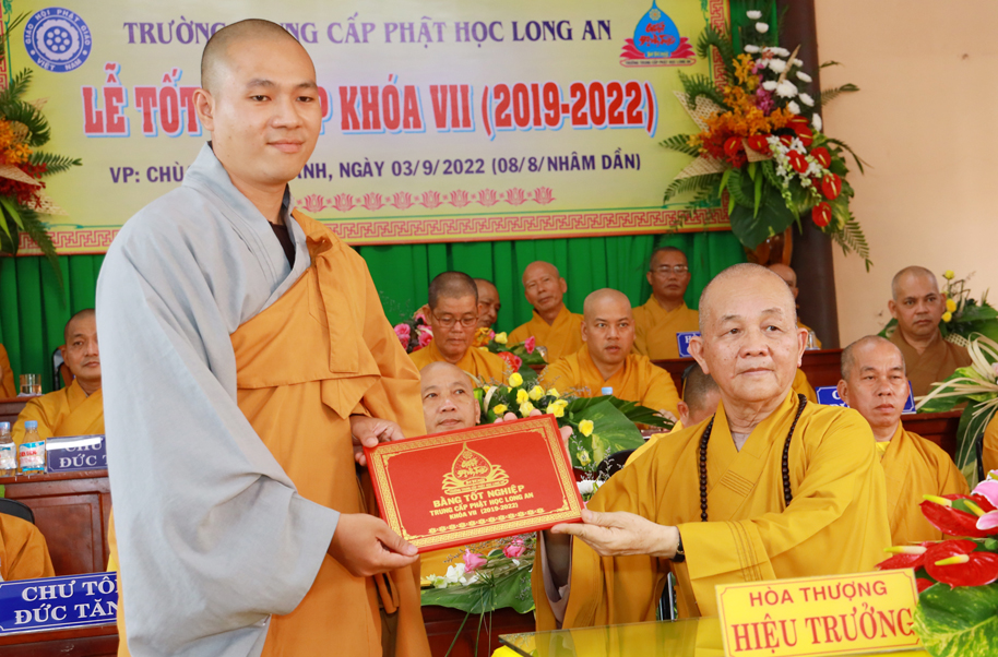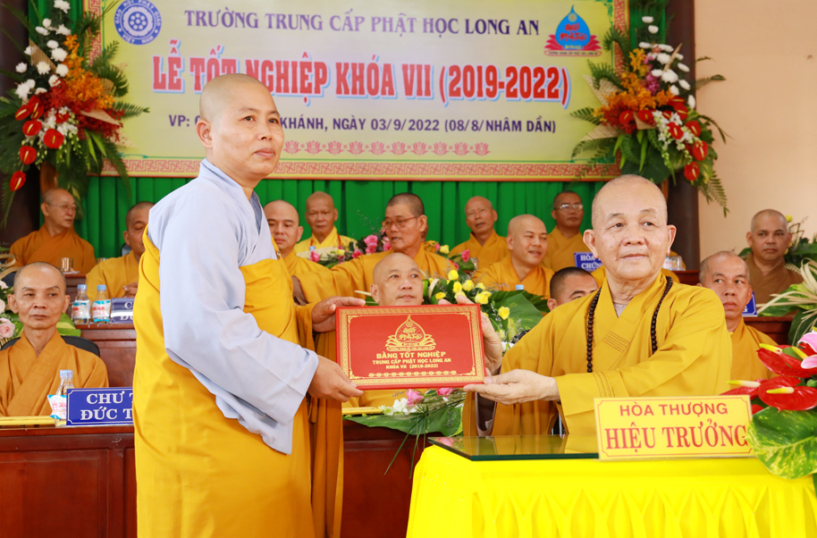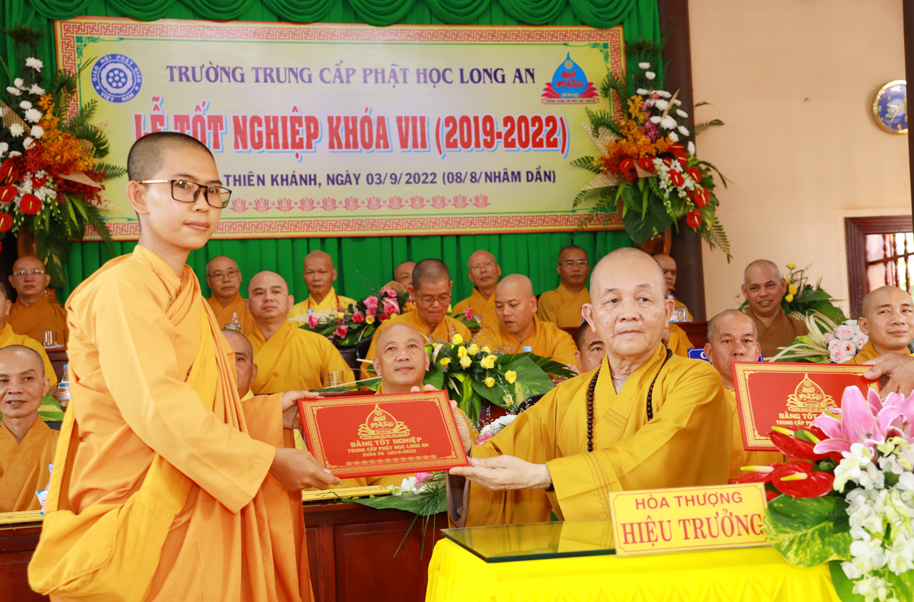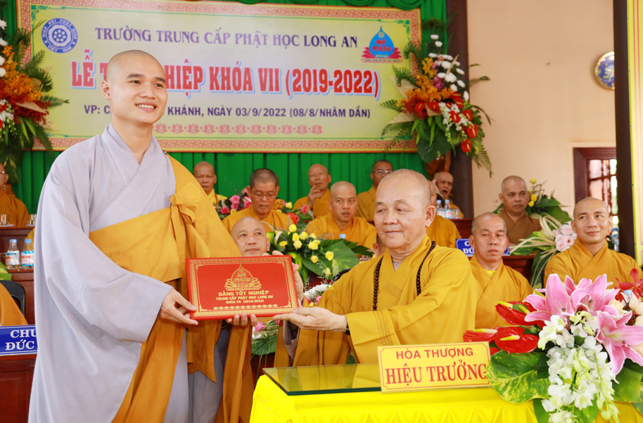 Buổi lễ được bắt đầu với nghi thức Phật giáo trang nghiêm. Sau phần giới thiệu, thay mặt Ban Giám Hiệu trường TCPH Long An, Thượng tọa Thích Lệ Trí – Phó Hiệu trưởng nhà trường báo cáo kết quả đào tạo học tập của khóa VII (2019-2022). Theo báo cáo, Lớp Trung cấp Phật học Khóa VII trãi qua ba năm đào tạo đã hoàn thành các học phần, có 63 vị đủ điều kiện tốt nghiệp và được nhận Bằng Tốt Nghiệp do Ban Giáo dục Phật giáo trung ương cấp.