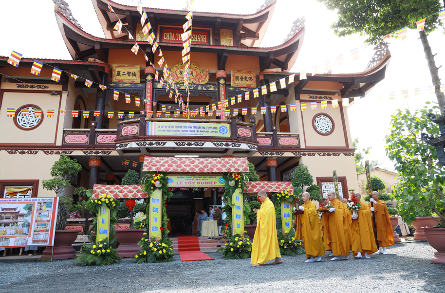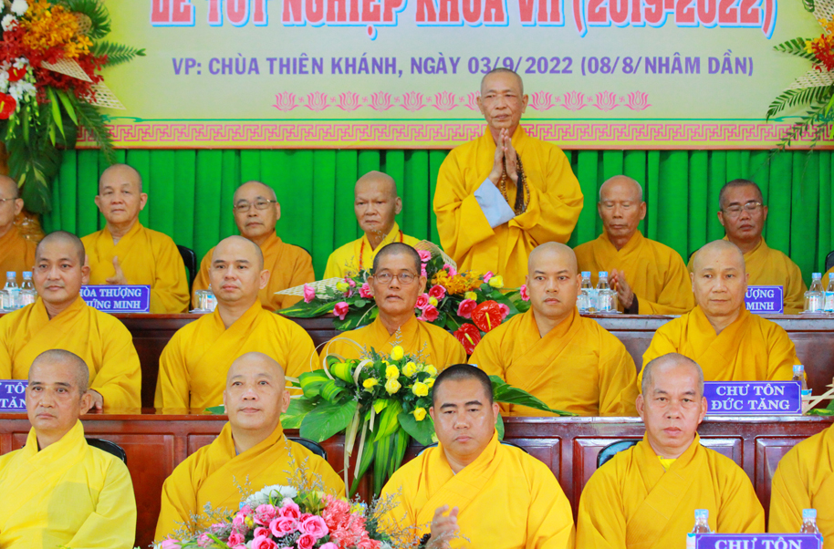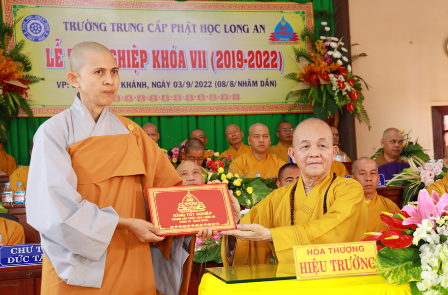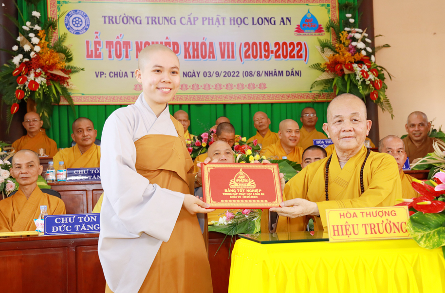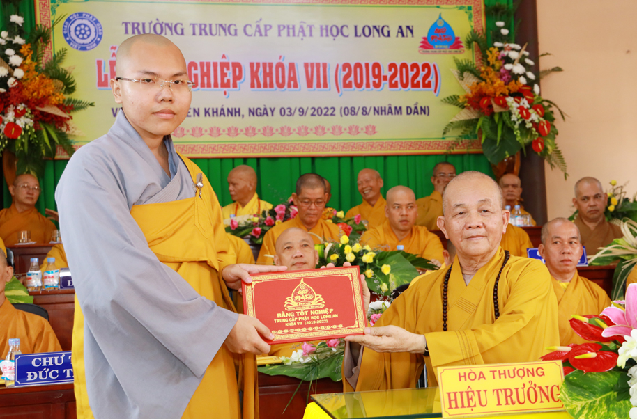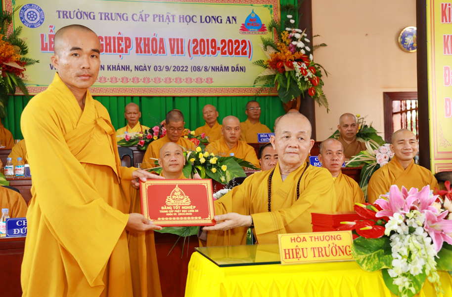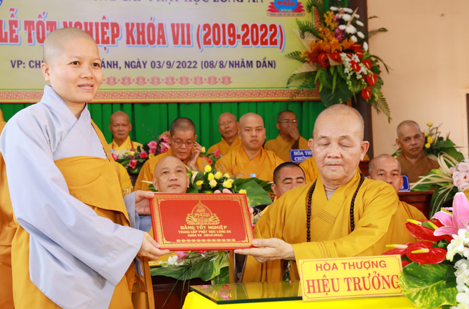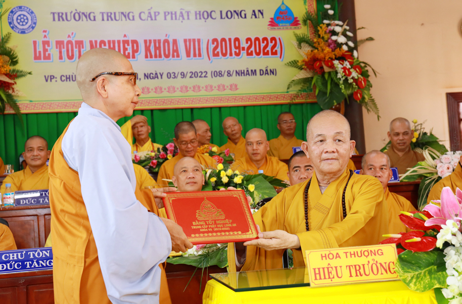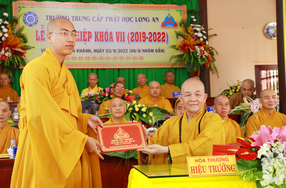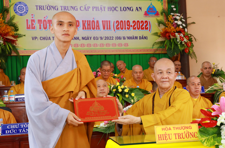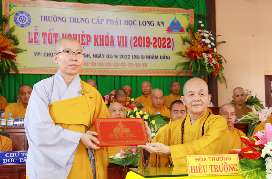 Buổi lễ được bắt đầu với nghi thức Phật giáo trang nghiêm. Sau phần giới thiệu, thay mặt Ban Giám Hiệu trường TCPH Long An, Thượng tọa Thích Lệ Trí – Phó Hiệu trưởng nhà trường báo cáo kết quả đào tạo học tập của khóa VII (2019-2022). Theo báo cáo, Lớp Trung cấp Phật học Khóa VII trãi qua ba năm đào tạo đã hoàn thành các học phần, có 63 vị đủ điều kiện tốt nghiệp và được nhận Bằng Tốt Nghiệp do Ban Giáo dục Phật giáo trung ương cấp.