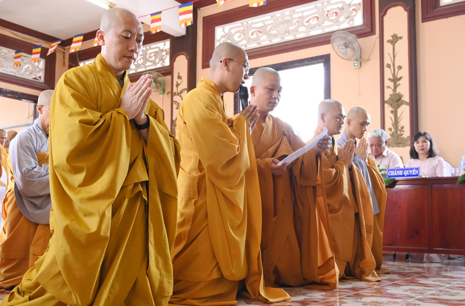 Sau đó, Đại đức Thích Thiện Danh – Phó Thư ký kiêm Chánh Văn phòng BTS GHPGVN tỉnh Long An tuyên đọc quyết định tặng bằng Tuyên Dương Công Đức và Bằng Công Đức đến Chư tôn đức, quý Giảng viên, quý Phật tử trong Ban Giáo thọ, Ban Bảo trợ.