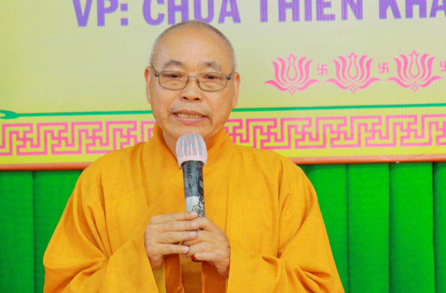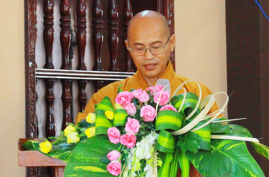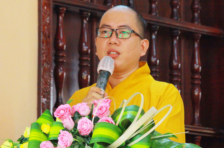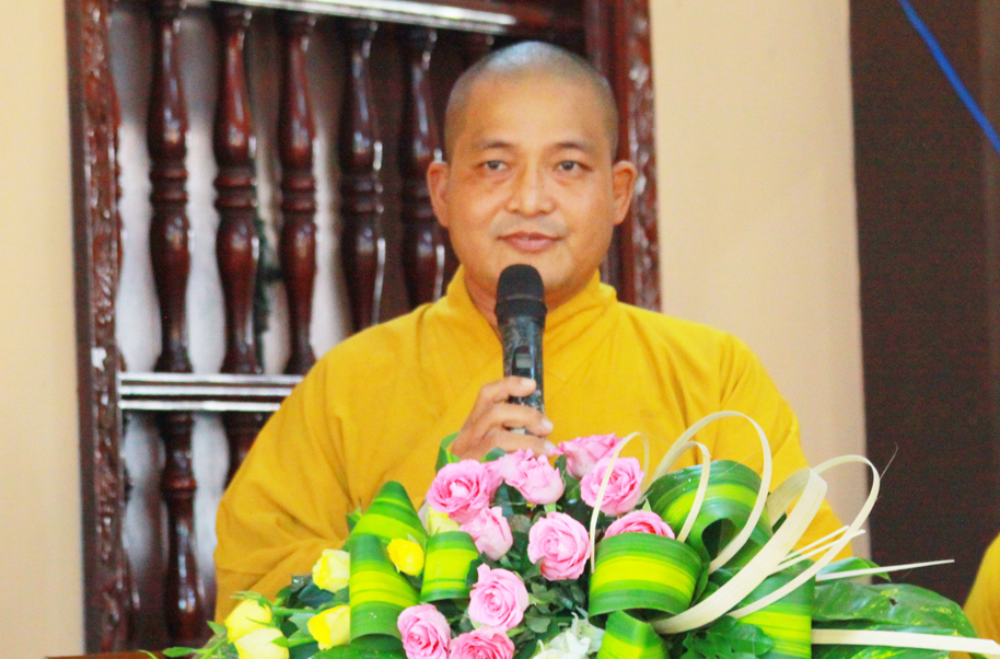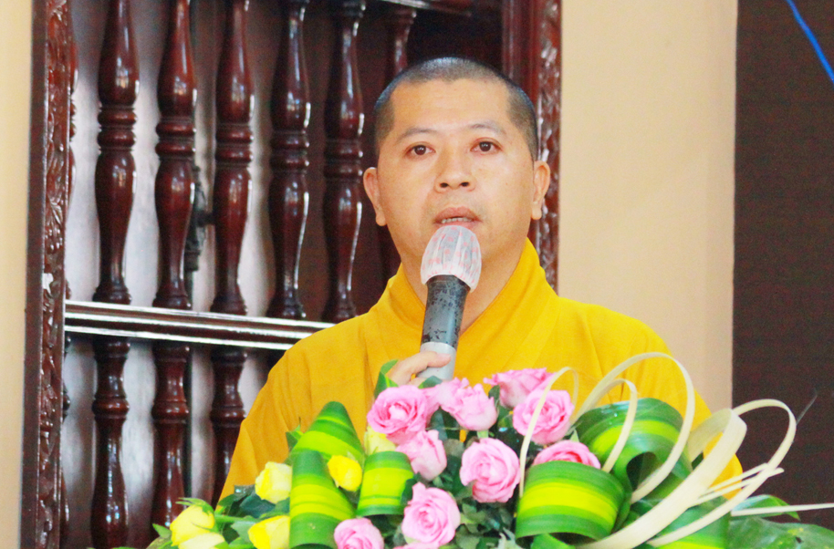 Đại diện Ban Giám Hiệu trường TCPH Long An, Đại đức Thích Lệ Trí phát biểu cảm tạ Chư Tôn Thiền đức thân lâm tham dự, chư vị mạnh thường quân các nhà hảo tâm, và chúc nguyện toàn thể sức khỏe dồi dào, Phật sự viên thành.