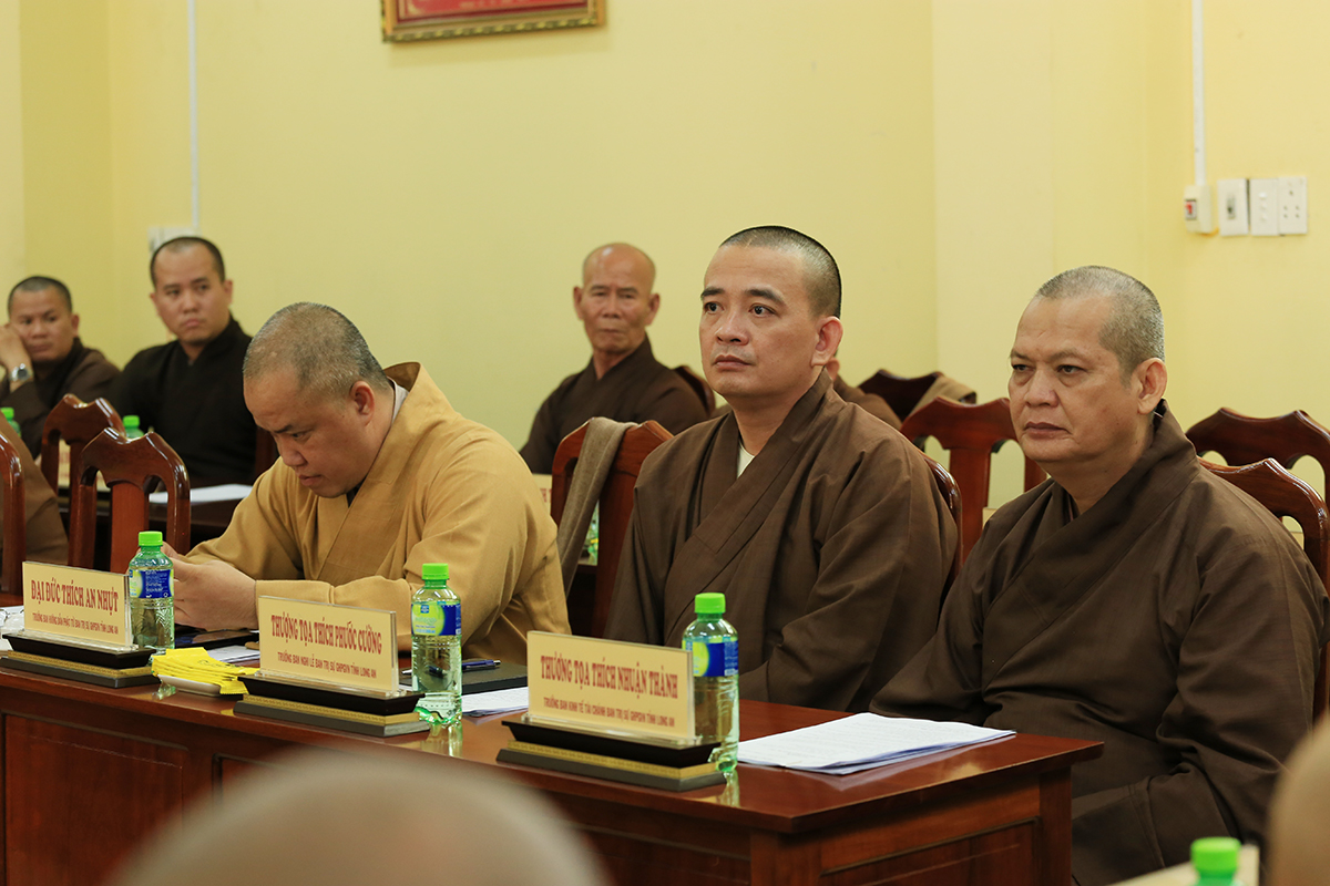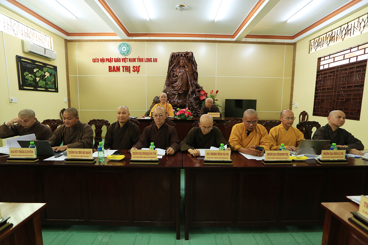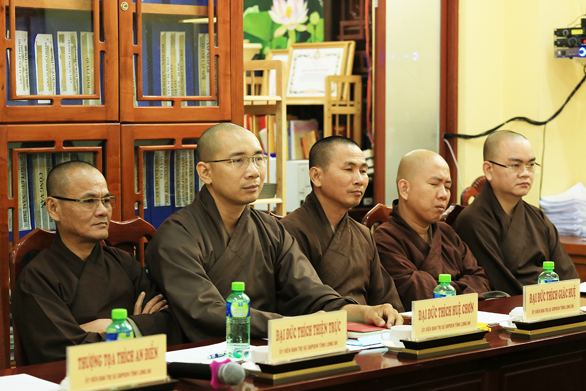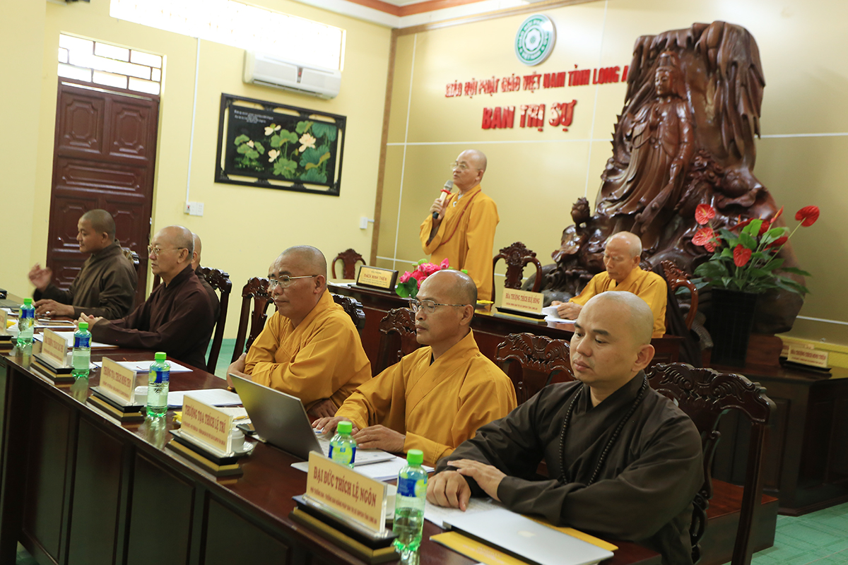 Sau khi thông qua chương trình phiên họp, Chư tôn đức Trưởng các Phân ban Hoằng pháp, Ban Văn Hóa Phật giáo tỉnh Long An đã báo các công tác Phật sự chuyên môn tại các huyện thị thuộc tỉnh, Ban Văn hóa đã thống nhất và báo cáo công tác tổ chức Đại gới đàn và pháp phục để phục vụ Đại giới đàn và Đại lễ Phật đản trong các khâu tôn thiết, trang trí dần hoàn thành, chuẩn bị tốt cho mọi thành tựu sắp đến. Văn phòng thư ký đã báo cáo về số lượng hồ sơ đã tiếp nhận, đồng thời hướng dẫn về quá trình chuẩn bị hồ sơ, bồi dưỡng về kiến thức hành chánh công tác giáo hội sắp đến để chư tôn đức được nắm bắt và thụ lý hồ sơ được tốt hơn
