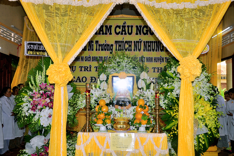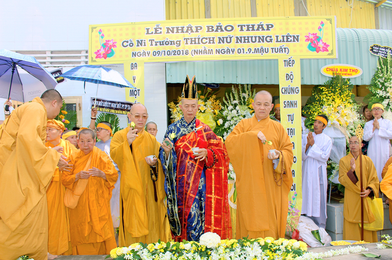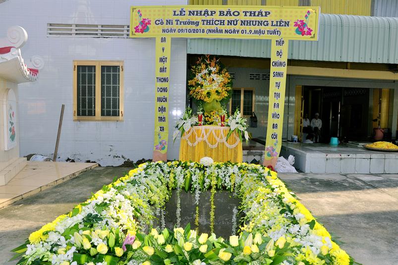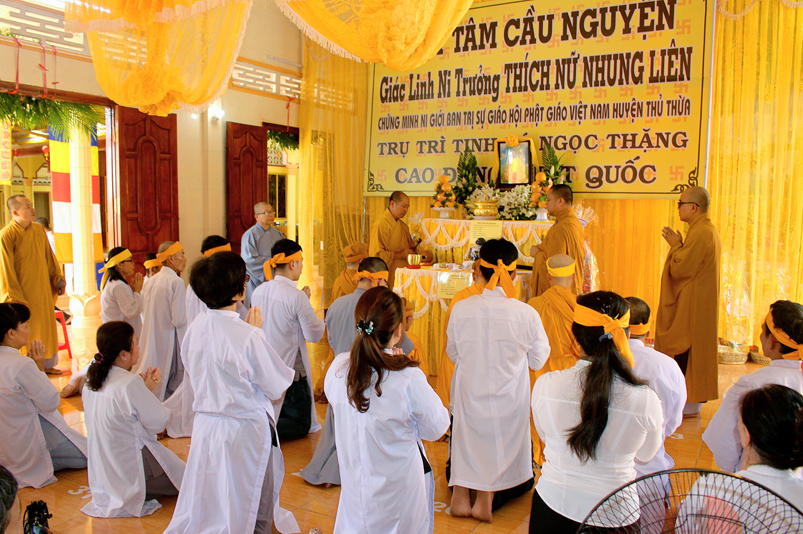 Sáng ngày 9 tháng 10 năm 2018 (1/ 09/ Mậu Tuất), tại giác linh đường tôn trí kim quan cố Ni Trưởng Thích Nữ Nhung Liên– Chứng minh Ni giới Ban Trị Sự GHPGVN huyện Thủ Thừa,Trụ trì Tịnh Xá Ngọc Thặng, thị trấn Thủ Thừa, huyện Thủ Thừa, tỉnh Long An. Ban Tổ chức lễ tang cùng Môn đồ pháp quyến đã trang nghiêm cử hành lễ truy niệm và phụng tống kim quan nhập bảo tháp.