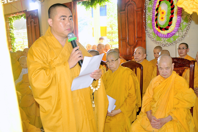 Đại đức Thích Hoá Minh thay mặt toàn thể Chư tôn đức trong thường trực Ban trị sự GHPGVN huyện đã có lời điếu văn truy niệm, bái biệt bậc long tượng của Ni giới huyện Thủ Thừa có nhiều đóng góp to lớn trọng sự nghiệp hoằng dương Chánh pháp của Phật giáo huyện nhà.