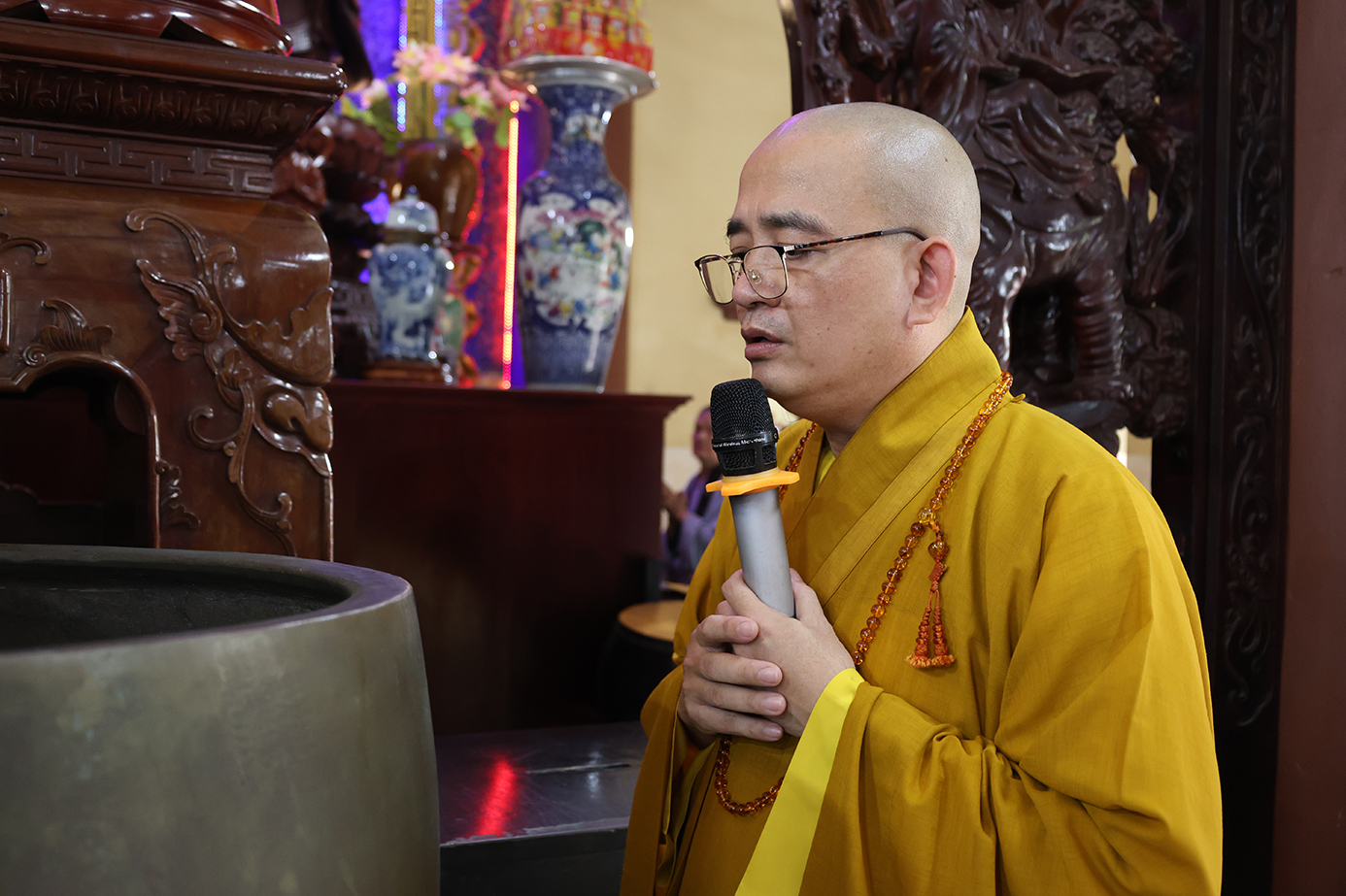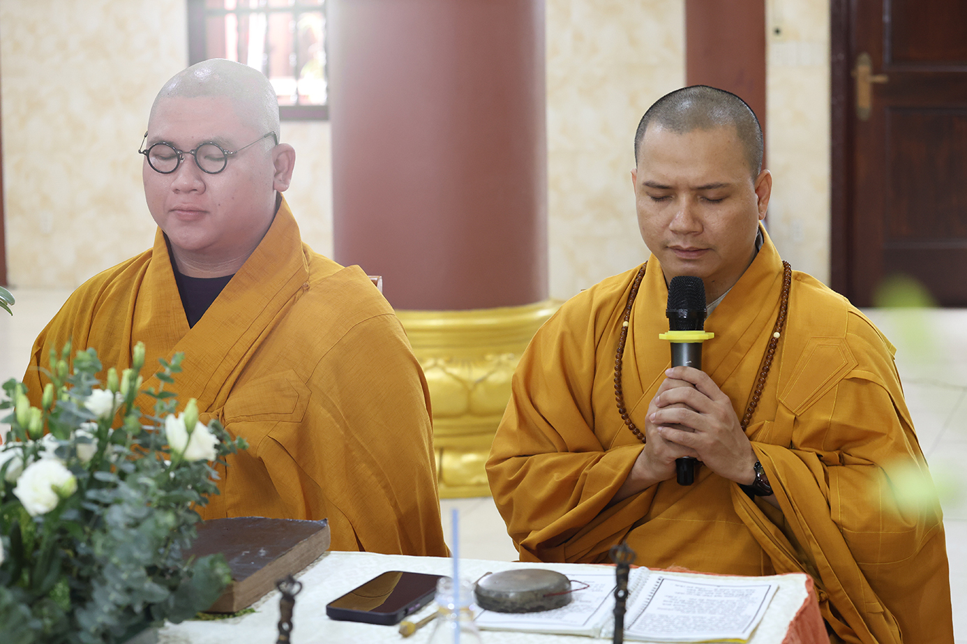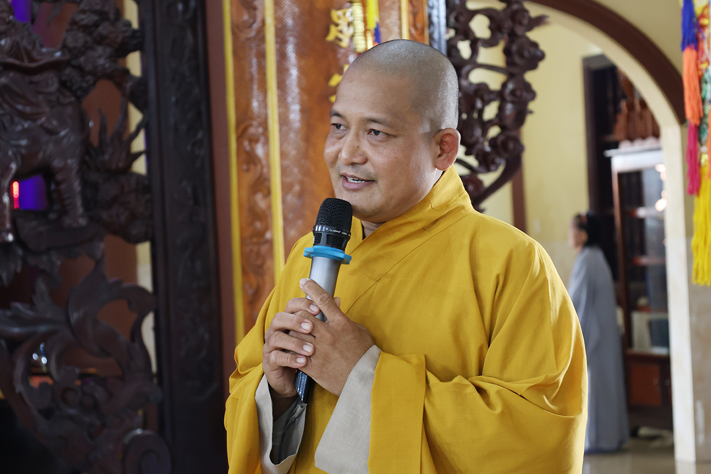 Đại đức Thích Lệ Duyên – Phó Trưởng ban kiêm Chánh Thư ký BTS GHPGVN tỉnh Long An ổn định hội trường, điều phối thực hiện nghi thức chào cờ và thông qua chương trình buổi lễ.