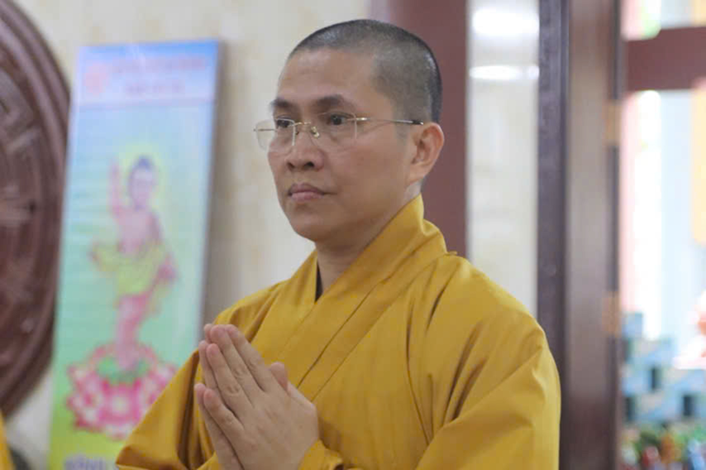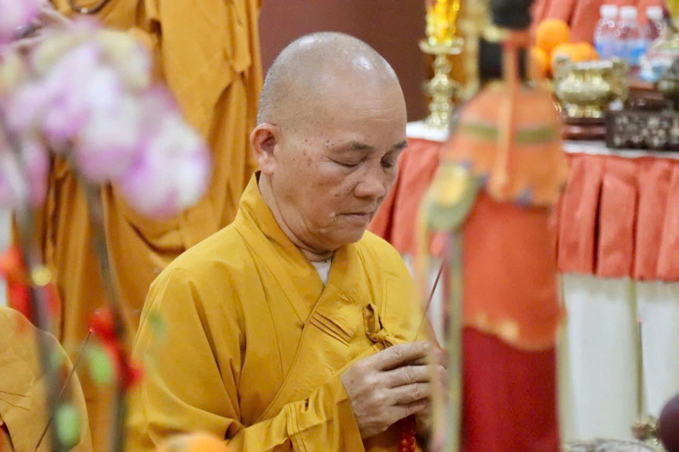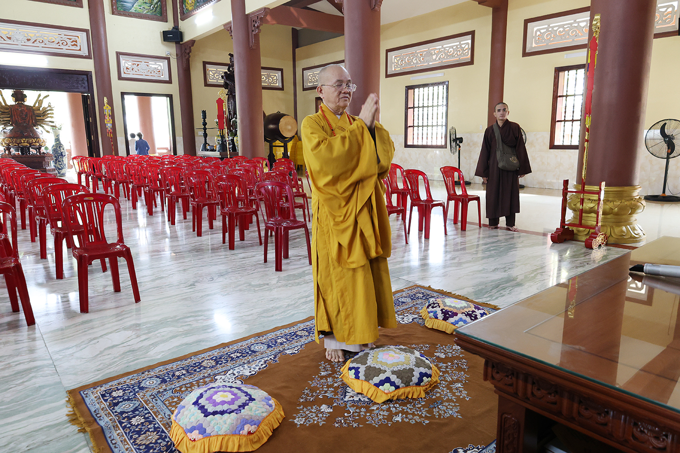 Đại đức Thích Lệ Duyên – Phó Trưởng ban kiêm Chánh Thư ký BTS GHPGVN tỉnh Long An ổn định hội trường, điều phối thực hiện nghi thức chào cờ và thông qua chương trình buổi lễ.