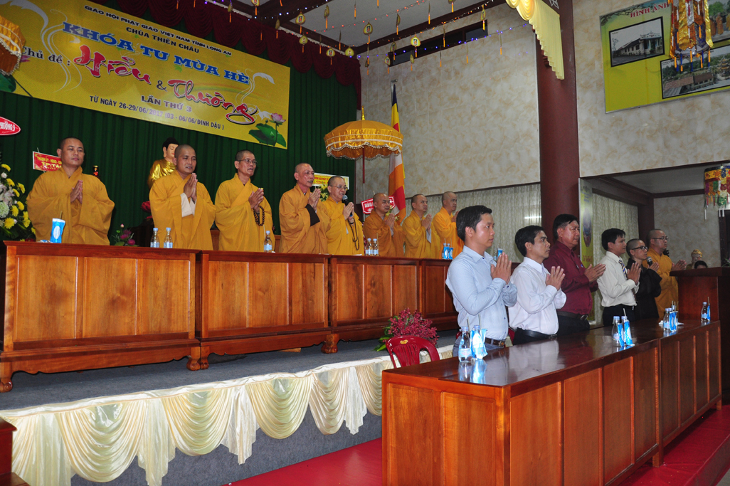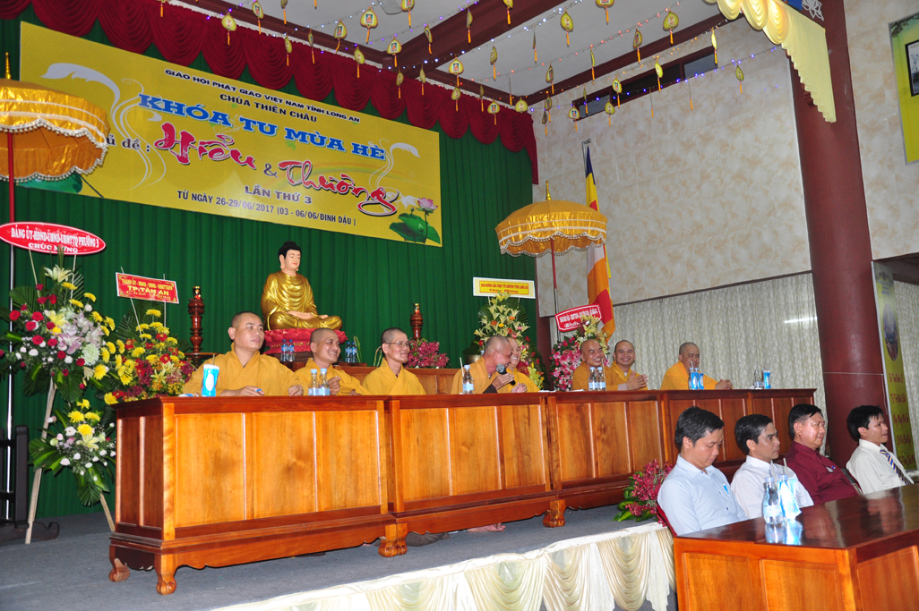 Trong ngày Lễ khai mạc Ban tổ chức được sự thân lâm tham dự của Chư Tôn Đức Ban Trị sự GHPGVN tỉnh Long An; Chư Tôn Đức Tăng Ni Ban Trị sự GHPGVN huyện, TX, TP và Chư Tôn Đức Tăng Ni trụ trì các tự viện trong tỉnh. Khoá sinh được lắng nghe lời đạo từ của HT. Thích Minh Thiện (Ủy viên HĐTS TW GHPGVN, Phó Ban Hoằng pháp TW GHPGVN, Trưởng Ban Trị sự GHPGVN tỉnh Long An). Ban tổ chức cũng được tiếp đoán quí vị lãnh đạo Ban Dân Vận Tỉnh ủy, UBMTTQVN, Ban Tôn giáo tỉnh Long An; UBMTTQ, Phòng Nội Vụ Tp. Tân An, UBND phường 3. Ban tổ chức và khóa sinh được lắng nghe lời phát biểu của bà Phạm Ngọc Tiệp (Phó Chủ tịch UBMTTQVN tỉnh Long An).