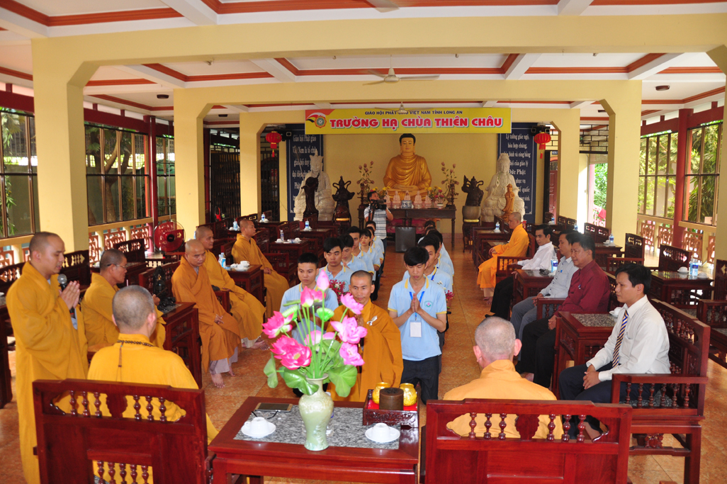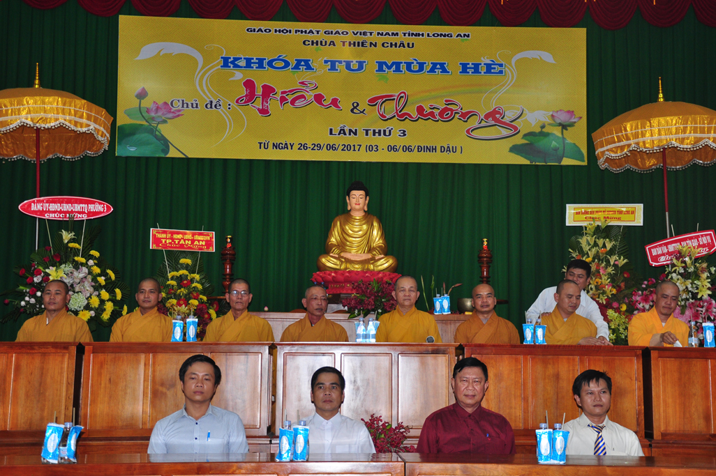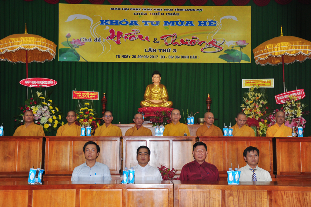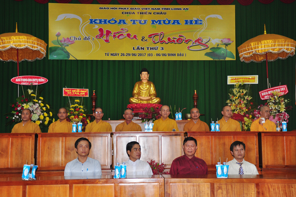 Quang lâm chứng minh tham dự có chư tôn đức giáo phẩm: HT. Thích Thiện Huệ- Chứng minh Ban trị sự GHPGVN tỉnh Long An; HT. Thích Minh Thiện- UVHĐTSTƯ, Phó ban Hoằng pháp trung ương, Trưởng Ban trị sự GHPGVN tỉnh Long An, Trụ trì chùa Thiên Châu, Trưởng Ban tổ chức khoá tu; ĐĐ. Thích An Nhựt- Trưởng Ban Hướng dẫn Phật tử GHPGVN tỉnh Long An; ĐĐ. Thích Lệ Duyên- Thư ký Ban Tăng sự GHPGVN tỉnh Long An; ĐĐ. Thích Lệ Ngôn – Phó văn phòng học viện Phật giáo Việt Nam tại Tp HCM; TT. Thích Lệ Tấn- Phó thường trực BTS. GHPGVN liên huyện Tân Thạnh-TX Kiến Tường- Vĩnh Hưng . Tp. HCM cùng Chư tôn đức ban trị sự tỉnh, huyện đồng và quý phụ huynh khoá sinh khoá tu mùa hè về tham dự.