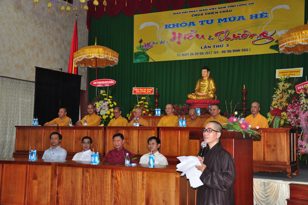Tại buổi lễ sau nghi thức niệm Phật cầu gia hộ, tuyên bố lý do, giới thiệu thành tham dự. ĐĐ. Thích Huệ Chơn thay mặt ban tổ chức báo cáo kết quả khoá tu.Theo báo cáo Khóa tu mùa hè năm 2017 dành cho Thanh thiếu niên Phật tử trong thời gian tu học 4 ngày, kể từ ngày 26 đến ngày 29/6/2017 (nhằm ngày 03 đến 06/6/Đinh dậu). Chủ đề của Khóa tu mùa hè lần 3 năm 2017 là “Hiểu và Thương”, với mục đích đưa đạo Phật đến gần hơn với thế hệ Thanh thiếu niên giúp các em tiếp cận giáo lý của đạo Phật; hiểu rõ truyền thống Văn hóa – Dân tộc; nuôi dưỡng tâm Từ bi – Hỷ xã; hiếu kính với ông bà cha mẹ. .v.v.. Đồng thời, tạo điều kiện cho các em được giao lưu, chia sẻ, tiếp cận kỹ năng sống nhằm hoàn thiện bản thân.
