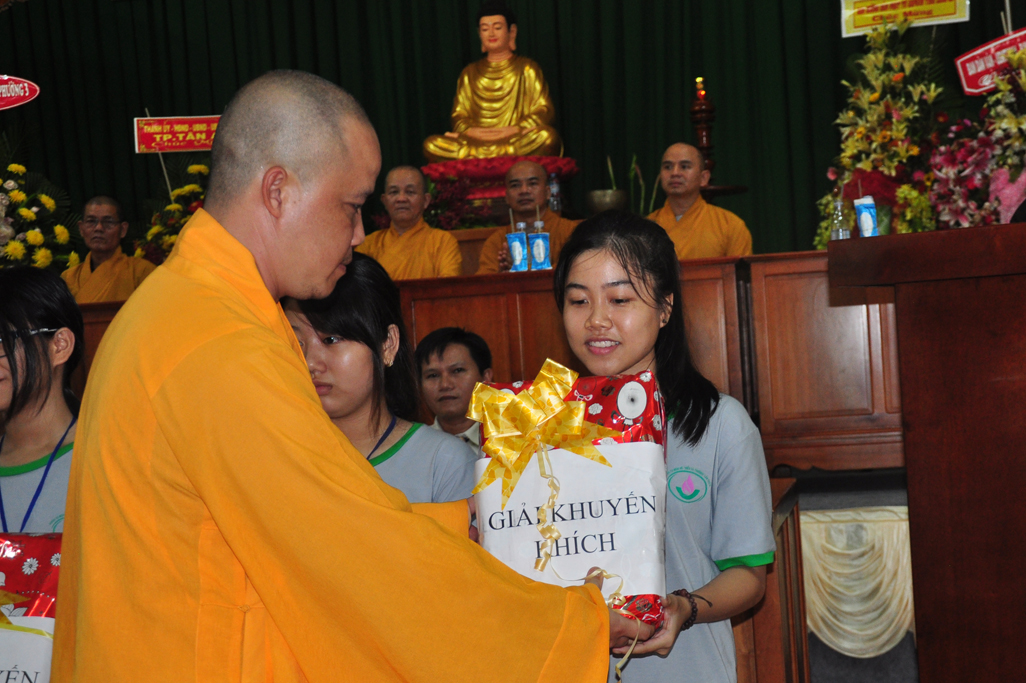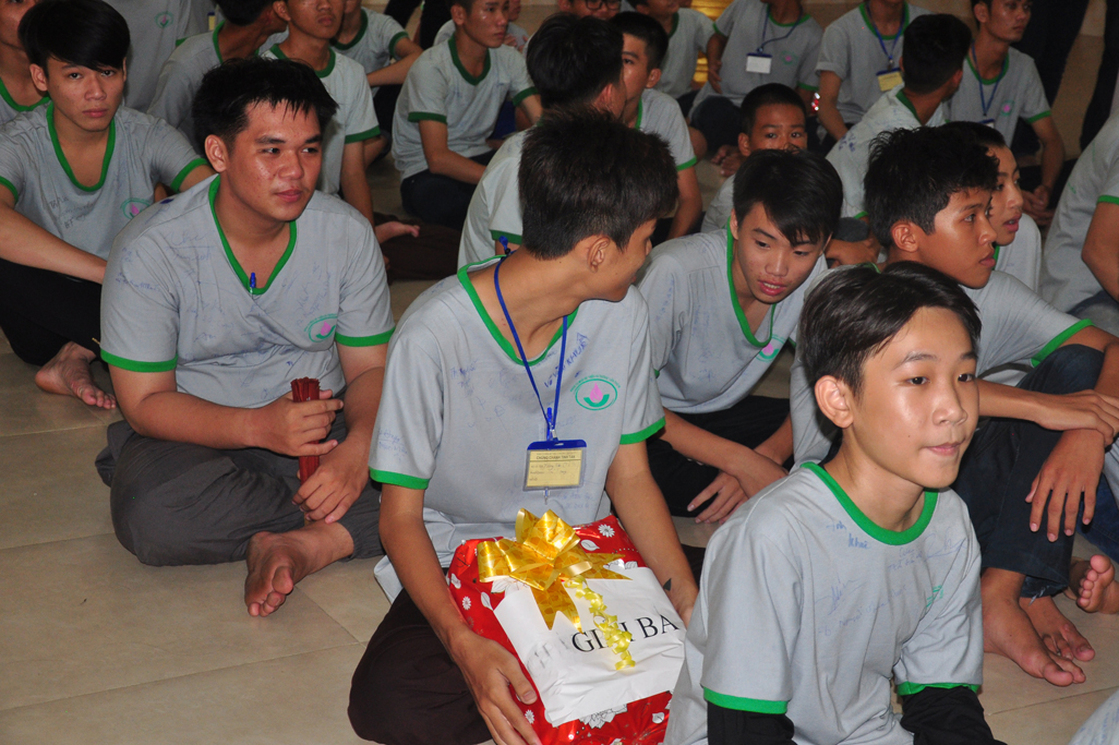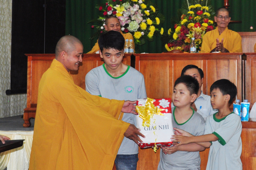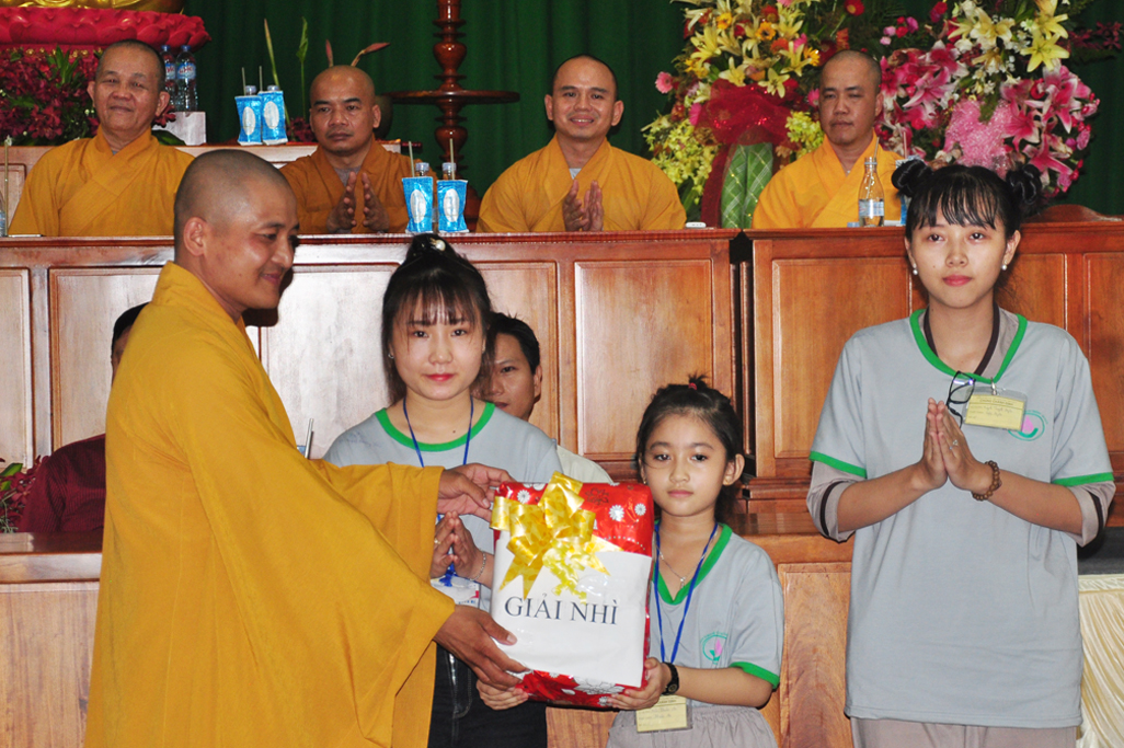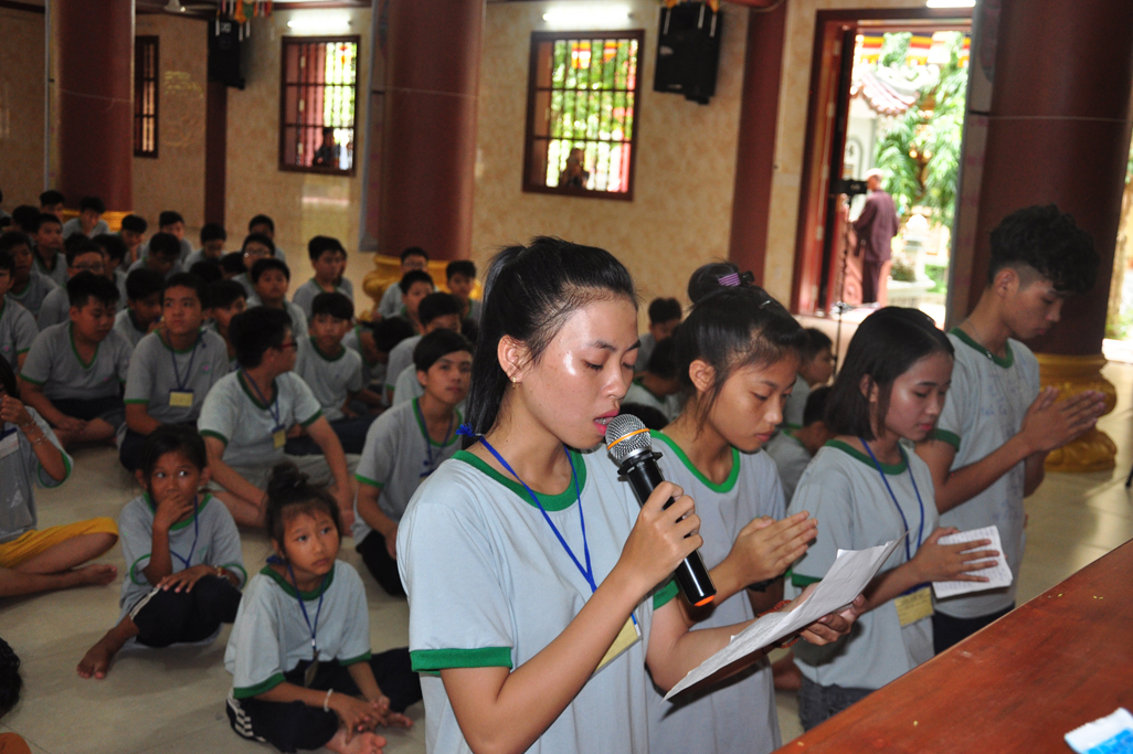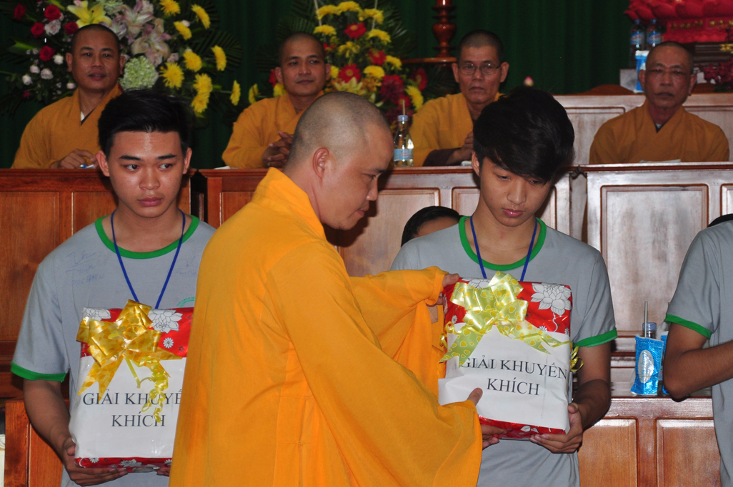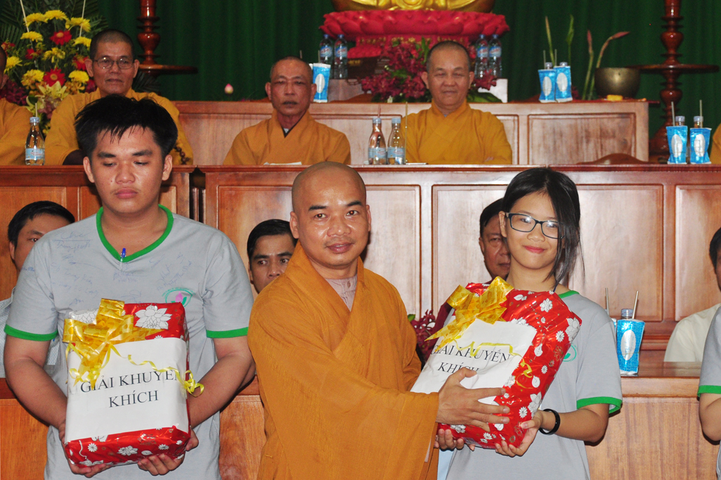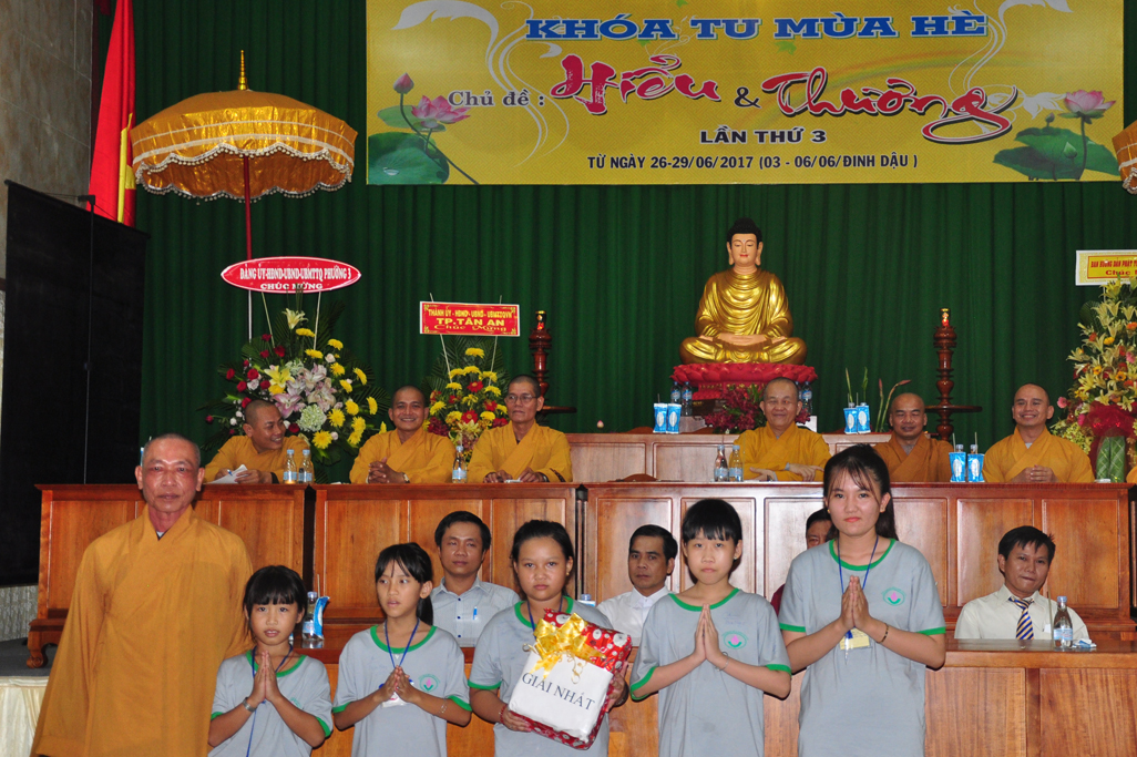 Tiếp theo đó Đại Đức Thích An Tấn thay mặt ban điều phối chương trình mời các em phát biểu cảm tưởng tri ân chư Tôn đức tổ chức khoá tu và tri ân cha mẹ thông qua phát thưởng cho các tập thể, cá nhân tốt trong khoá tu. Tiếp ĐĐ. Thích An Tấn cung thỉnh Chư tôn đức chứng minh và quý vị lãnh đạo Chính Quyền phát thưởng cho các em.