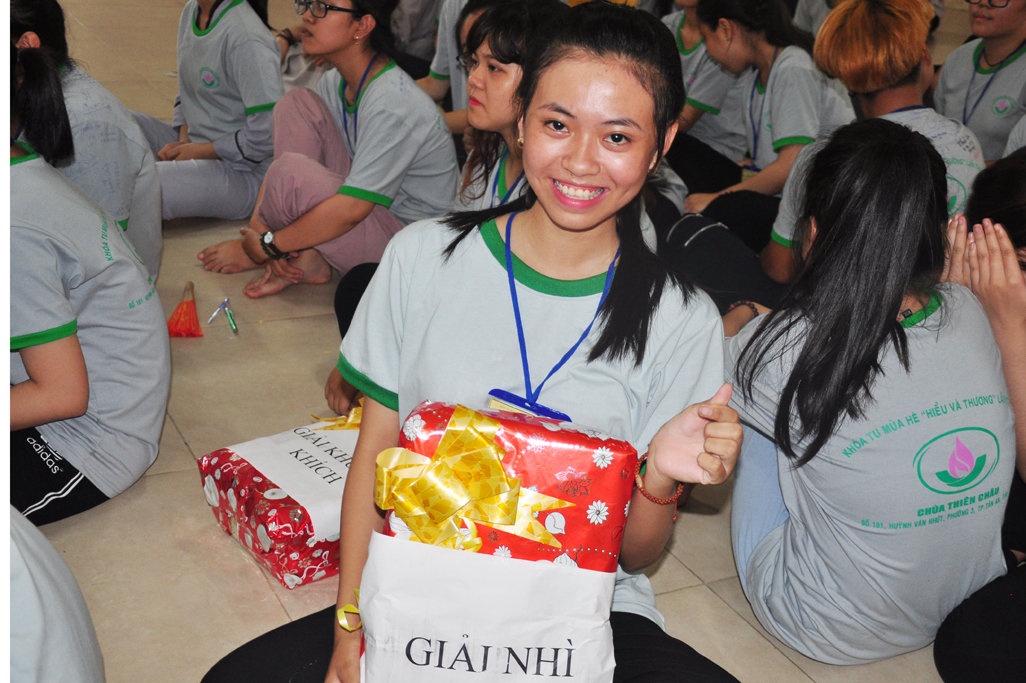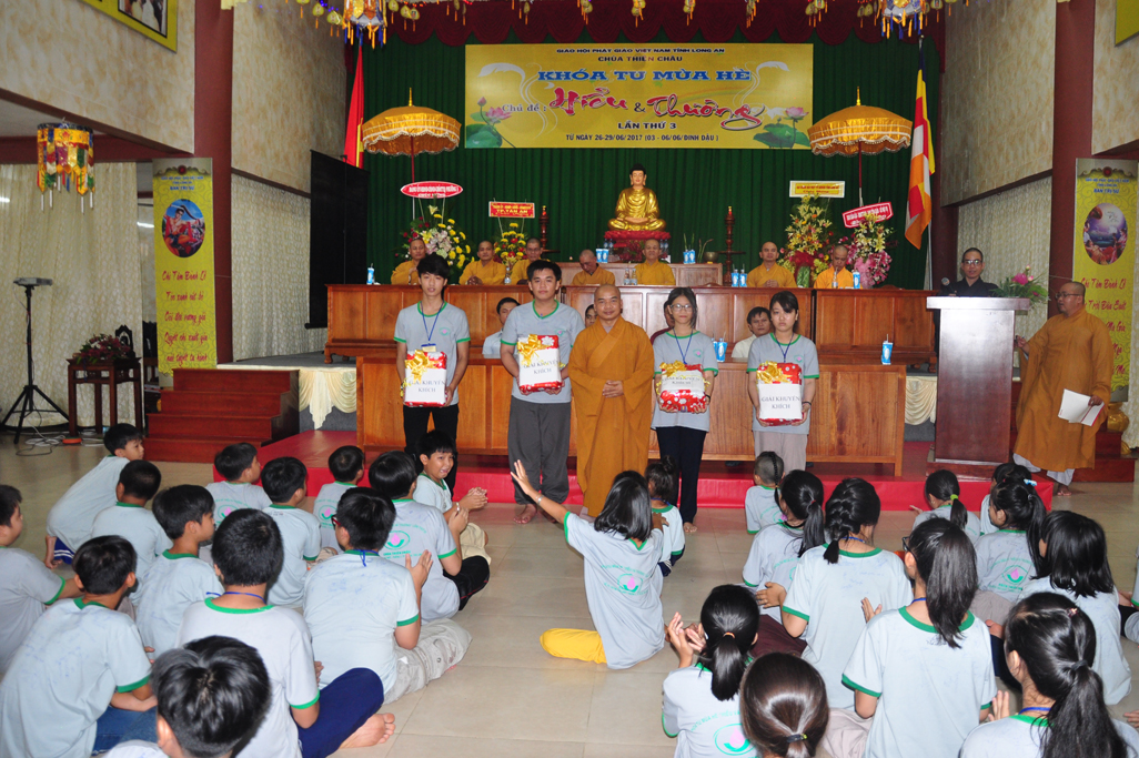 Ban tổ chức đã chọn 03 bài viết tiêu biểu về cảm tưởng khóa tu để cấp phát 03 phần thưởng cho các em và 06 chúng đạt được tổng số điểm cao nhất trong 5 trò chơi nhỏ gồm có (học Phật pháp; học oai nghi; học pháp khí; học văn nghệ và các tiểu trò chơi).