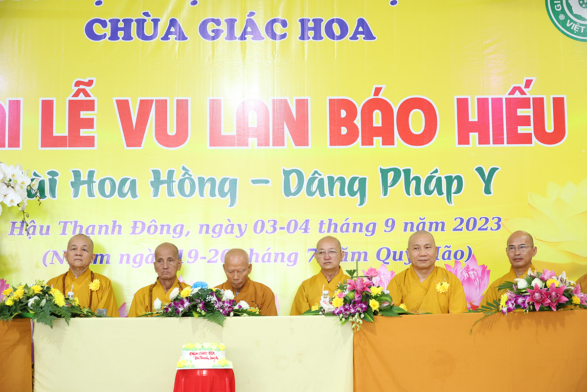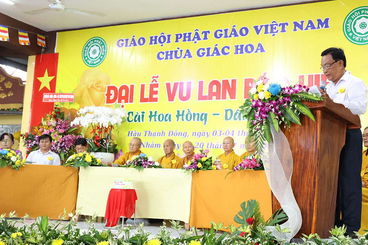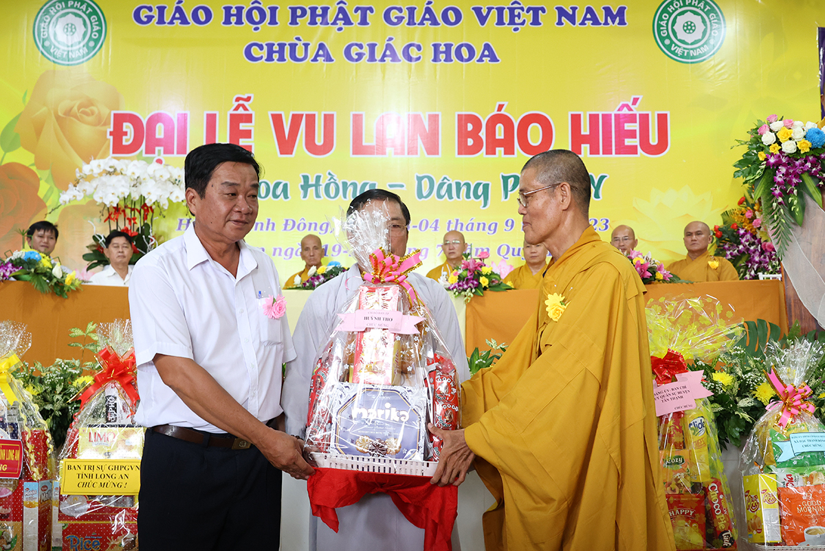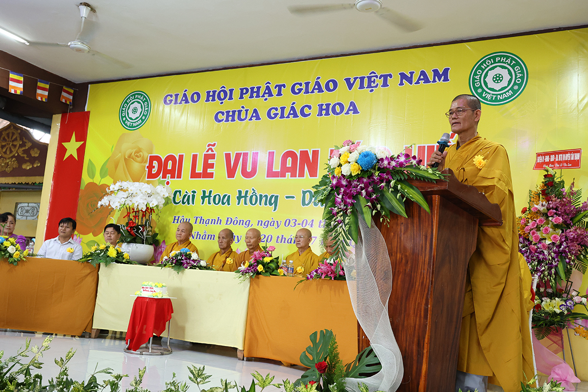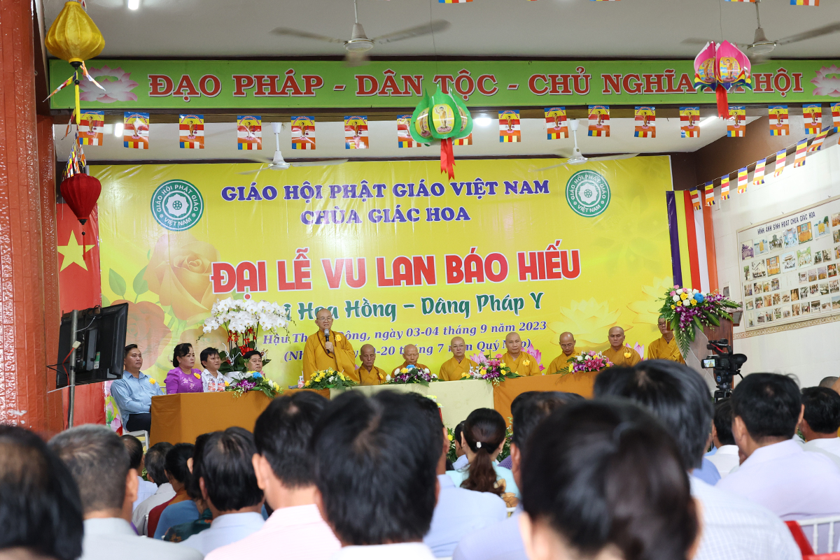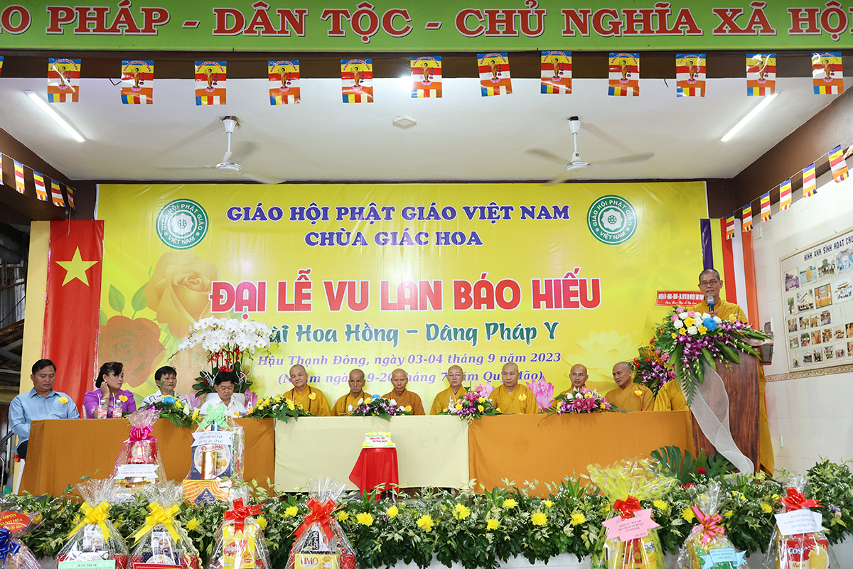 Ban đạo từ tại buổi lễ, Hòa Thượng Thích Minh Thiện – Ủy Viên HĐTS, Phó trưởng Ban Hoằng pháp TƯ, Trưởng BTS GHPGVN tỉnh Long An đã tán dương công đức Thượng tọa trụ trì chùa Giác Hoa trên tinh thần hiếu đạo đã hướng dẫn Phật tử đạo tràng tổ chức đại lễ Vu lan báo hiếu để nhớ ơn đến ân sinh dưỡng của hai đấng sinh thành cha và mẹ. Hòa thượng cũng chia sẻ về ý nghĩa tứ trọng ân, khuyến tấn Phật tử thực tập hạnh hiếu, sống và làm việc có ý nghĩa để xứng đáng là một người con Phật.