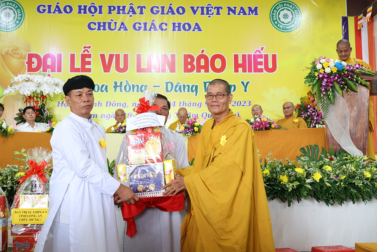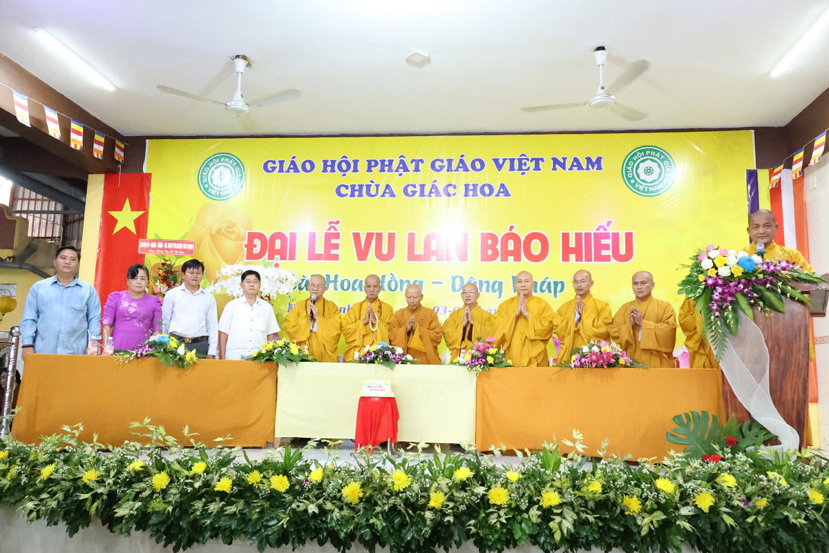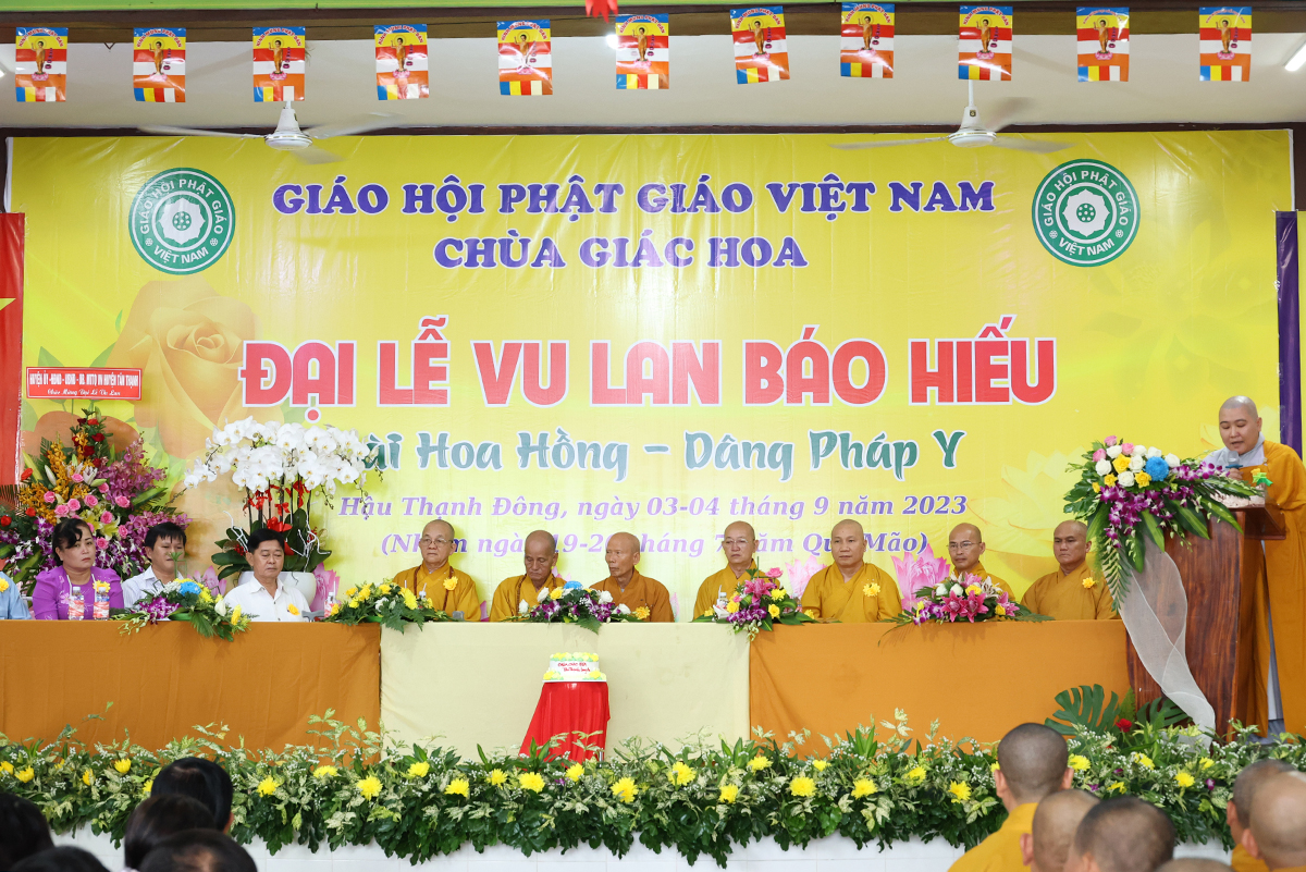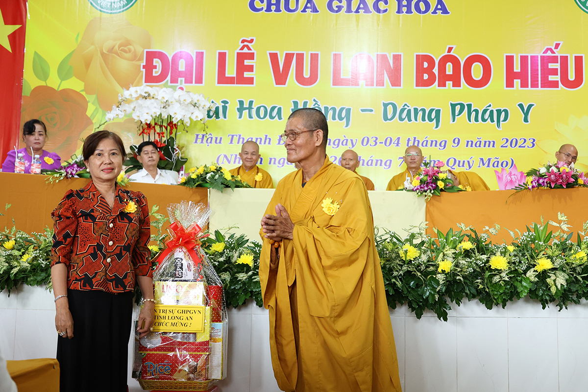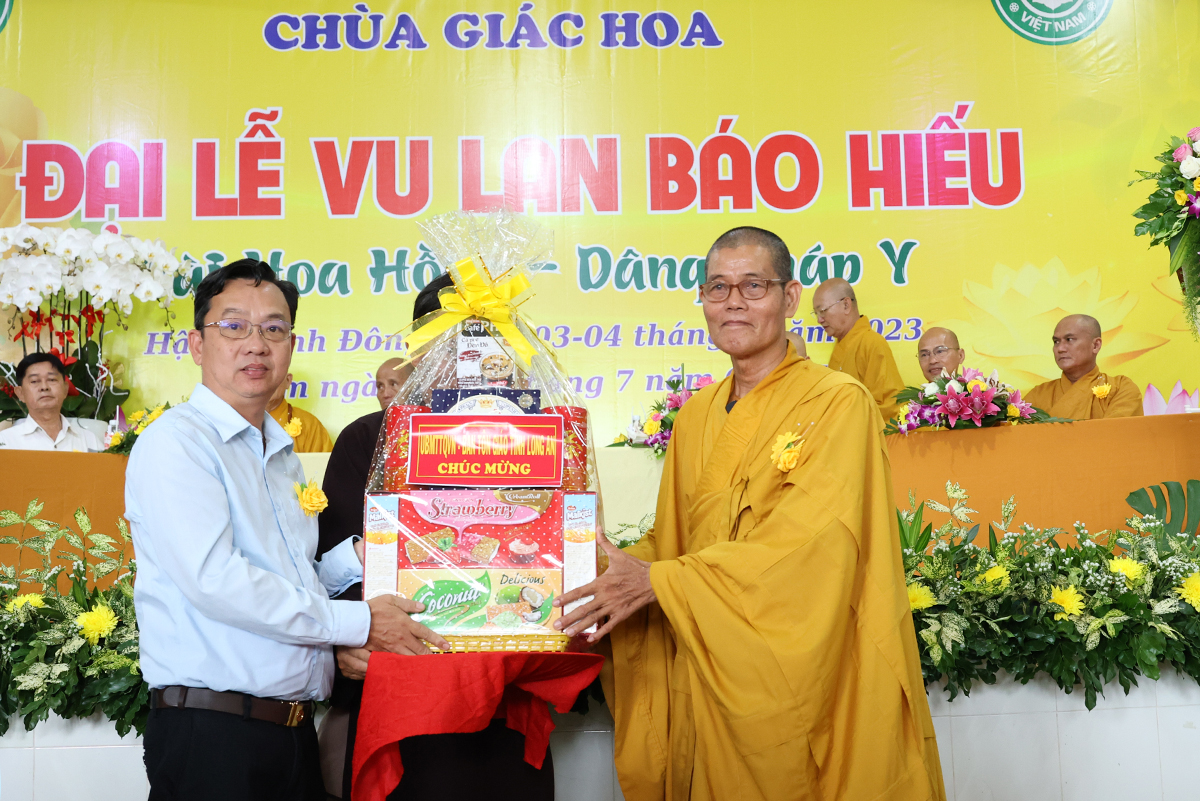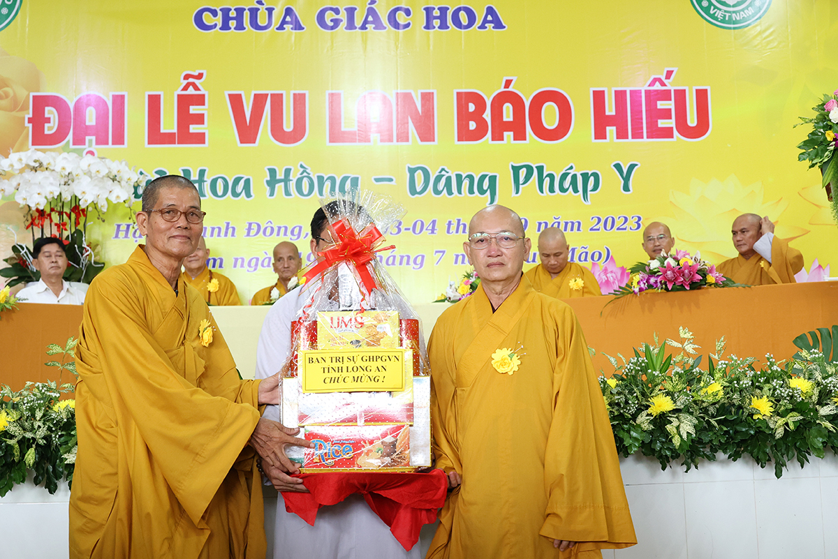Ban đạo từ tại buổi lễ, Hòa Thượng Thích Minh Thiện – Ủy Viên HĐTS, Phó trưởng Ban Hoằng pháp TƯ, Trưởng BTS GHPGVN tỉnh Long An đã tán dương công đức Thượng tọa trụ trì chùa Giác Hoa trên tinh thần hiếu đạo đã hướng dẫn Phật tử đạo tràng tổ chức đại lễ Vu lan báo hiếu để nhớ ơn đến ân sinh dưỡng của hai đấng sinh thành cha và mẹ. Hòa thượng cũng chia sẻ về ý nghĩa tứ trọng ân, khuyến tấn Phật tử thực tập hạnh hiếu, sống và làm việc có ý nghĩa để xứng đáng là một người con Phật.