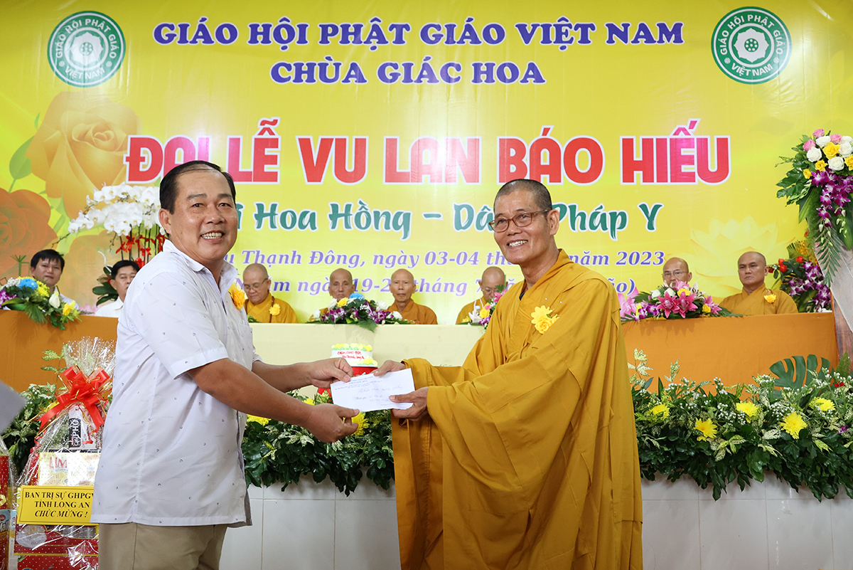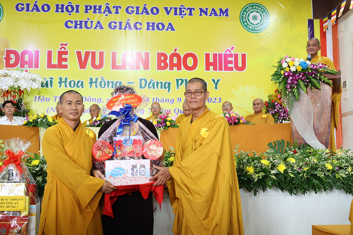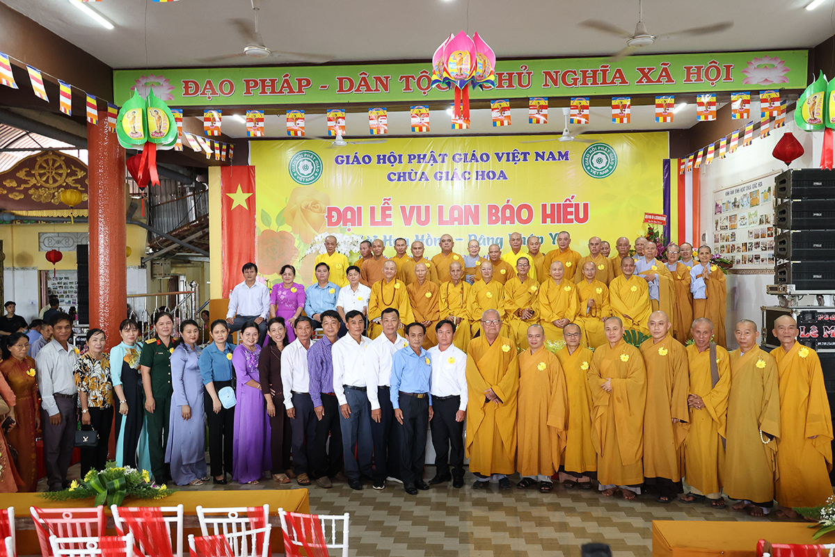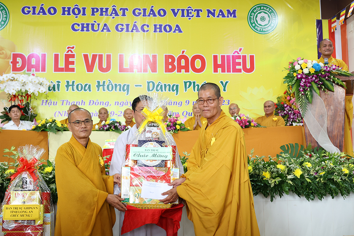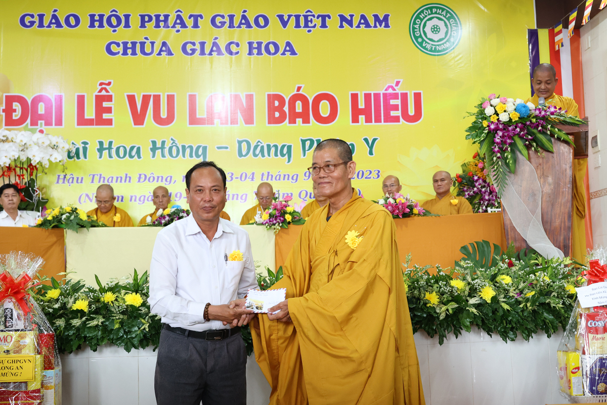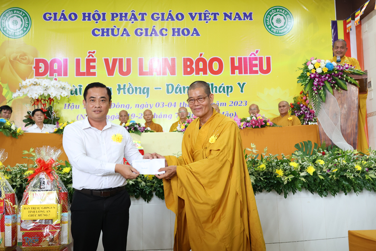 Ban đạo từ tại buổi lễ, Hòa Thượng Thích Minh Thiện – Ủy Viên HĐTS, Phó trưởng Ban Hoằng pháp TƯ, Trưởng BTS GHPGVN tỉnh Long An đã tán dương công đức Thượng tọa trụ trì chùa Giác Hoa trên tinh thần hiếu đạo đã hướng dẫn Phật tử đạo tràng tổ chức đại lễ Vu lan báo hiếu để nhớ ơn đến ân sinh dưỡng của hai đấng sinh thành cha và mẹ. Hòa thượng cũng chia sẻ về ý nghĩa tứ trọng ân, khuyến tấn Phật tử thực tập hạnh hiếu, sống và làm việc có ý nghĩa để xứng đáng là một người con Phật.