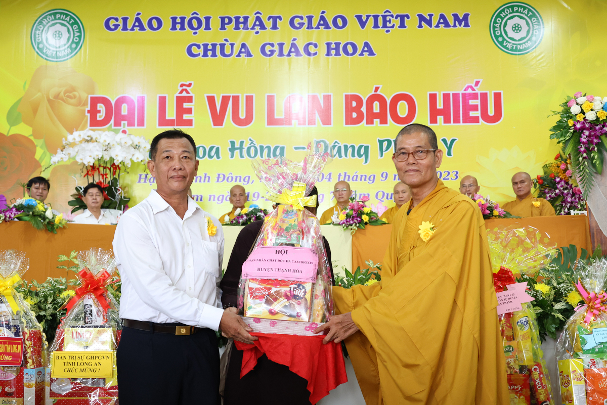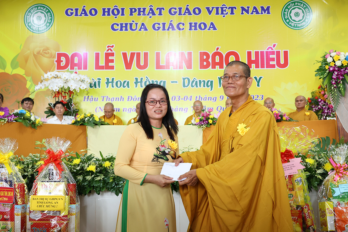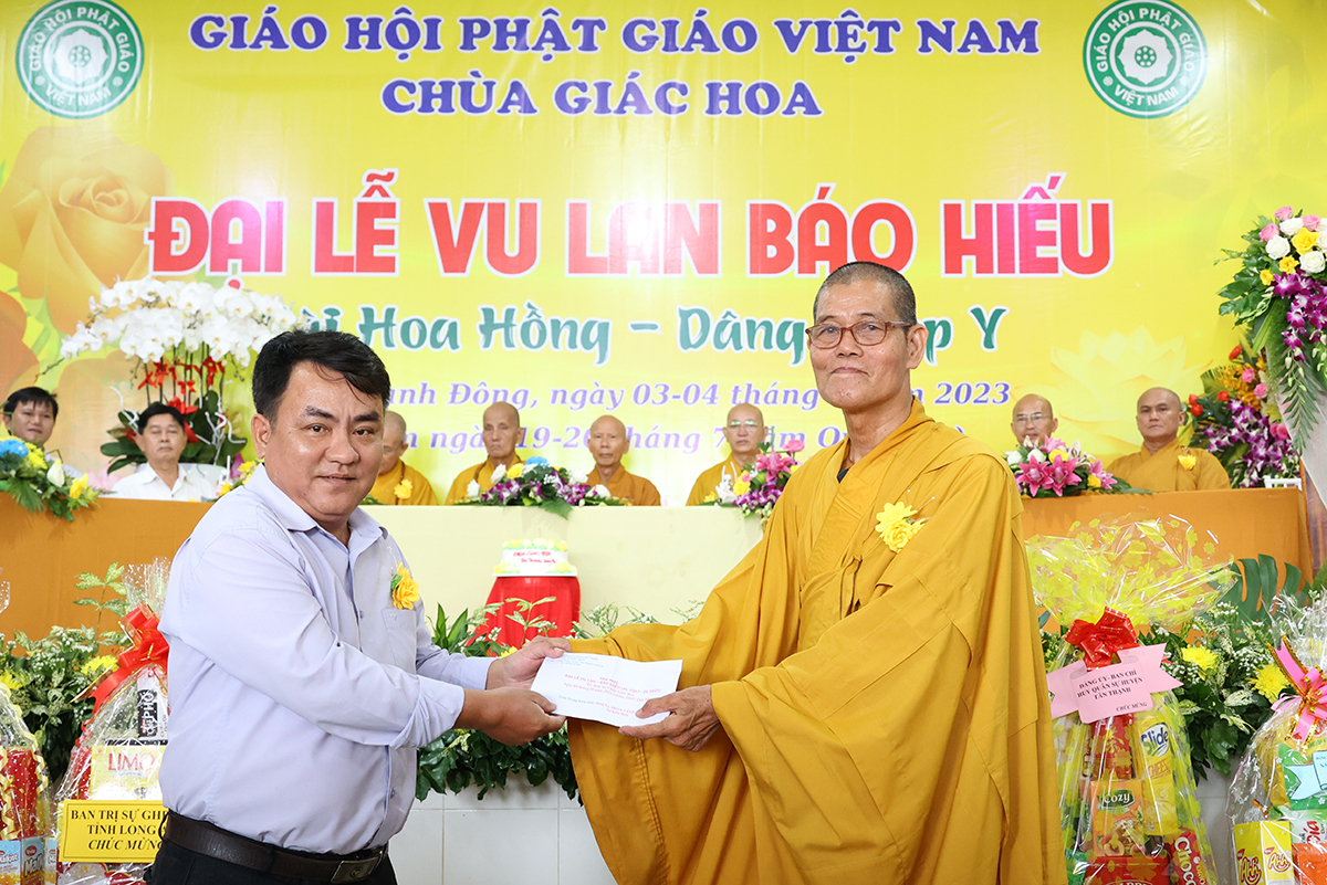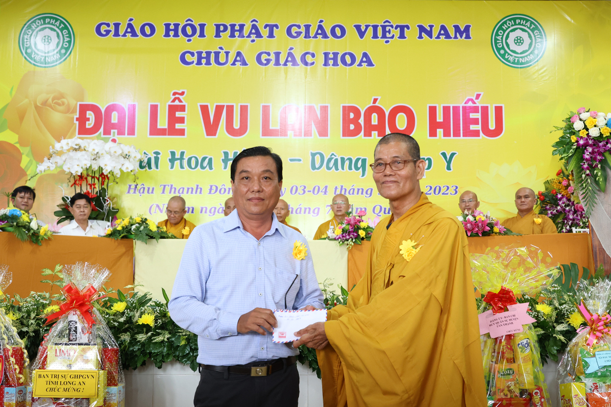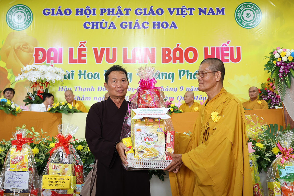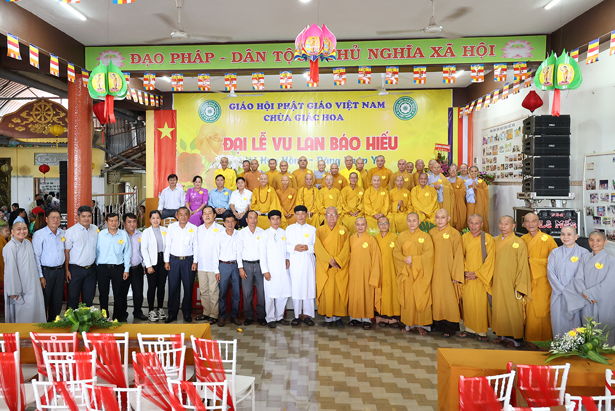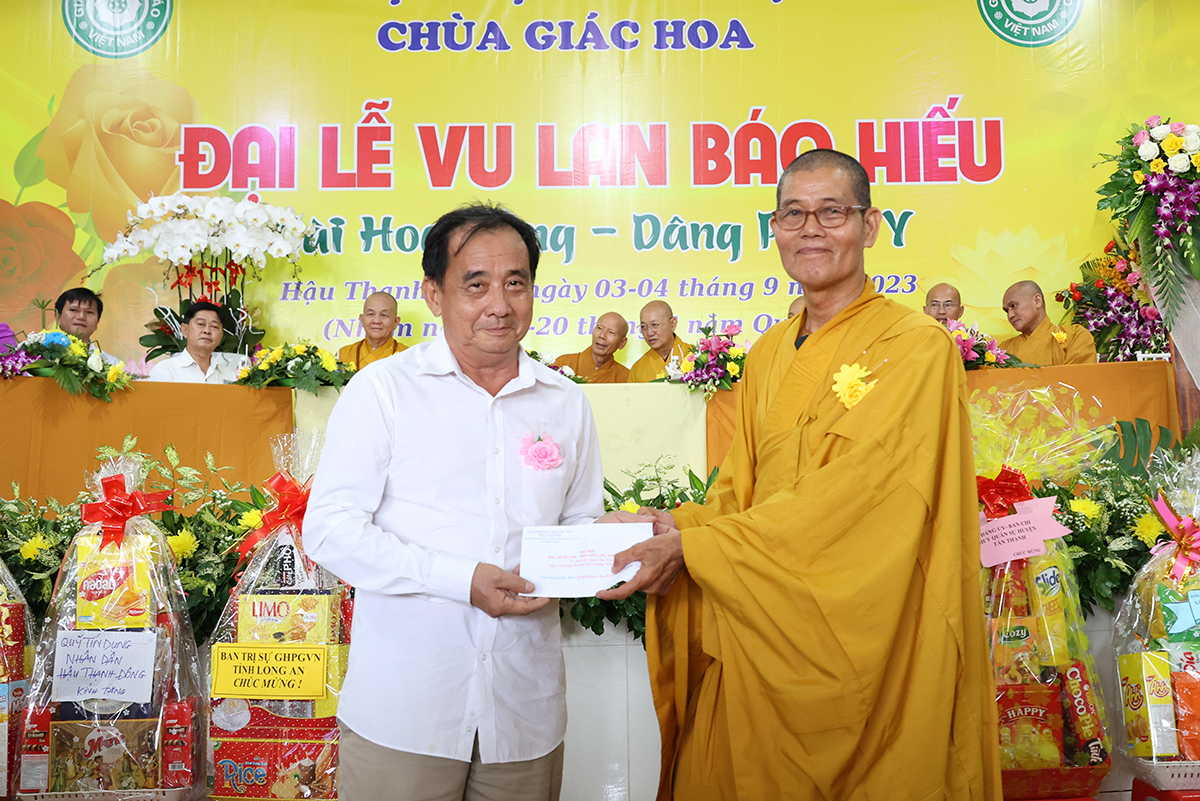 Ban đạo từ tại buổi lễ, Hòa Thượng Thích Minh Thiện – Ủy Viên HĐTS, Phó trưởng Ban Hoằng pháp TƯ, Trưởng BTS GHPGVN tỉnh Long An đã tán dương công đức Thượng tọa trụ trì chùa Giác Hoa trên tinh thần hiếu đạo đã hướng dẫn Phật tử đạo tràng tổ chức đại lễ Vu lan báo hiếu để nhớ ơn đến ân sinh dưỡng của hai đấng sinh thành cha và mẹ. Hòa thượng cũng chia sẻ về ý nghĩa tứ trọng ân, khuyến tấn Phật tử thực tập hạnh hiếu, sống và làm việc có ý nghĩa để xứng đáng là một người con Phật.