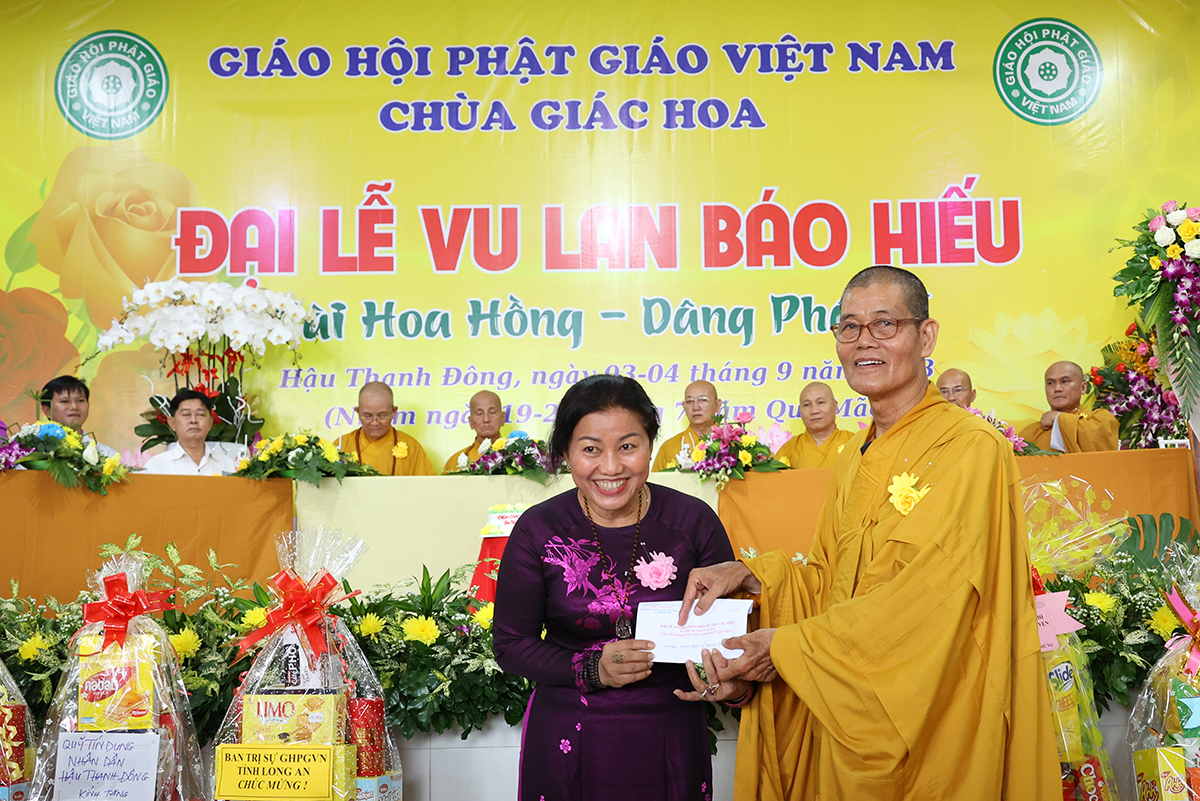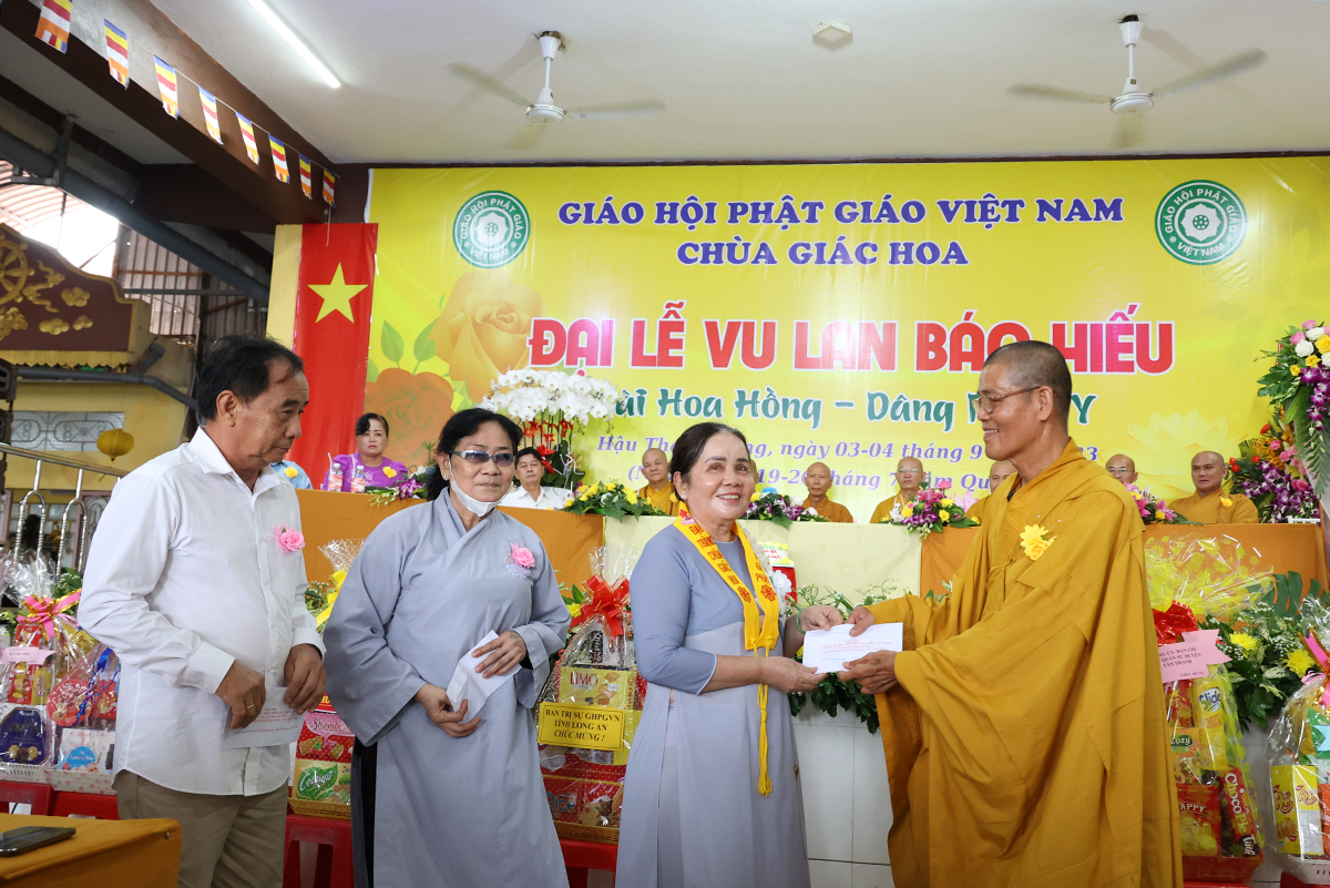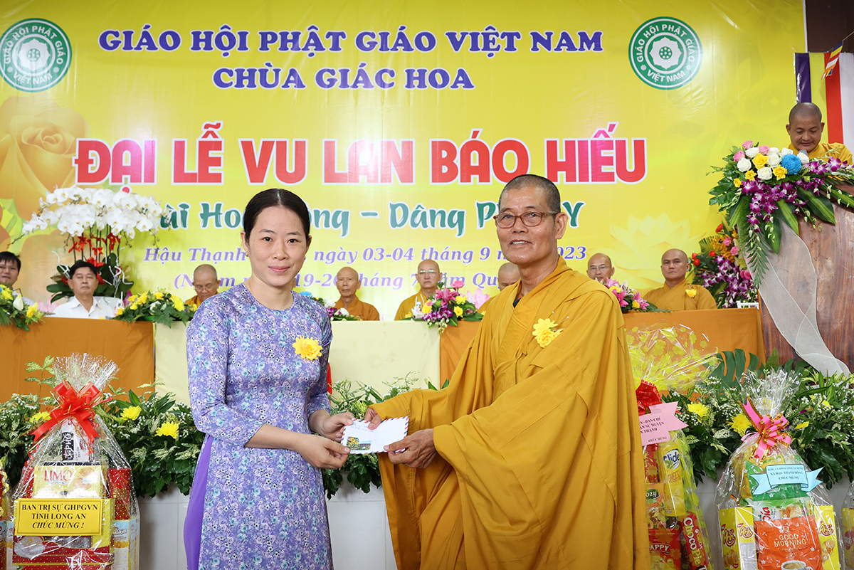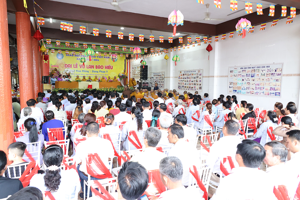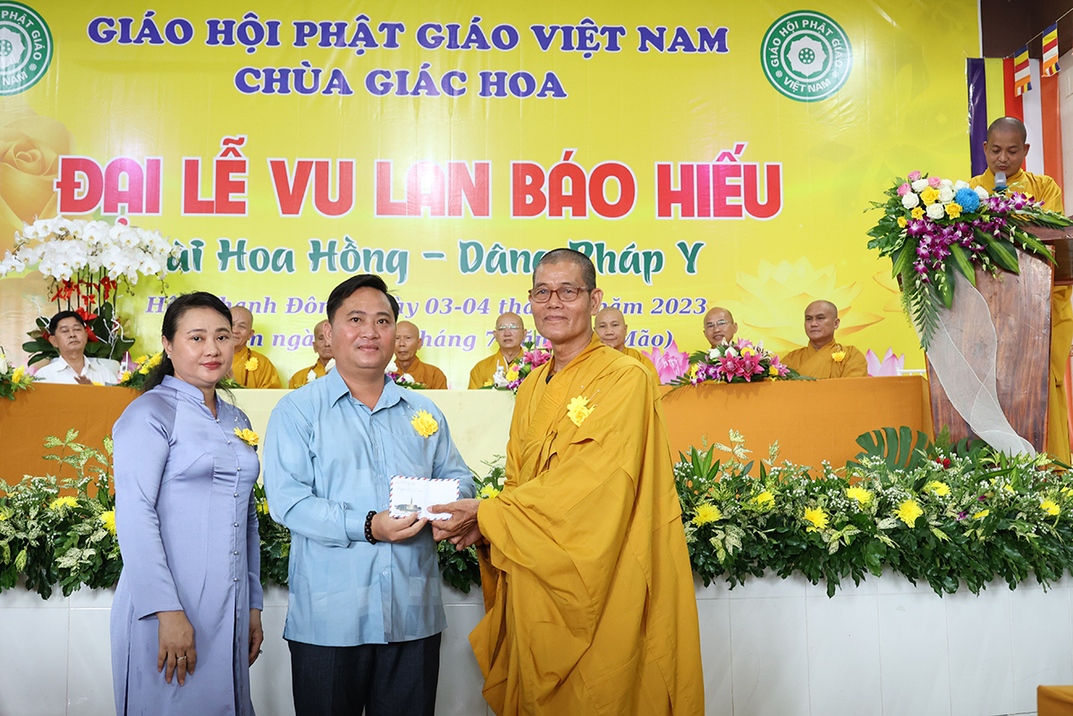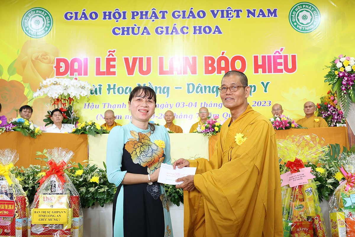 Ban đạo từ tại buổi lễ, Hòa Thượng Thích Minh Thiện – Ủy Viên HĐTS, Phó trưởng Ban Hoằng pháp TƯ, Trưởng BTS GHPGVN tỉnh Long An đã tán dương công đức Thượng tọa trụ trì chùa Giác Hoa trên tinh thần hiếu đạo đã hướng dẫn Phật tử đạo tràng tổ chức đại lễ Vu lan báo hiếu để nhớ ơn đến ân sinh dưỡng của hai đấng sinh thành cha và mẹ. Hòa thượng cũng chia sẻ về ý nghĩa tứ trọng ân, khuyến tấn Phật tử thực tập hạnh hiếu, sống và làm việc có ý nghĩa để xứng đáng là một người con Phật.