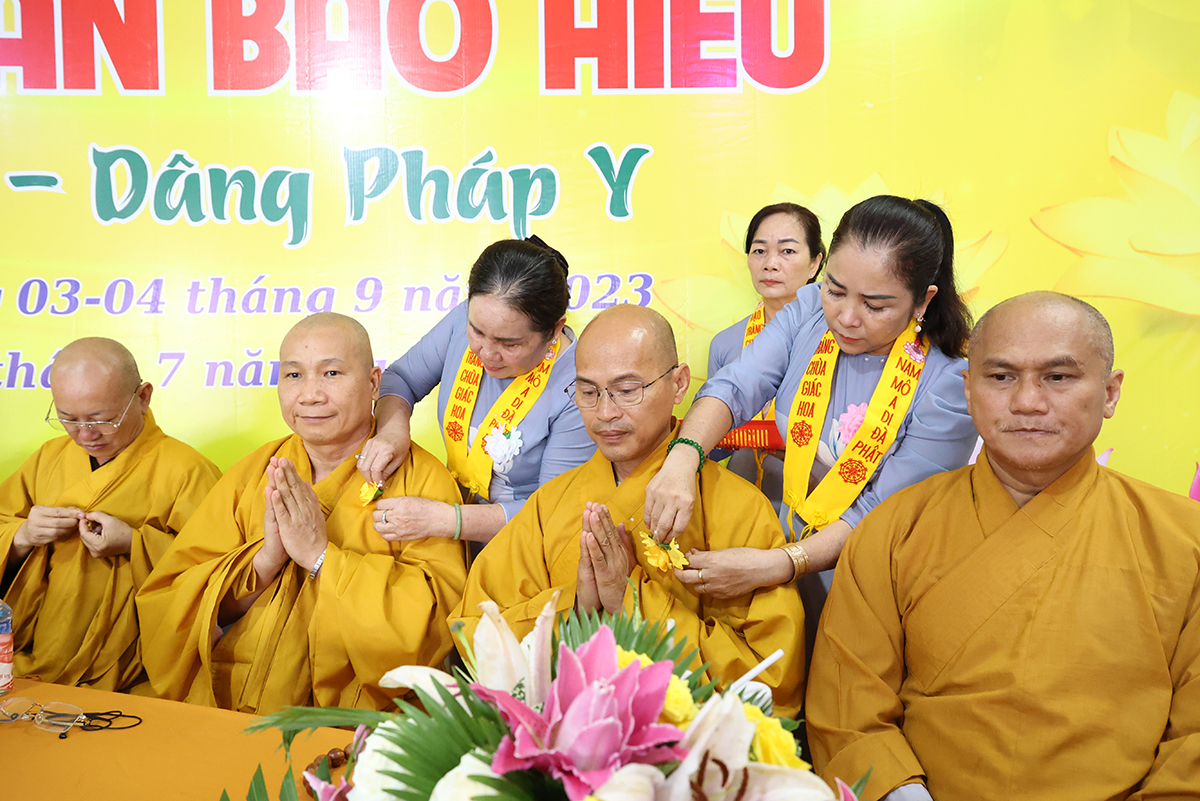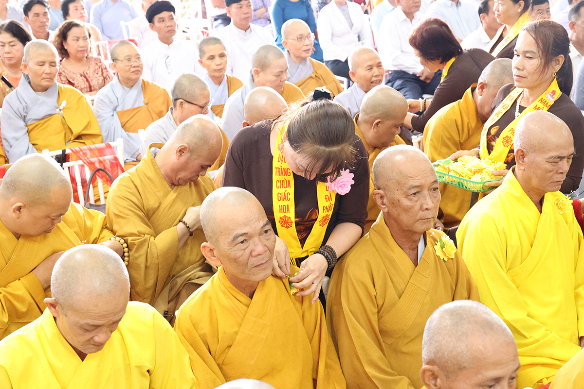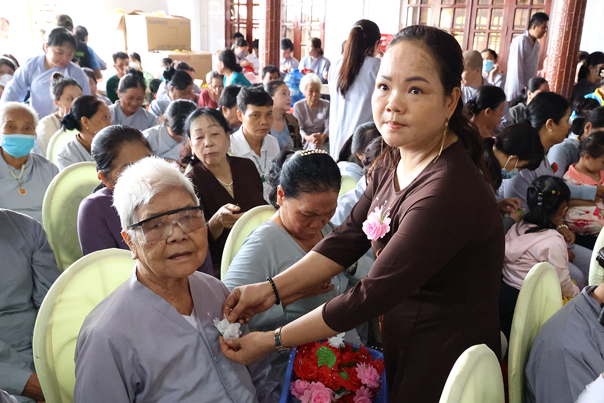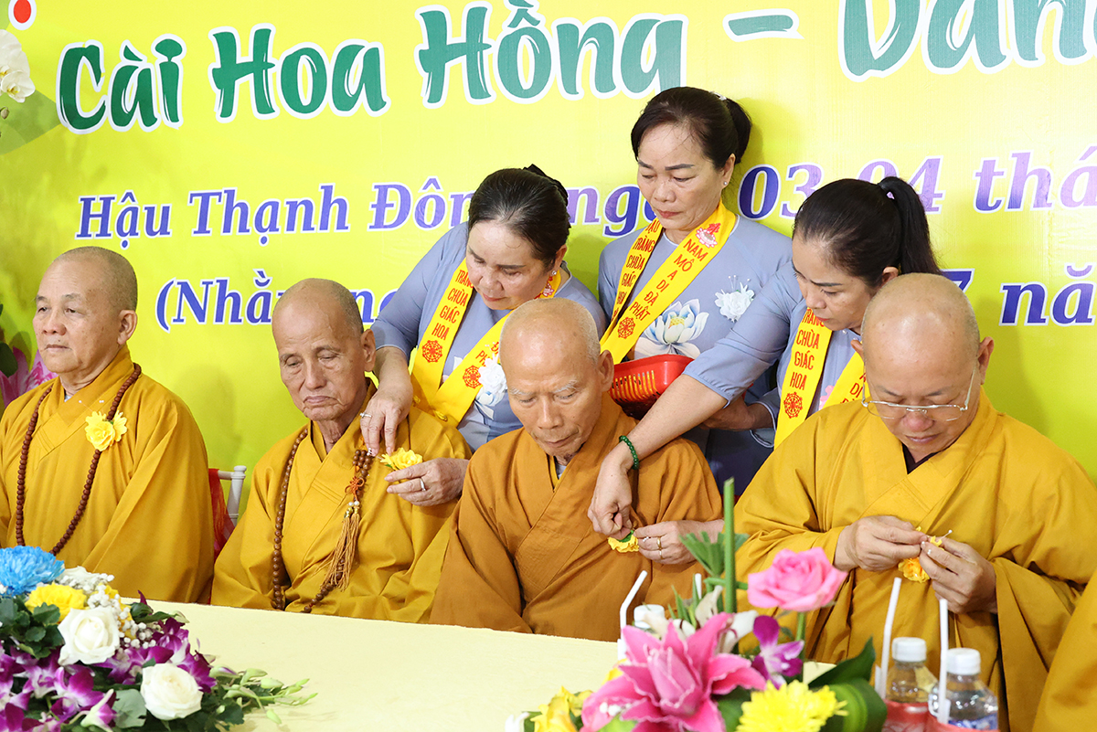 Sau phần cung nghinh chư Tôn đức và giới thiệu thành phần tham dự, Sư cô Thích nữ Huệ Nghiêm hướng dẫn Phật tử tại đạo tràng chùa Giác Hoa đã thành kính cẩn dâng những đóa hoa hồng cúng dường chư Tôn đức. Trên những chiếc y vàng giải thoát của chư Tôn đức Tăng Ni, từng đóa hồng vàng được Phật tử cung kính cài lên nơi ngực áo và cài hoa cho toàn thể chúng hội. Hoa hồng đỏ, màu tươi thắm, xin tặng đến người đang còn mẹ, nguồn tình thương vẫn tuôn chảy dạt dào, nhớ săn sóc để trọn vẹn hiếu đạo. Hoa hồng trắng, xin gởi về người có mẹ đã đi xa, nguồn yêu thương vẫn mãi còn trong ta, nhớ sống thiện lành để hồi hướng về người thân yêu nhất.