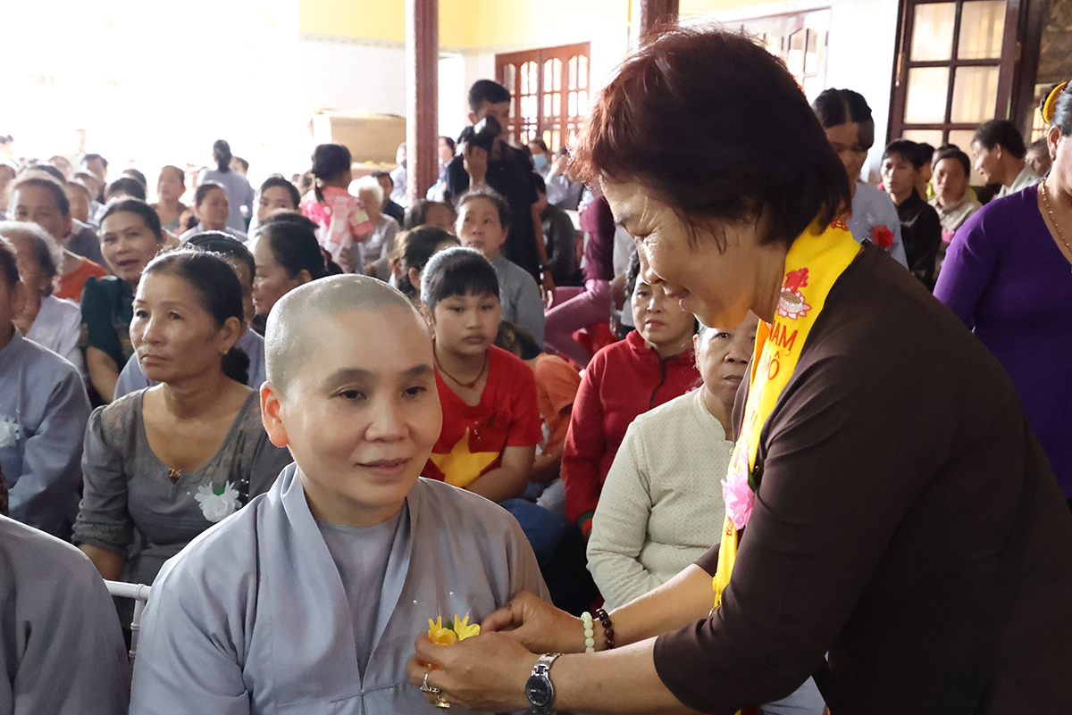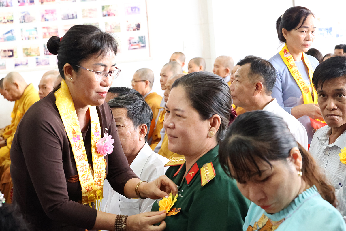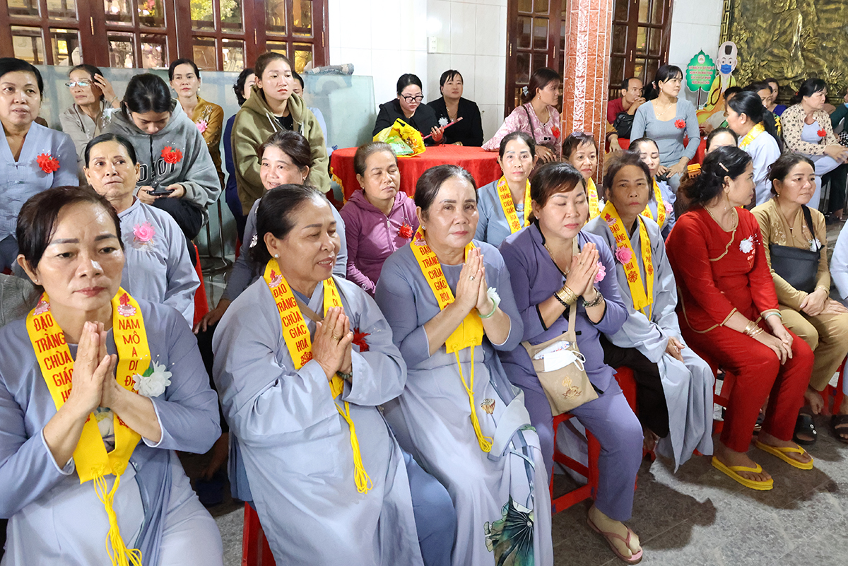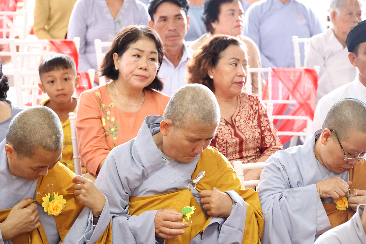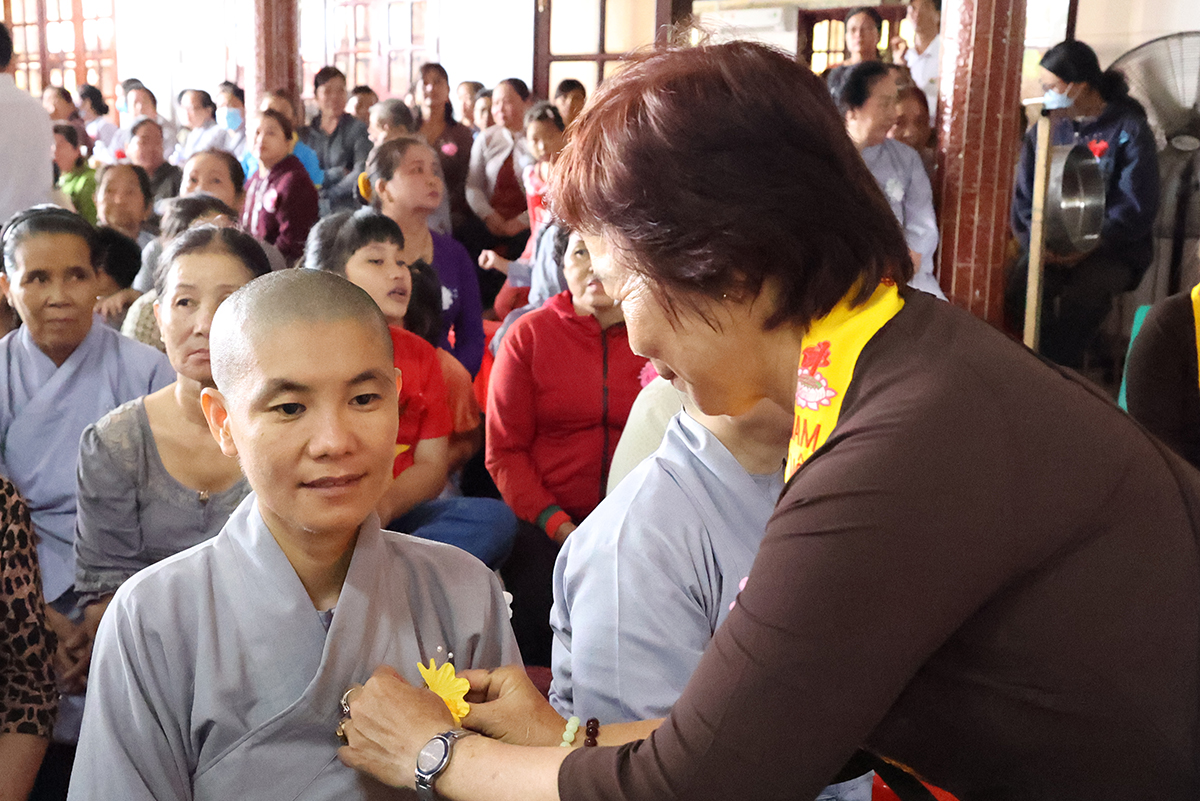 Sau phần cung nghinh chư Tôn đức và giới thiệu thành phần tham dự, Sư cô Thích nữ Huệ Nghiêm hướng dẫn Phật tử tại đạo tràng chùa Giác Hoa đã thành kính cẩn dâng những đóa hoa hồng cúng dường chư Tôn đức. Trên những chiếc y vàng giải thoát của chư Tôn đức Tăng Ni, từng đóa hồng vàng được Phật tử cung kính cài lên nơi ngực áo và cài hoa cho toàn thể chúng hội. Hoa hồng đỏ, màu tươi thắm, xin tặng đến người đang còn mẹ, nguồn tình thương vẫn tuôn chảy dạt dào, nhớ săn sóc để trọn vẹn hiếu đạo. Hoa hồng trắng, xin gởi về người có mẹ đã đi xa, nguồn yêu thương vẫn mãi còn trong ta, nhớ sống thiện lành để hồi hướng về người thân yêu nhất.