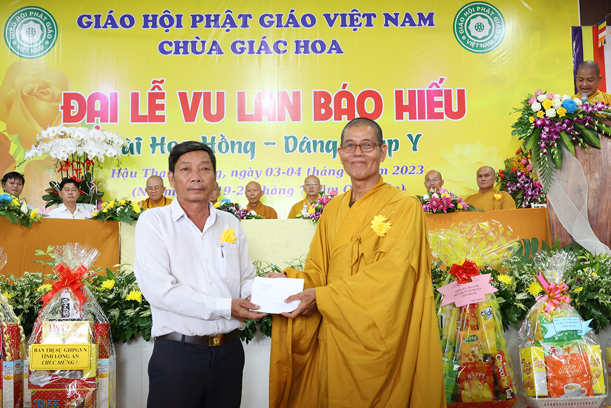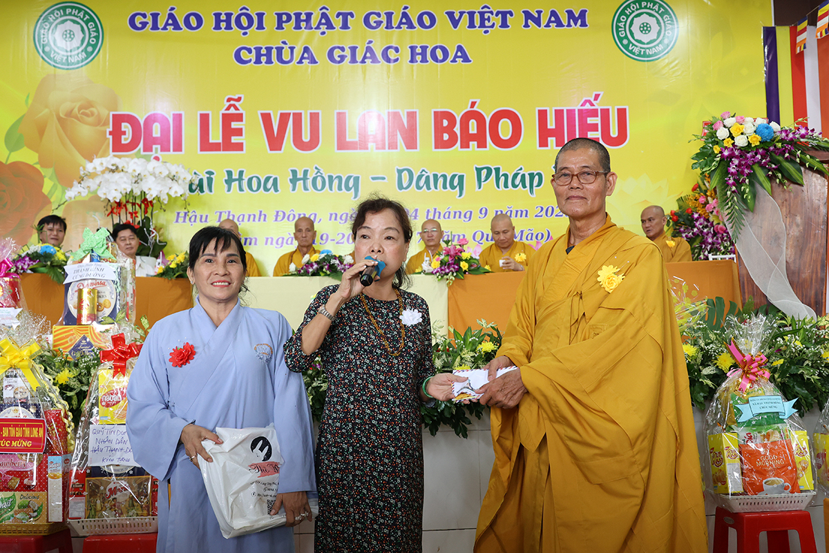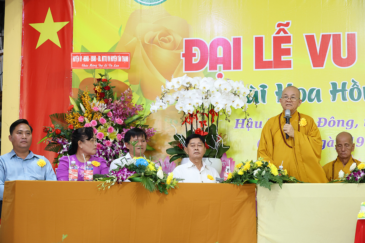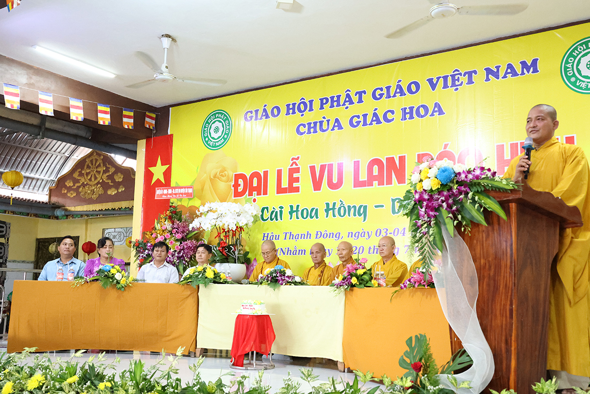 Phát biểu cảm tạ, Thượng tọa Thích Lệ Tấn – Ủy viên thường trực BTS, Phó Ban Từ thiện BTS GHPGVN tỉnh Long An, Trưởng BTS GHPGVN huyện Tân Thạnh, trụ trì chùa Giác Hoa, trưởng Ban tổ chức đại lễ đã thành kính cảm niệm tri ân chư Tôn đức giáo phẩm, chư Đại đức Tăng Ni đã không quảng ngại Phật sự đa đoan vì lòng thương tưởng đã quang lâm chứng minh và tham dự buổi lễ và đặc biệt Hòa thượng trưởng BTS GHPGVN tỉnh Long An còn ban bố những lời sách tấn vô cùng quý báu. Thượng tọa cũng tri ân đến các cấp chính quyền, chư vị khách quý, các cơ quan ban ngành đoàn thể cùng quý Phật tử đã dành thời gian quý báu trở về nơi chùa Giác Hoa để cùng nhau cất cao tinh thần hiếu nghĩa.