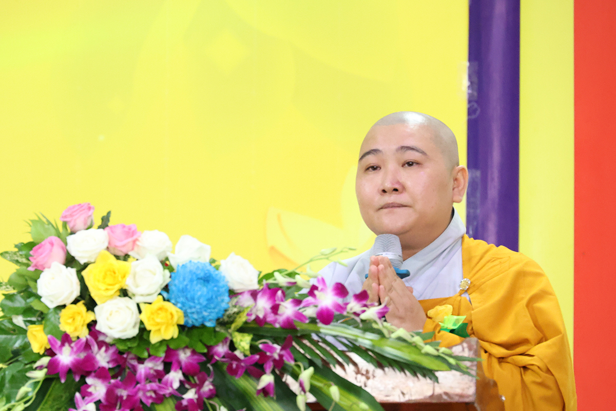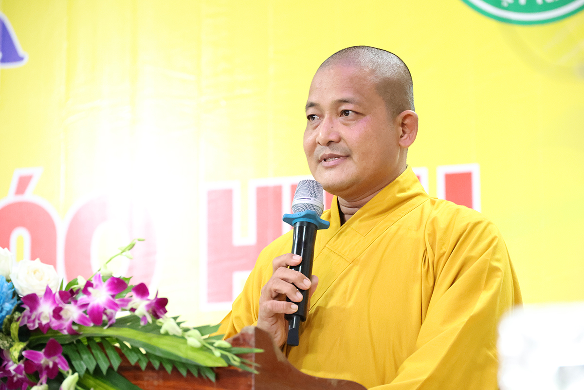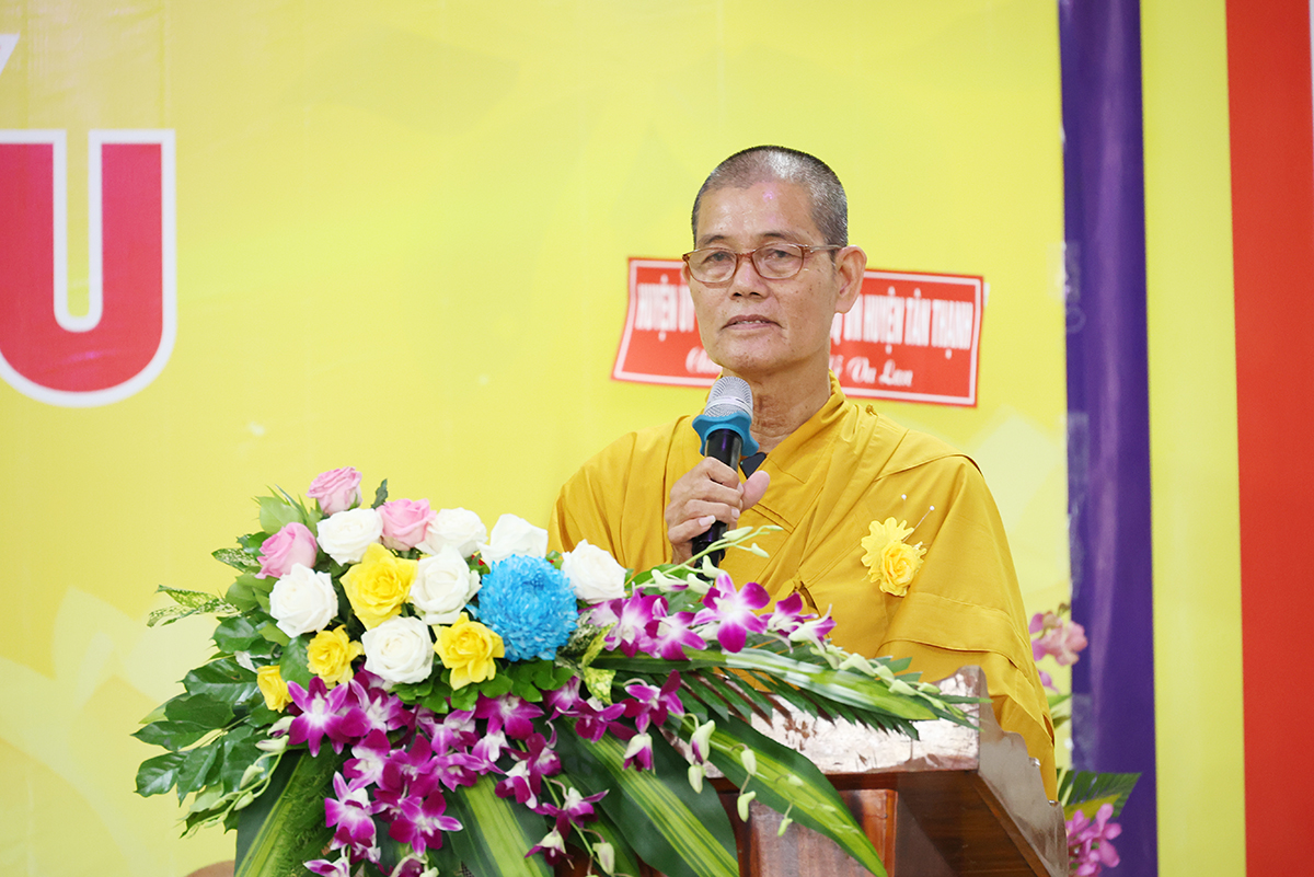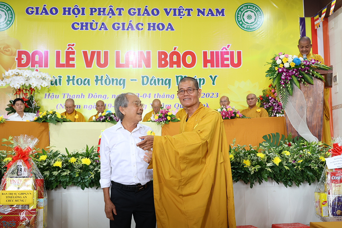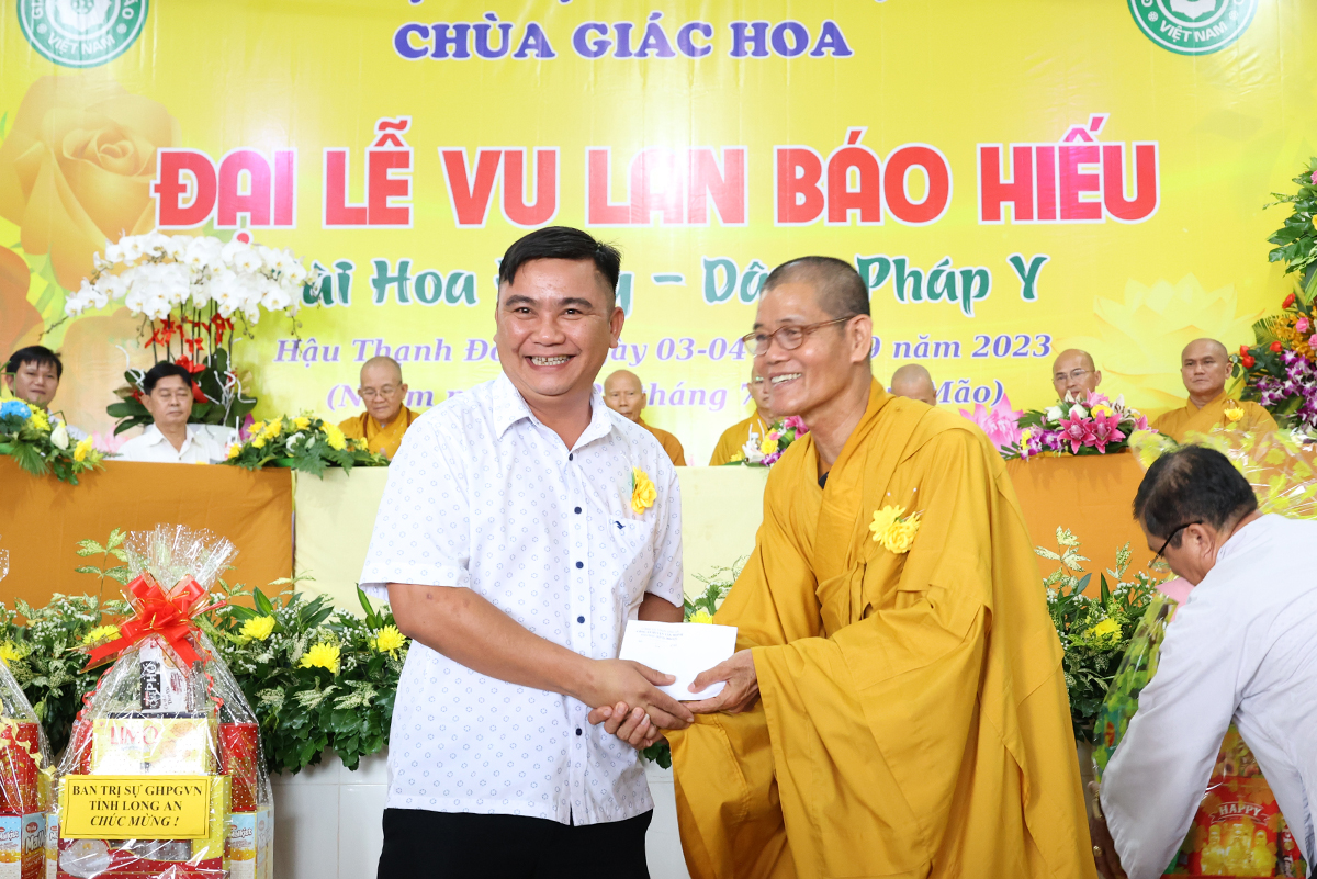 Phát biểu cảm tạ, Thượng tọa Thích Lệ Tấn – Ủy viên thường trực BTS, Phó Ban Từ thiện BTS GHPGVN tỉnh Long An, Trưởng BTS GHPGVN huyện Tân Thạnh, trụ trì chùa Giác Hoa, trưởng Ban tổ chức đại lễ đã thành kính cảm niệm tri ân chư Tôn đức giáo phẩm, chư Đại đức Tăng Ni đã không quảng ngại Phật sự đa đoan vì lòng thương tưởng đã quang lâm chứng minh và tham dự buổi lễ và đặc biệt Hòa thượng trưởng BTS GHPGVN tỉnh Long An còn ban bố những lời sách tấn vô cùng quý báu. Thượng tọa cũng tri ân đến các cấp chính quyền, chư vị khách quý, các cơ quan ban ngành đoàn thể cùng quý Phật tử đã dành thời gian quý báu trở về nơi chùa Giác Hoa để cùng nhau cất cao tinh thần hiếu nghĩa.