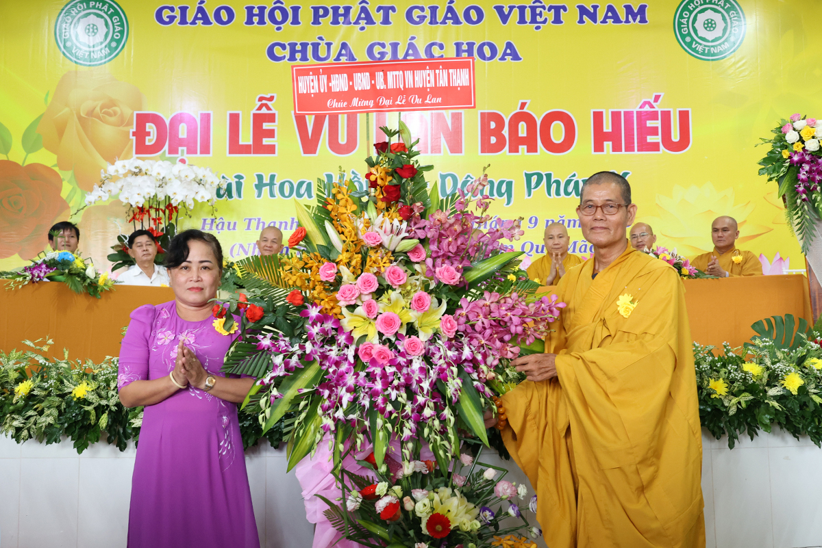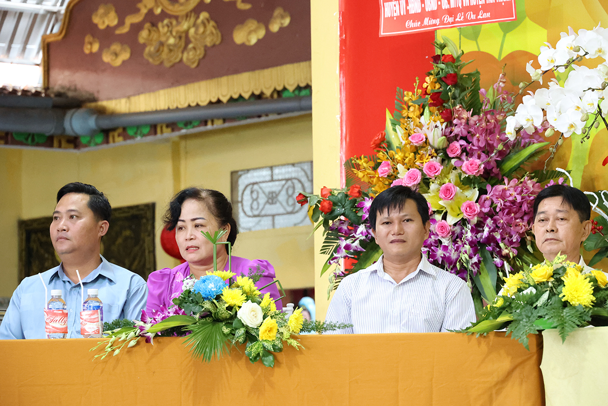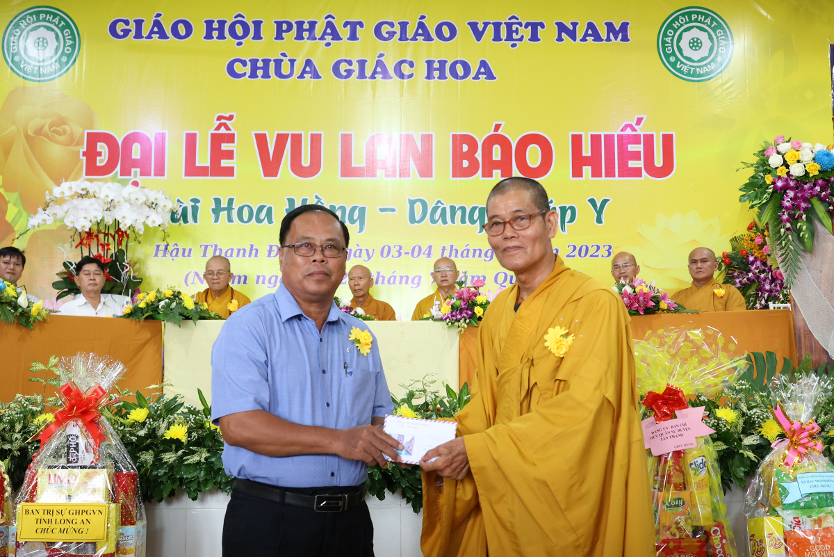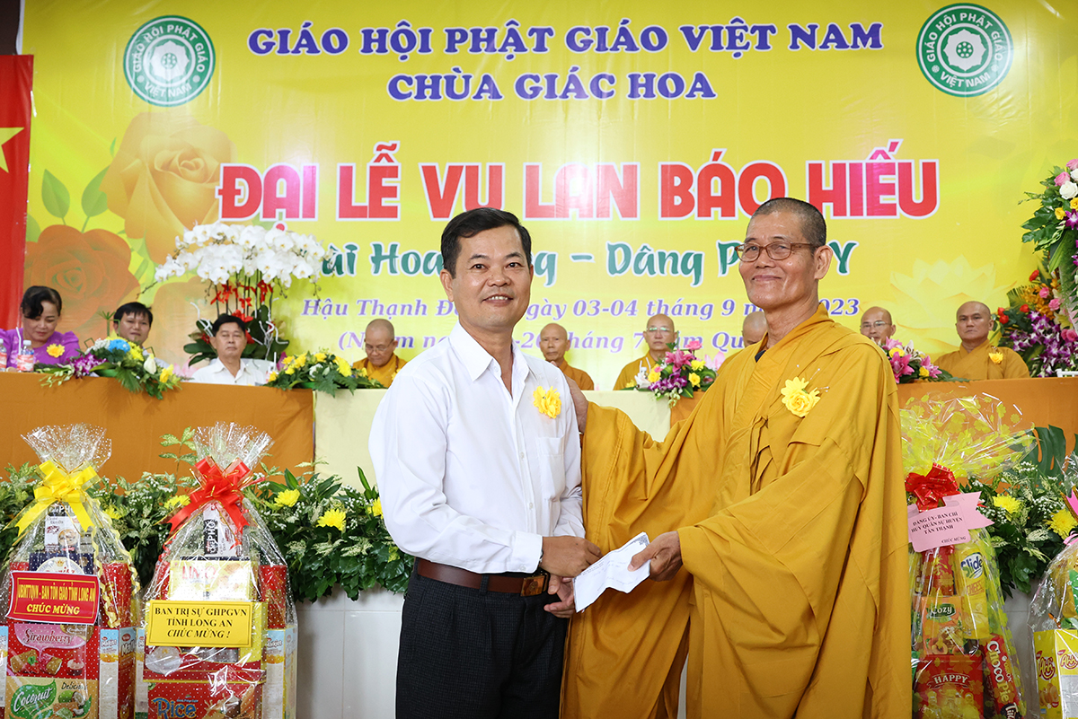 Đại diện lãnh đạo các cấp chính quyền, ông Nguyễn Văn Chung – Ủy viên Ban Thường vụ tỉnh Ủy, Chủ tịch Ủy ban Mặt trận Tổ quốc Việt Nam huyện Tân Thạnh có lời phát biểu chúc mừng đại lễ: “Ngày Đại lễ Vu lan Báo hiếu đã trở thành đạo lý uống nước nhớ nguồn của người dân Việt Nam, nhắc nhở bổn phận làm con phải biết nhớ đến công ơn sinh dưỡng của cha mẹ mà làm những việc hiếu nghĩa để đền đáp công ơn ấy. Các cấp lãnh đạo Đảng, chính quyền tỉnh Long An tin tưởng BTS Phật giáo huyện Tân Thạnh thừa lãnh đạo của BTS GHPGVN tỉnh Long An định hướng Tăng Ni, Phật tử tiếp tục tham gia các phong trào thi đua yêu nước, hoạt động từ thiện an sinh xã hội đóp góp xây dựng đất nước ngày càng tươi đẹp. Đặc biệt dưới sự lãnh đạo của Thượng tọa trưởng BTS huyện, trụ trì chùa Giác Quang sẽ dẫn dắt cho Phật giáo huyện nhà ngày một hưng thịnh làm điểm tựa tâm linh vững chắc cho nhân dân Phật tử”.