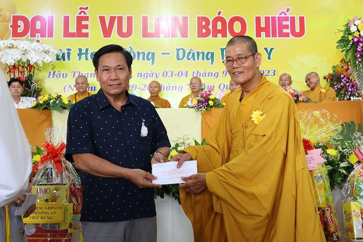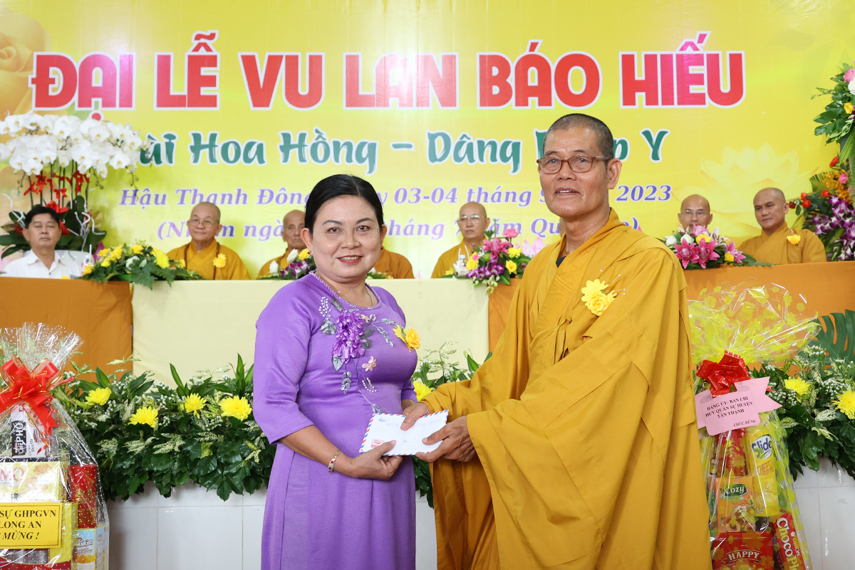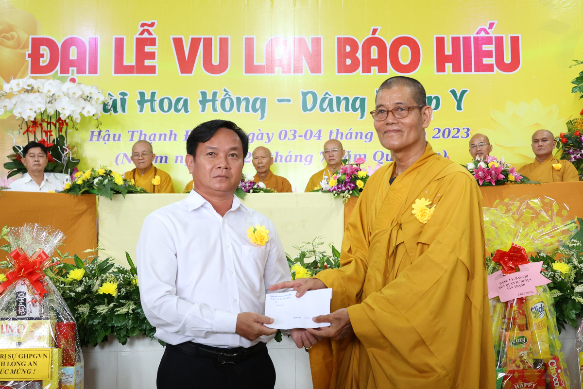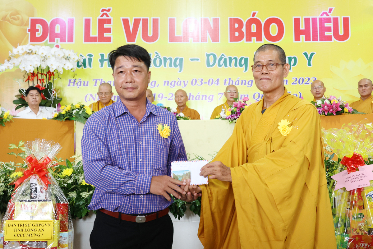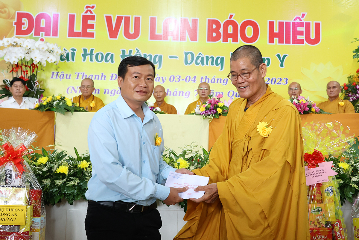 Đại diện lãnh đạo các cấp chính quyền, ông Nguyễn Văn Chung – Ủy viên Ban Thường vụ tỉnh Ủy, Chủ tịch Ủy ban Mặt trận Tổ quốc Việt Nam huyện Tân Thạnh có lời phát biểu chúc mừng đại lễ: “Ngày Đại lễ Vu lan Báo hiếu đã trở thành đạo lý uống nước nhớ nguồn của người dân Việt Nam, nhắc nhở bổn phận làm con phải biết nhớ đến công ơn sinh dưỡng của cha mẹ mà làm những việc hiếu nghĩa để đền đáp công ơn ấy. Các cấp lãnh đạo Đảng, chính quyền tỉnh Long An tin tưởng BTS Phật giáo huyện Tân Thạnh thừa lãnh đạo của BTS GHPGVN tỉnh Long An định hướng Tăng Ni, Phật tử tiếp tục tham gia các phong trào thi đua yêu nước, hoạt động từ thiện an sinh xã hội đóp góp xây dựng đất nước ngày càng tươi đẹp. Đặc biệt dưới sự lãnh đạo của Thượng tọa trưởng BTS huyện, trụ trì chùa Giác Quang sẽ dẫn dắt cho Phật giáo huyện nhà ngày một hưng thịnh làm điểm tựa tâm linh vững chắc cho nhân dân Phật tử”.