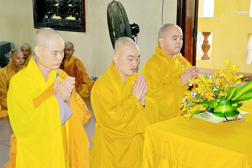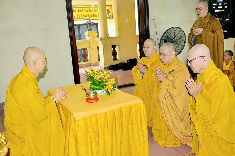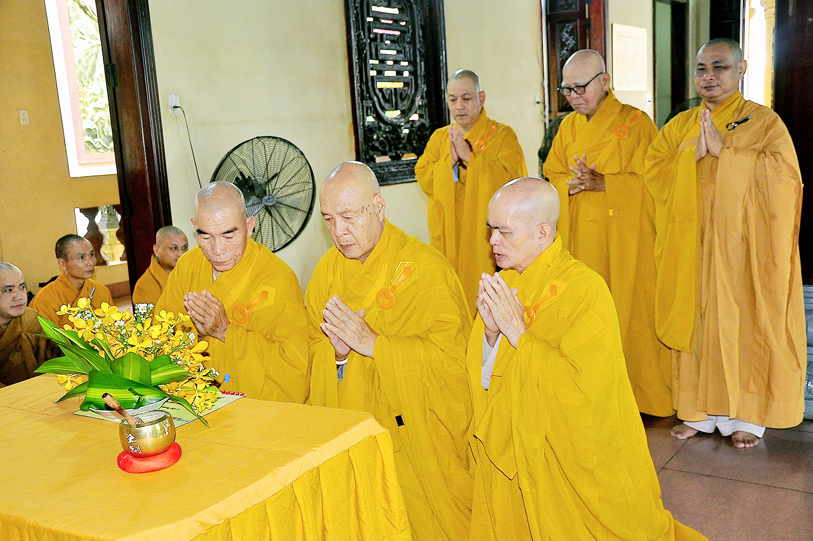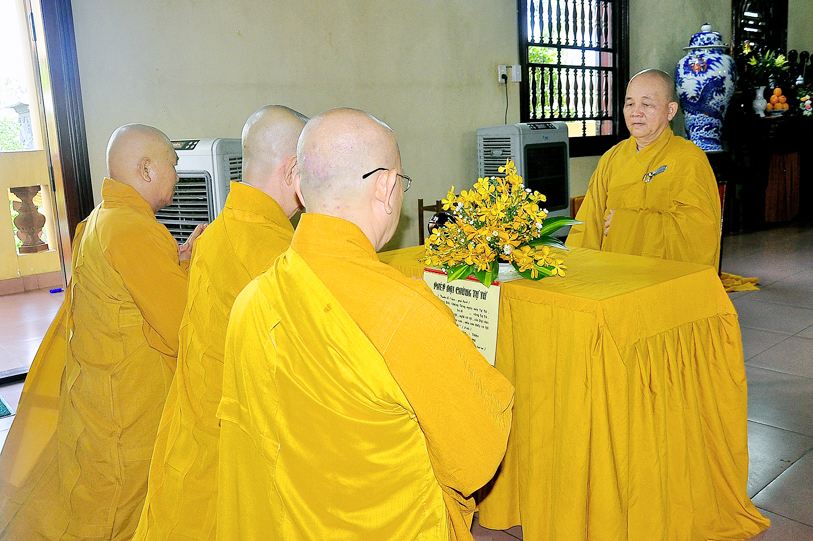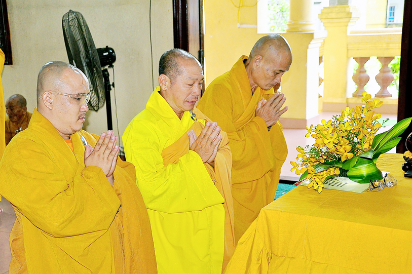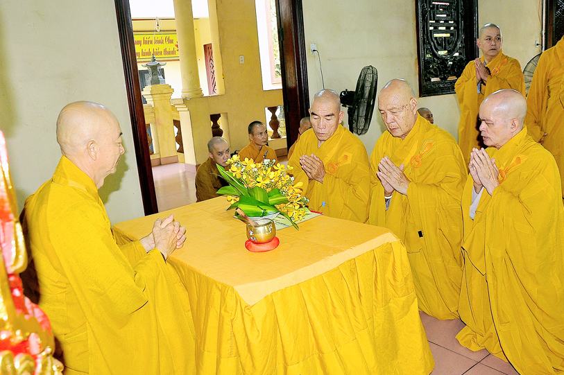 Tiếp đó, Hòa thượng cùng chư Tôn đức dâng hương tưởng niệm Lễ Húy nhật lần thứ 3 Giác linh Hòa thượng Thích Tắc Ngộ, vị thiện tri thức, Tăng tài, bóng cả đã đồng hành chia sẻ Phật sự suốt 20 năm cúng với GHPGVN tỉnh Long An.