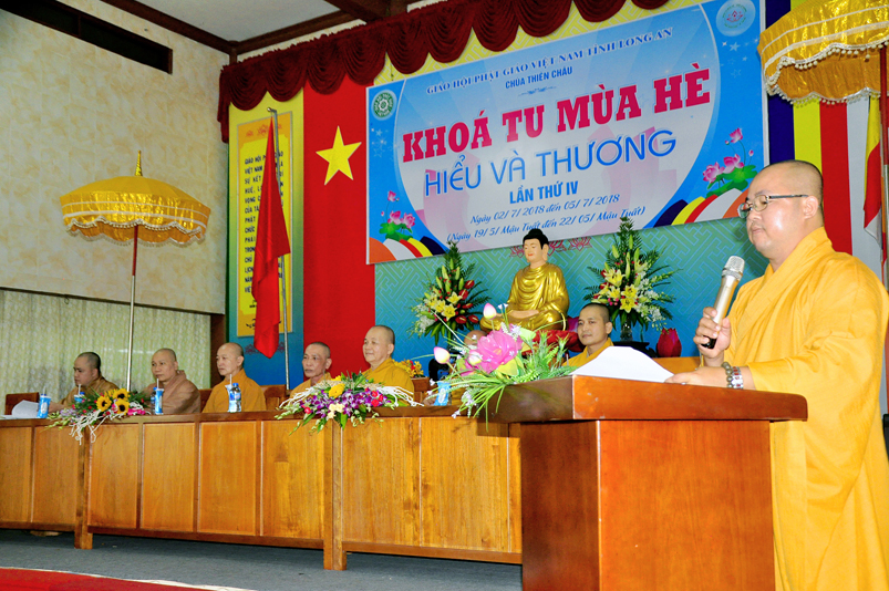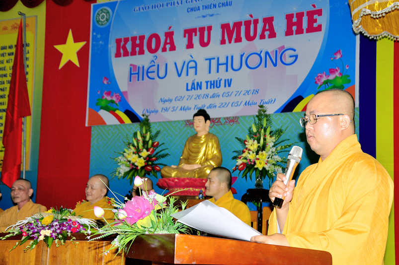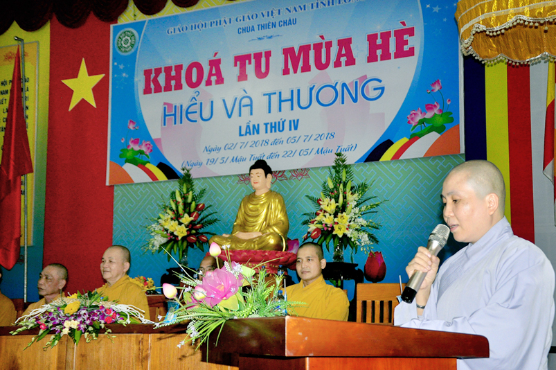 Mở đầu chương trình là nghi thức chào Quốc Kỳ và Đạo Kỳ, tiếp theo đó Đại Đức Thích An Tấn – Phó Trưởng Ban Thông Tin Truyền Thông, Phó Ban Kinh Tế Tài Chính tỉnh Long An tuyên đọc công văn của Hội Đồng Trị Sự Trung Ương về việc tổ chức Khoá Tu Mùa Hè và bài phát biểu Khai Mạc Khoá Tu Mùa Hè năm nay. Sau đó, Sư Cô Thích Nữ Huệ Như đã thay mặt Ban Tổ Chức báo cáo công tác tổ chức Khoá Tu trước Chư Tôn Đức Chứng Minh, Sư Cô Thích Nữ Huệ Nghiêm phổ biến nội quy Khoá Tu cho toàn thể Khoá Sinh.
