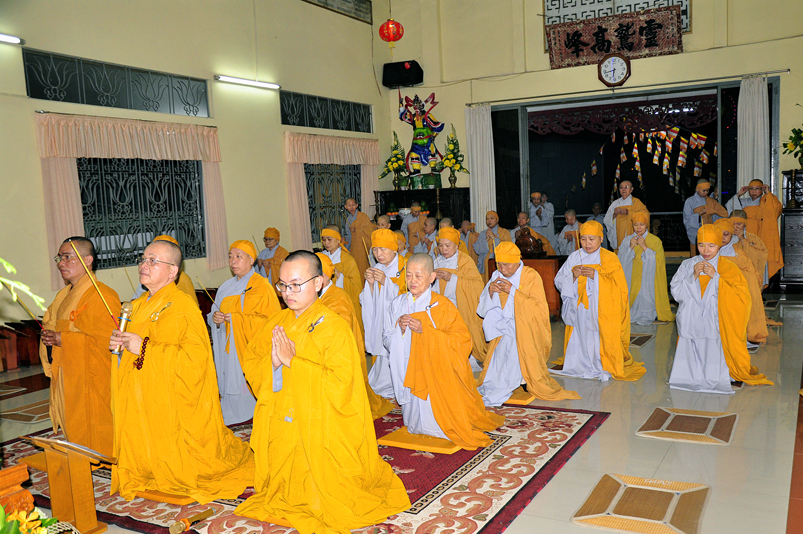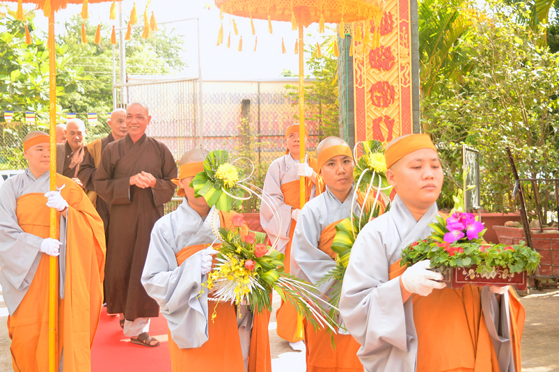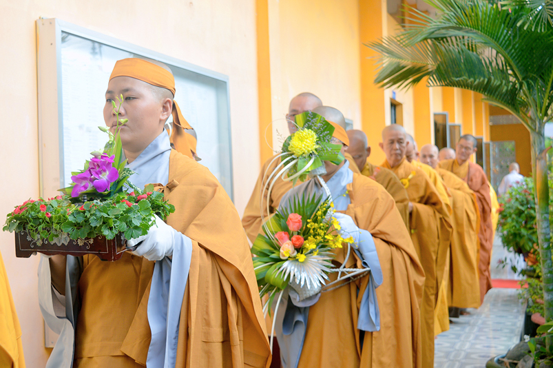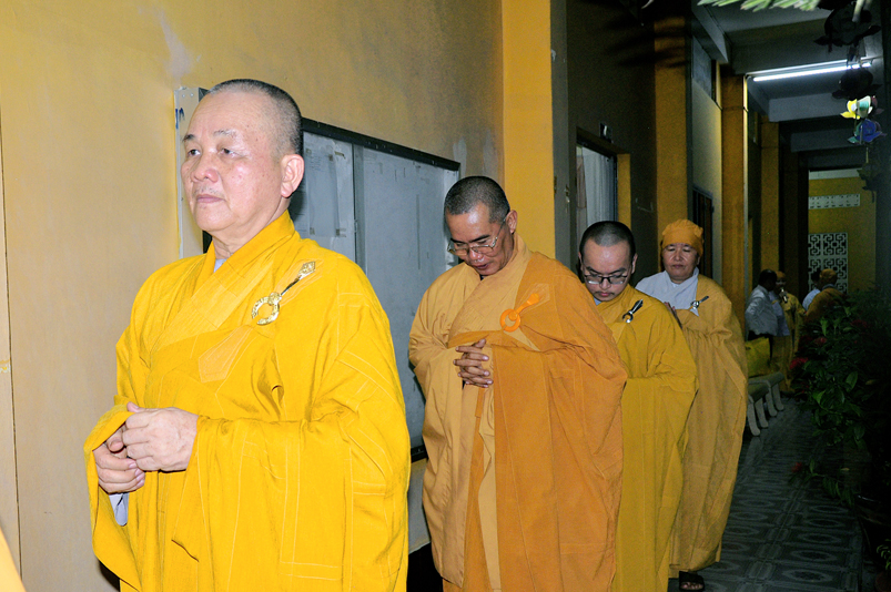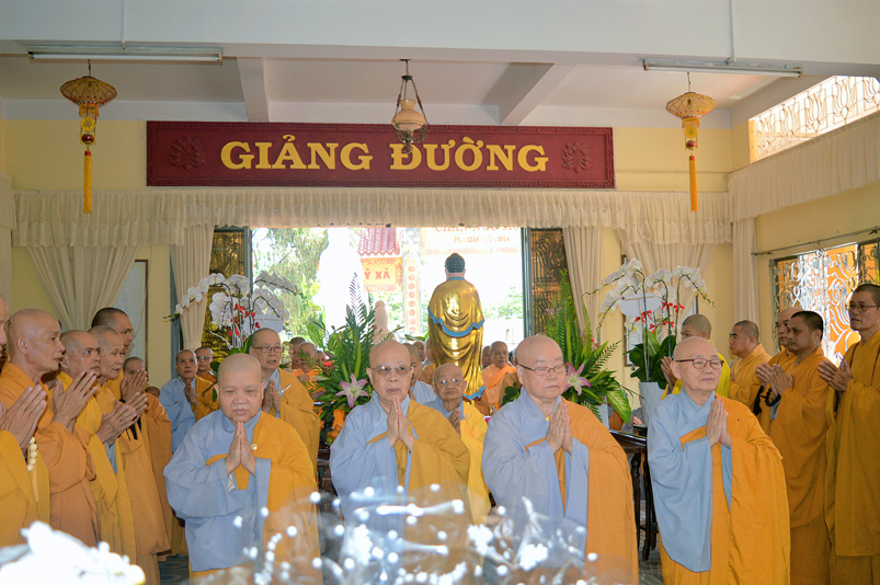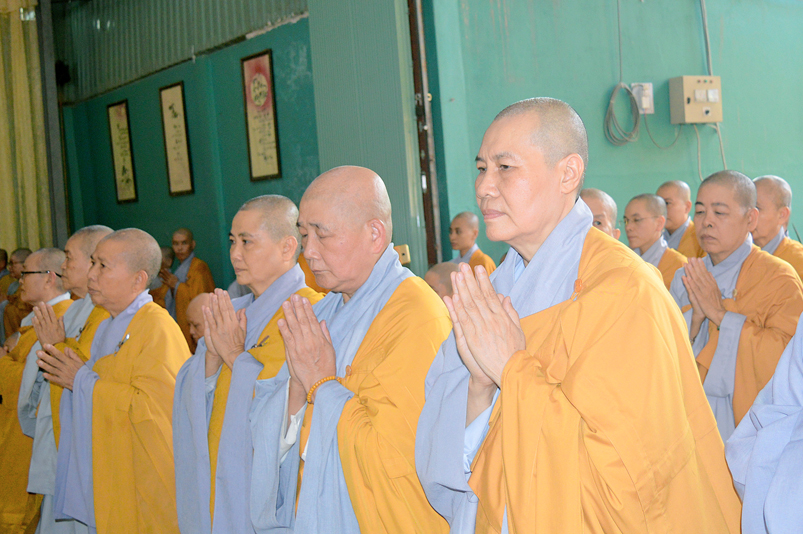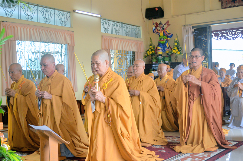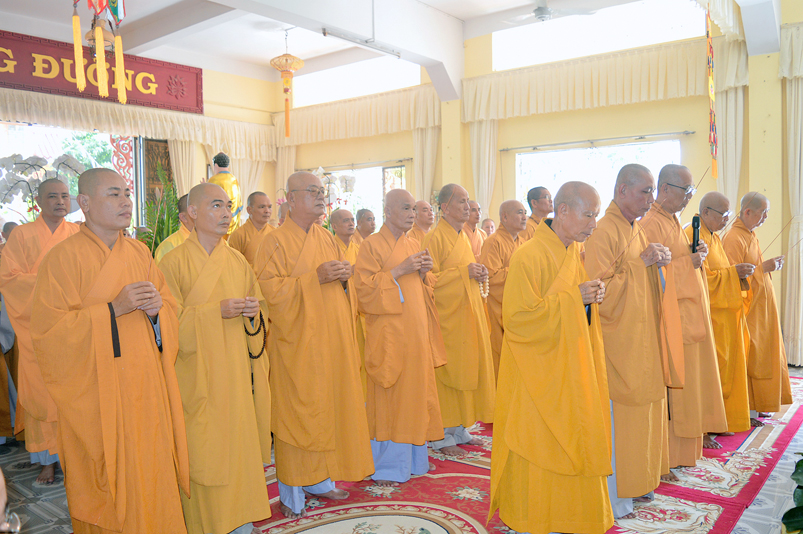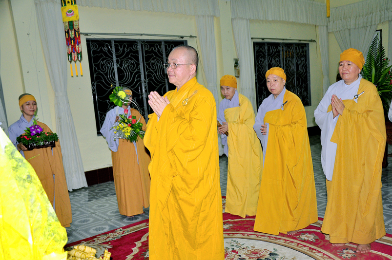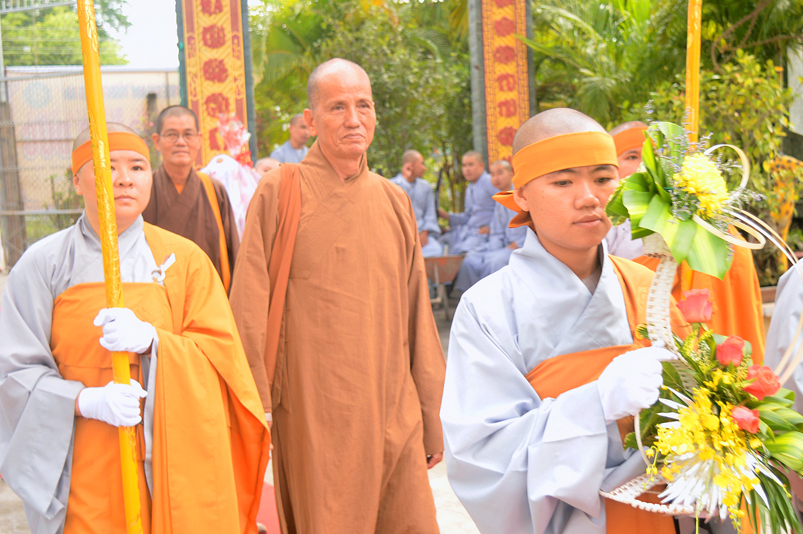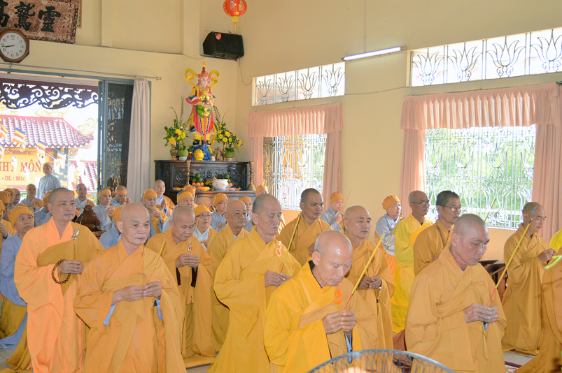 Vào lúc 7.30, môn đồ pháp quyến thành kính cung đón chư Tôn Giáo Phẩm nhị bộ Tăng già quang lâm: Hoà thượng Thích Thiện Huệ – Chứng minh Ban Trị sự GHPGVN tỉnh Long An, trụ trì chùa Thiên Khánh; HT. Thích Huệ Hồng – Chứng minh Ban Trị sự GHPGVN tỉnh Long An, trụ trì chùa Phổ Minh, HT. Thích Thiện Tâm – Phó trưởng Ban Trị sự GHPGVN tỉnh Long An, trụ trì chùa Thiên Long; HT. Thích Thiện Pháp- Trụ trì chùa Hội Linh, TP. Cần Thơ; HT. Thích Thiện Tài- Trưởng Ban Nghi Lễ GHPGVN tỉnh Long An, trụ trì chùa Mỹ Phước; HT. Thích Quảng Ý – Trưởng Ban Trị sự GHPGVN liên huyện Tân Thạnh, Kiến Tường, Vĩnh Hưng; HT. Thích Chơn Đạo- Giáo thọ Trường Trung Cấp Phật Học Long An.