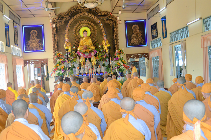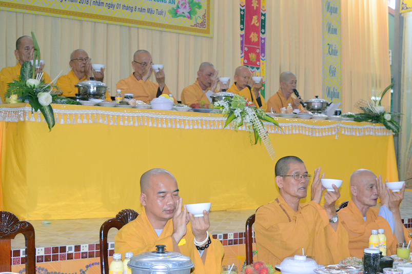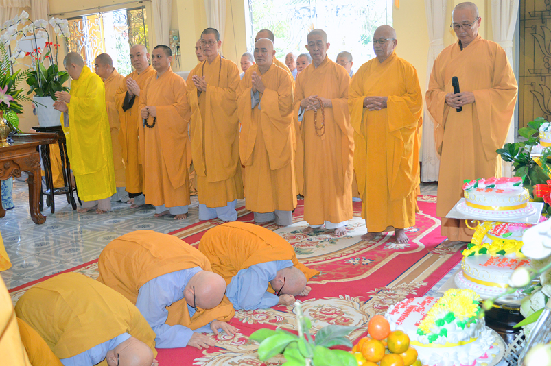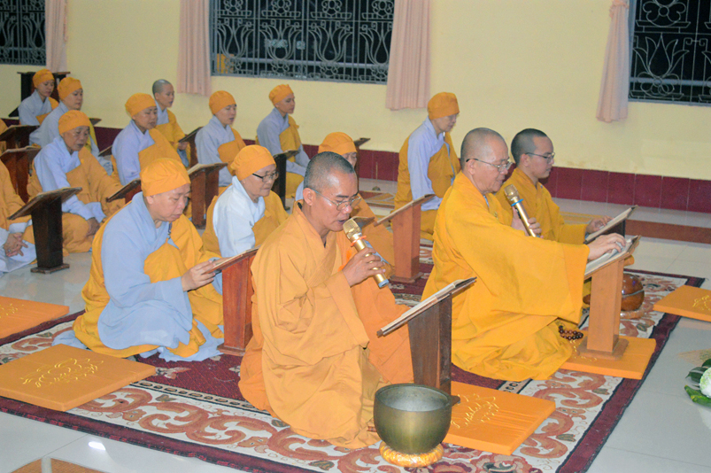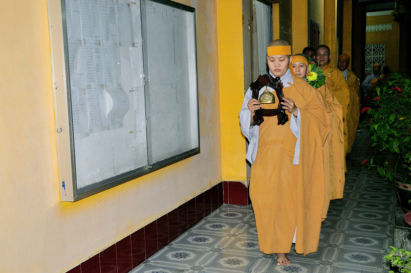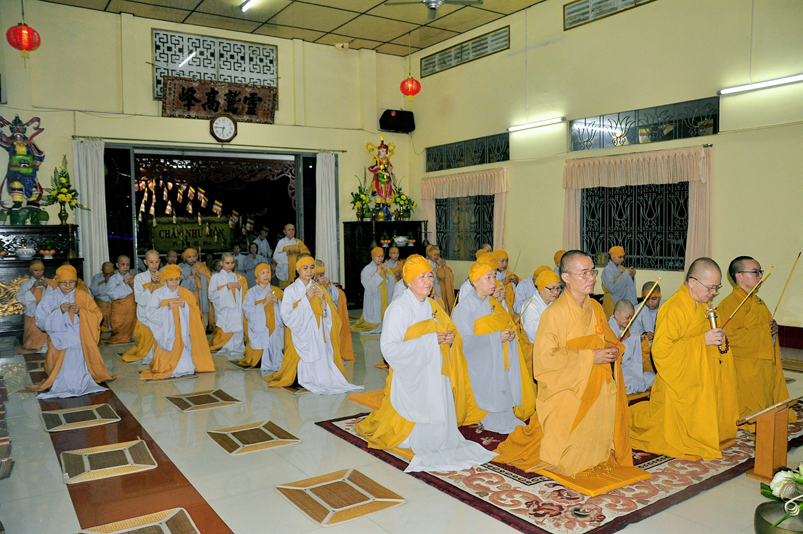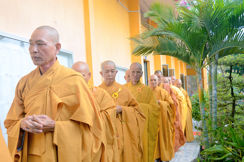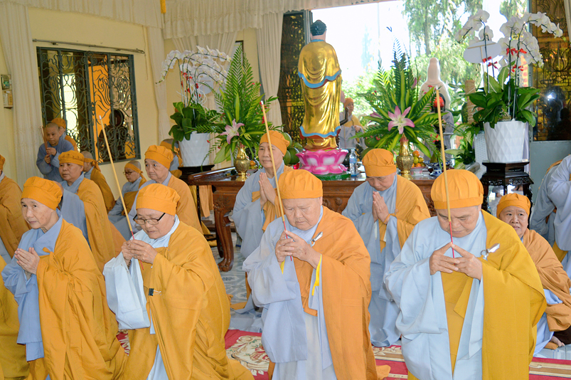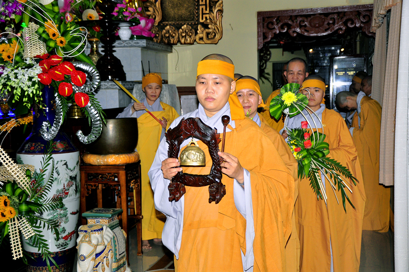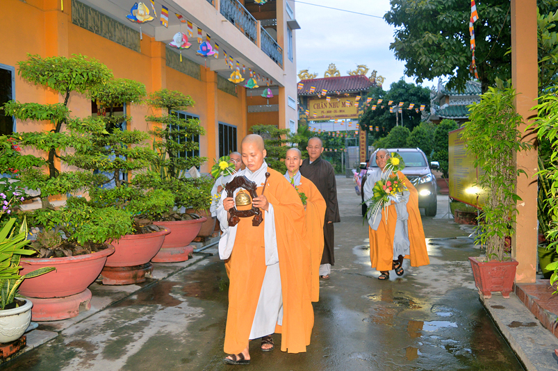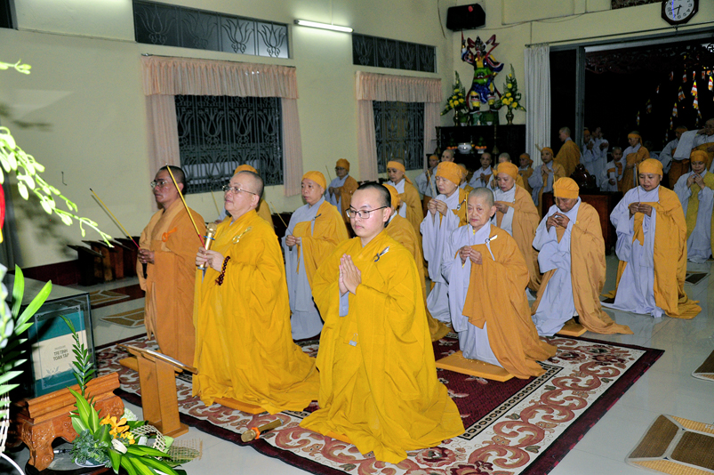 Vào lúc 7.30, môn đồ pháp quyến thành kính cung đón chư Tôn Giáo Phẩm nhị bộ Tăng già quang lâm: Hoà thượng Thích Thiện Huệ – Chứng minh Ban Trị sự GHPGVN tỉnh Long An, trụ trì chùa Thiên Khánh; HT. Thích Huệ Hồng – Chứng minh Ban Trị sự GHPGVN tỉnh Long An, trụ trì chùa Phổ Minh, HT. Thích Thiện Tâm – Phó trưởng Ban Trị sự GHPGVN tỉnh Long An, trụ trì chùa Thiên Long; HT. Thích Thiện Pháp- Trụ trì chùa Hội Linh, TP. Cần Thơ; HT. Thích Thiện Tài- Trưởng Ban Nghi Lễ GHPGVN tỉnh Long An, trụ trì chùa Mỹ Phước; HT. Thích Quảng Ý – Trưởng Ban Trị sự GHPGVN liên huyện Tân Thạnh, Kiến Tường, Vĩnh Hưng; HT. Thích Chơn Đạo- Giáo thọ Trường Trung Cấp Phật Học Long An.