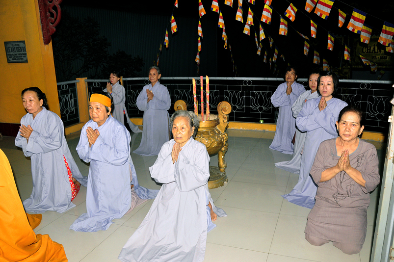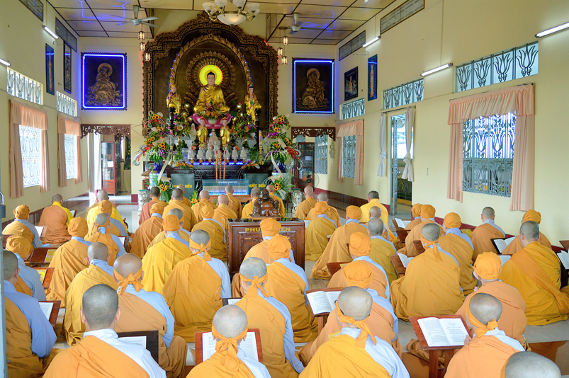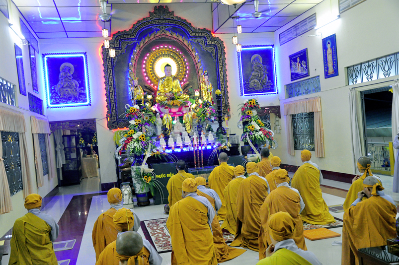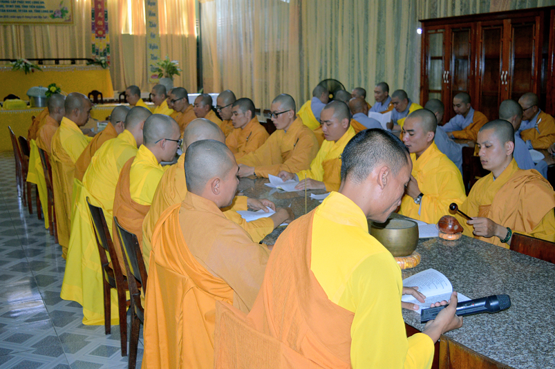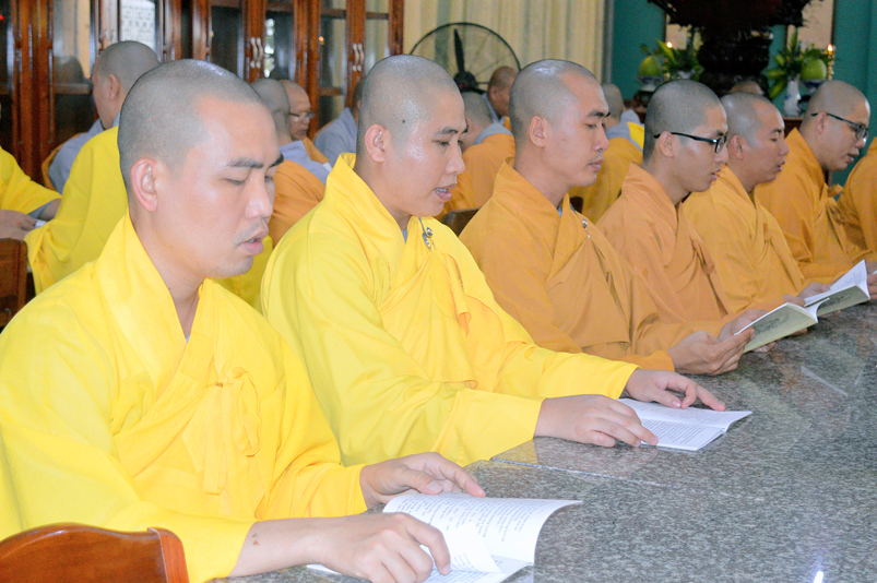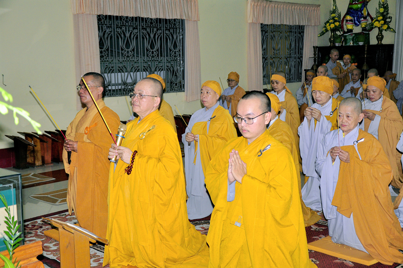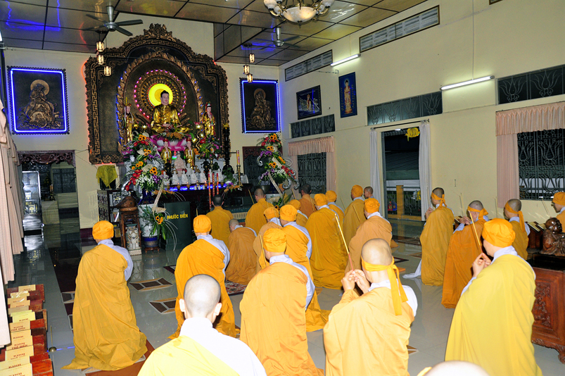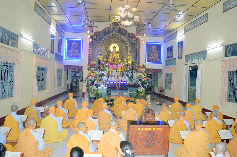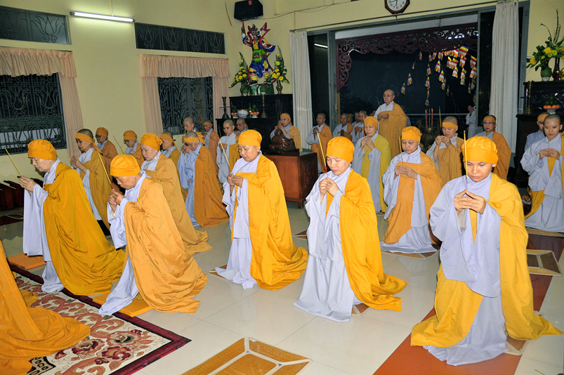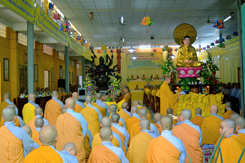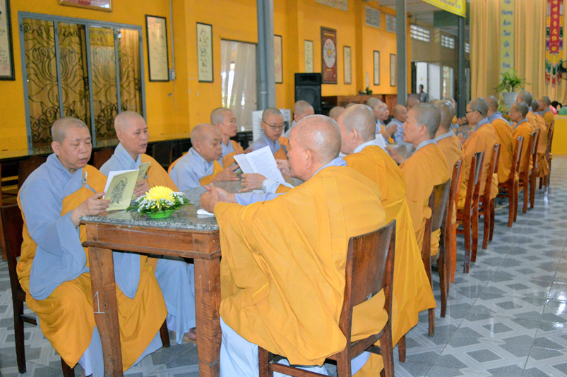Vào lúc 7.30, môn đồ pháp quyến thành kính cung đón chư Tôn Giáo Phẩm nhị bộ Tăng già quang lâm: Hoà thượng Thích Thiện Huệ – Chứng minh Ban Trị sự GHPGVN tỉnh Long An, trụ trì chùa Thiên Khánh; HT. Thích Huệ Hồng – Chứng minh Ban Trị sự GHPGVN tỉnh Long An, trụ trì chùa Phổ Minh, HT. Thích Thiện Tâm – Phó trưởng Ban Trị sự GHPGVN tỉnh Long An, trụ trì chùa Thiên Long; HT. Thích Thiện Pháp- Trụ trì chùa Hội Linh, TP. Cần Thơ; HT. Thích Thiện Tài- Trưởng Ban Nghi Lễ GHPGVN tỉnh Long An, trụ trì chùa Mỹ Phước; HT. Thích Quảng Ý – Trưởng Ban Trị sự GHPGVN liên huyện Tân Thạnh, Kiến Tường, Vĩnh Hưng; HT. Thích Chơn Đạo- Giáo thọ Trường Trung Cấp Phật Học Long An.
