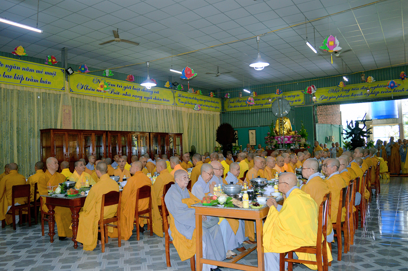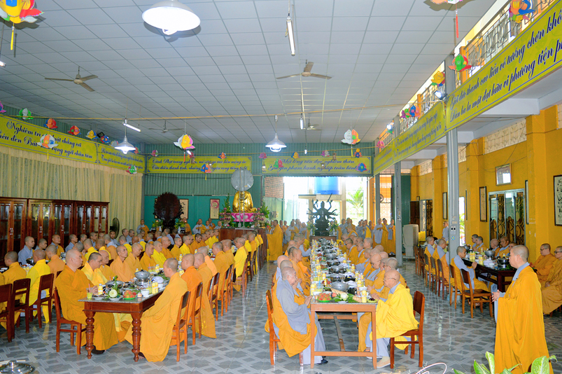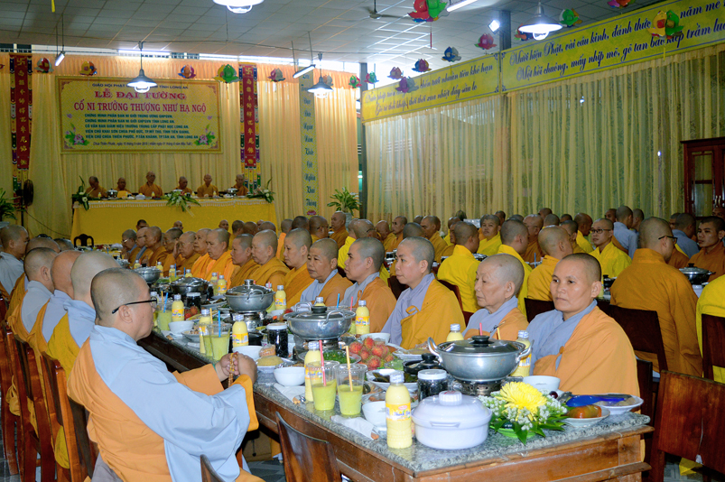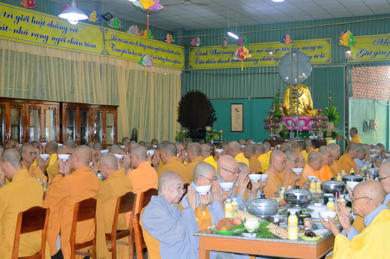 Sau nén hương tưởng niệm, môn nhân pháp quyến cung thỉnh Nhị bộ Tăng già quang lâm Trai đường chứng minh pháp sự cúng dường. Trước khi tác pháp cúng dường, Đại đức Thích Lệ Ngôn đãi lao chư Tôn Thiền Đức cung tuyên tiểu sử cố Ni trưởng, như một nghĩa cử nhắc nhở, tri ân công hạnh của cố Ni trưởng.