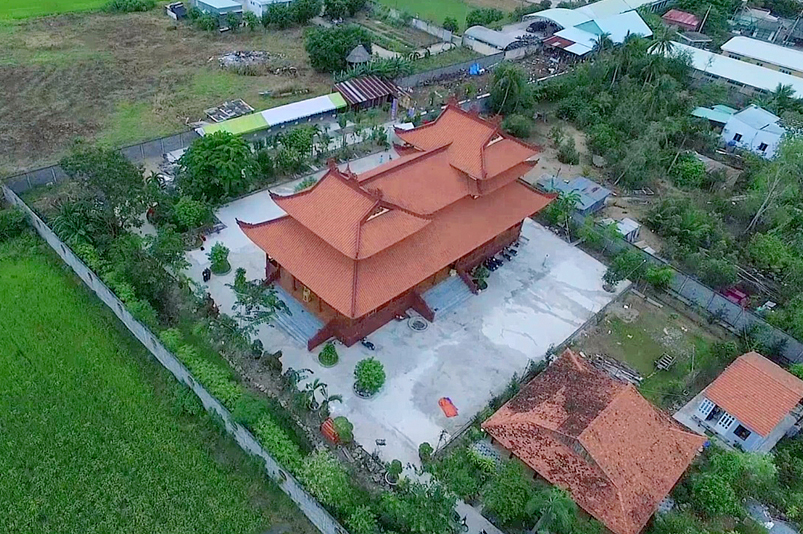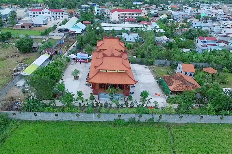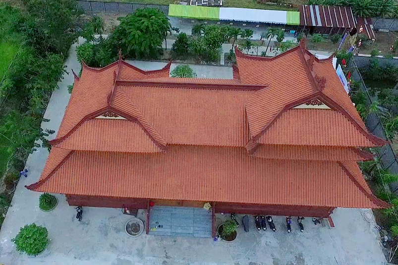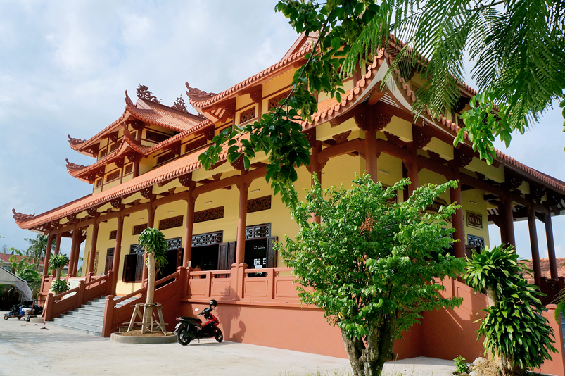 Báo cáo trong lễ khánh thành Thượng toạ cho biết, trông trình được xây dựng dựa theo mẫu kiến trúc Cung Đình Huế kết hợp với lối kiến thúc những ngôi chùa phía Bắc. Công trình hoàn thành tổng cộng khoản 8 tỷ. Trong đó bà Dương Thị Hằng, bà Dương Thị Hoàng đóng góp 2 tỷ. Quỹ Hỗ Trợ Thiện Tâm Hà Nội ủng hộ 5 tỷ đồng. Phật tử Ngọc Tuyết ở Hoa Kỳ cúng dường Tượng Phật Thích Ca 450 triệu đồng. Các tôn tượng: ông Tiêu, Hộ Pháp, tượng tổ Đạt Ma, Bàn Phật, bàn Ông tiêu diện, bàn hộ Pháp do chùa Thiên Châu, Tp. Tân An hỷ cúng, và sự góp công, góp sức của đồng bào địa phương để góp phần thành tựu hôm nay.