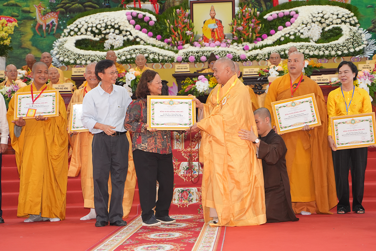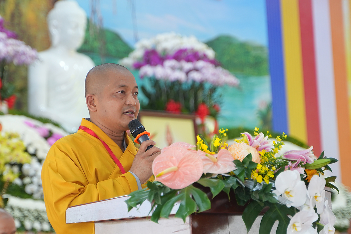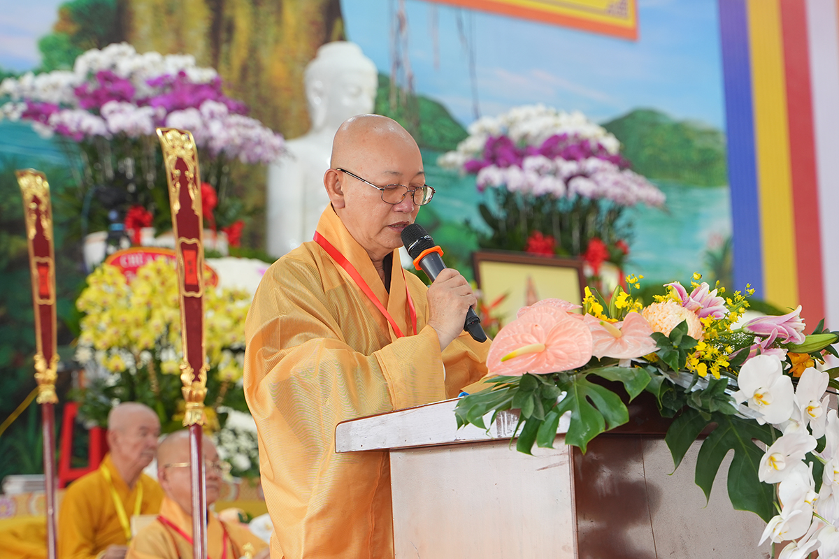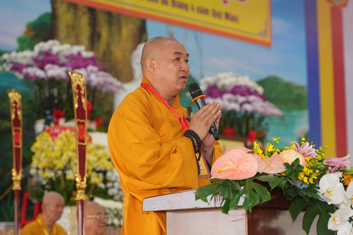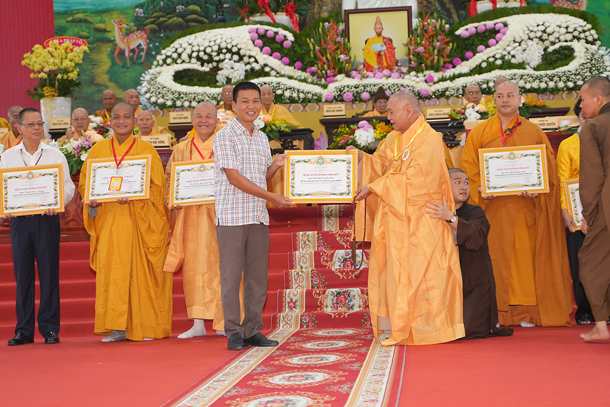Thích Phước Nguyên tuyên đọc Quyết định tuyên dương công đức của Ban Thường Trực HĐTS cho 14 cá nhân và tập thể.