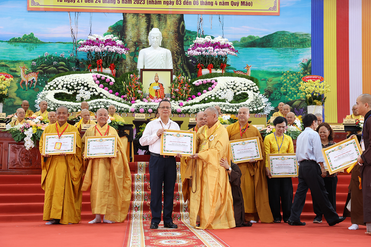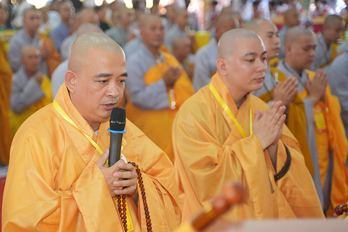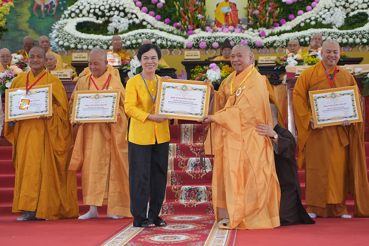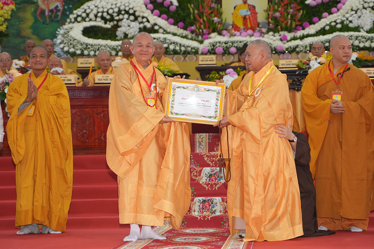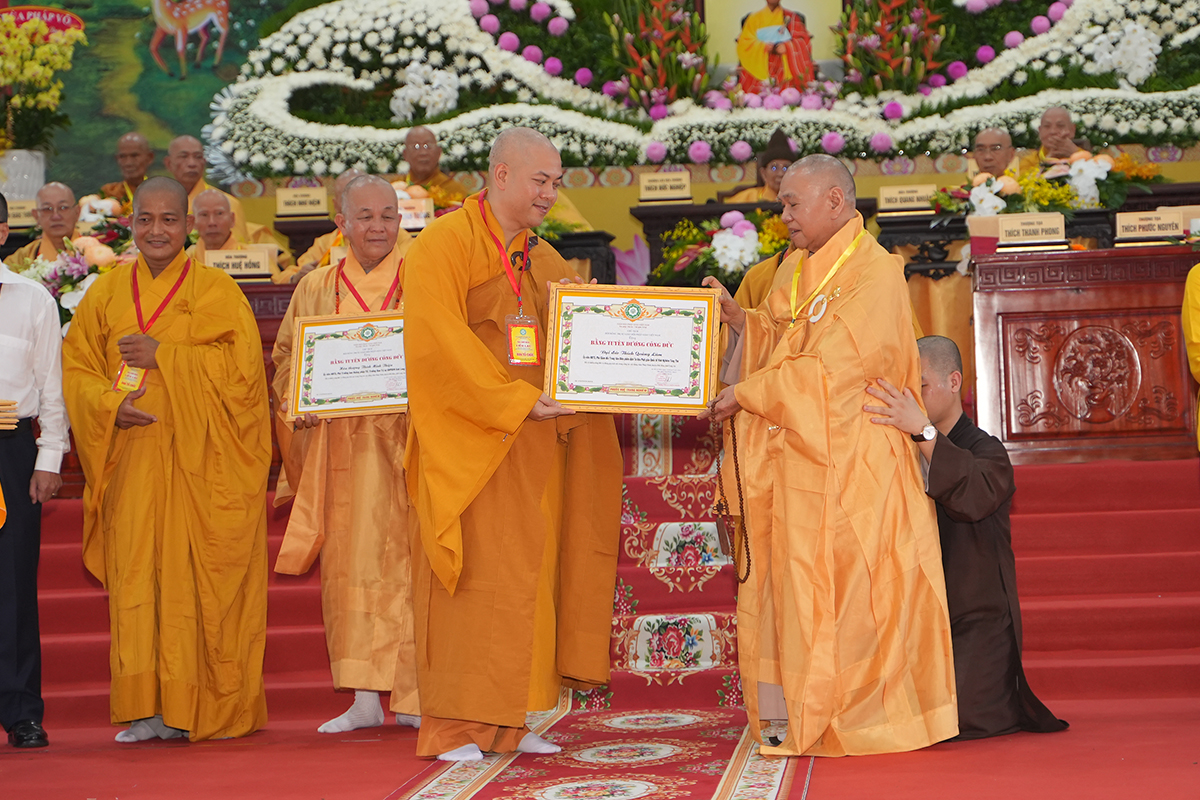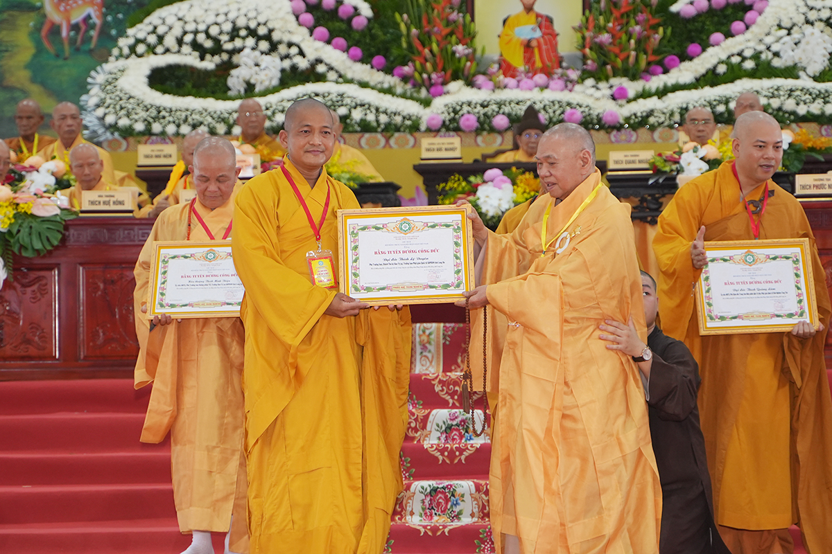 Thích Phước Nguyên tuyên đọc Quyết định tuyên dương công đức của Ban Thường Trực HĐTS cho 14 cá nhân và tập thể.